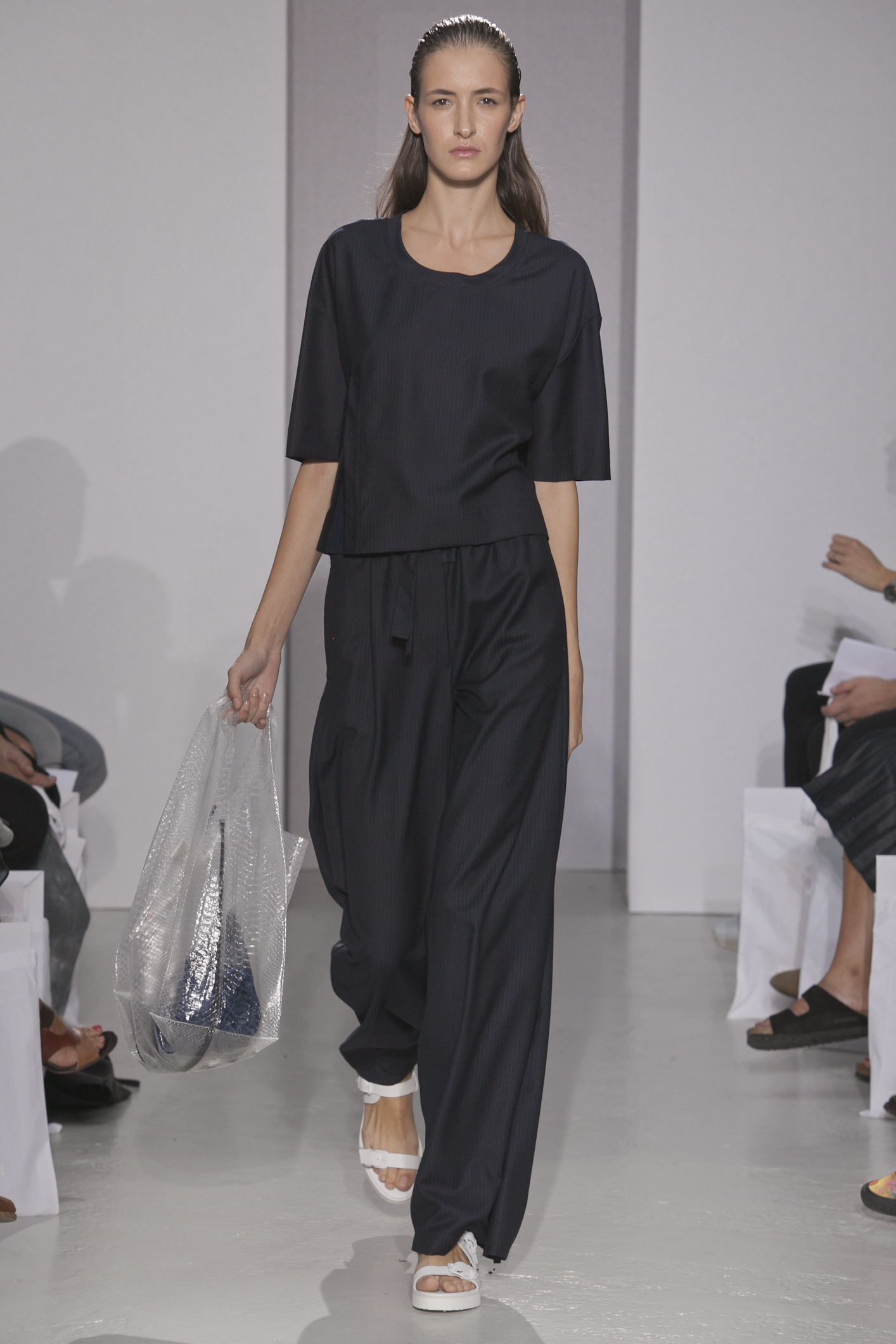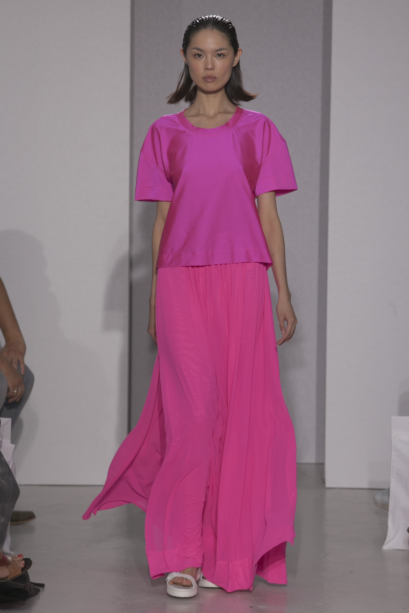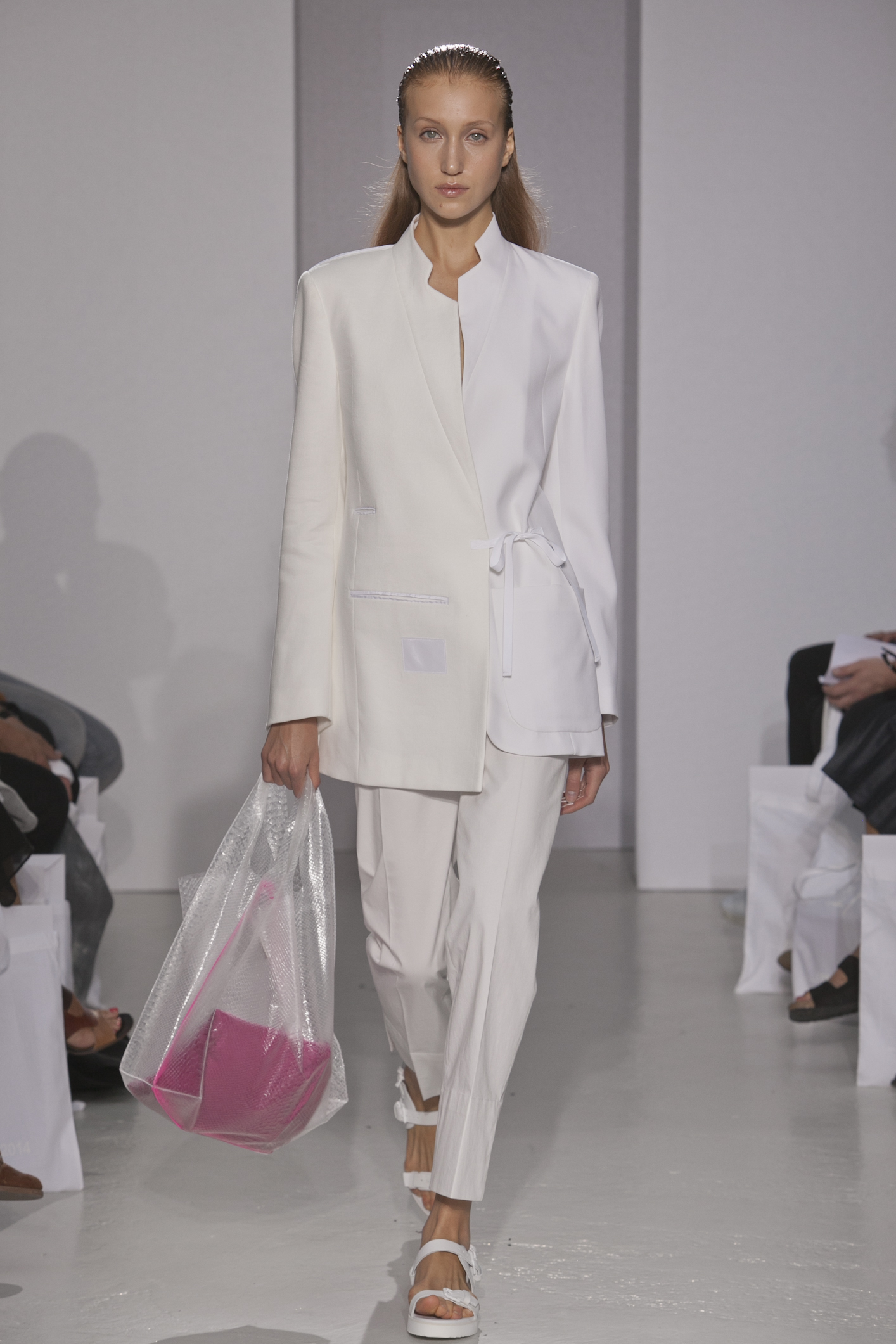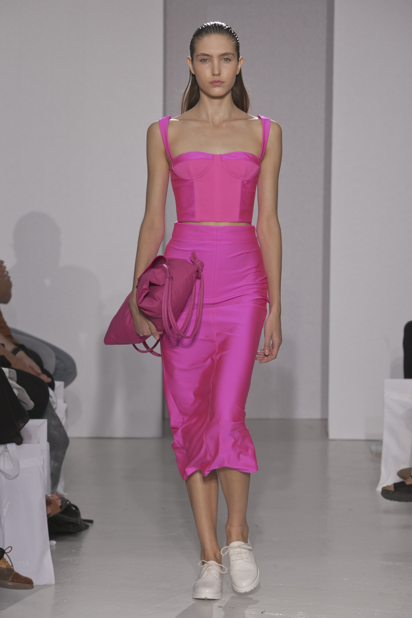 La silueta es relajada, escotes redondeados, pantalones rasgados y sandalias planas con hebillas y trench livianos. El color rosa llamativo pone de manifiesto una serie atrevida y femenina, en lana liviana como una camisa de vestir y vaporosa enmarcando el busto por un sujetador balconette cuadrado. Jardineros y vestidos de cóctel siguen la creación de una serie de bustiers en popelina. Un toque perverso, el uneclutch con cable y una falda amplia en PVC print pitón extiende el discurso de las texturas inquietantes.