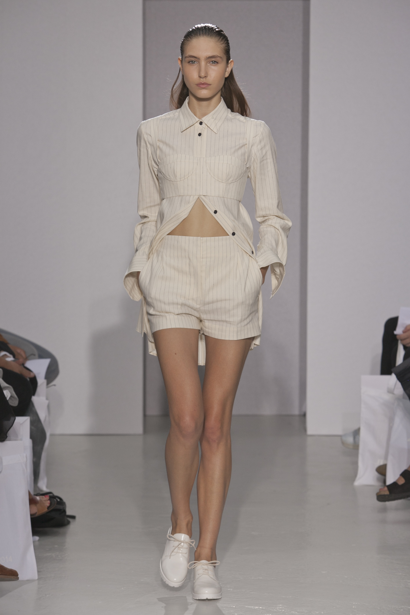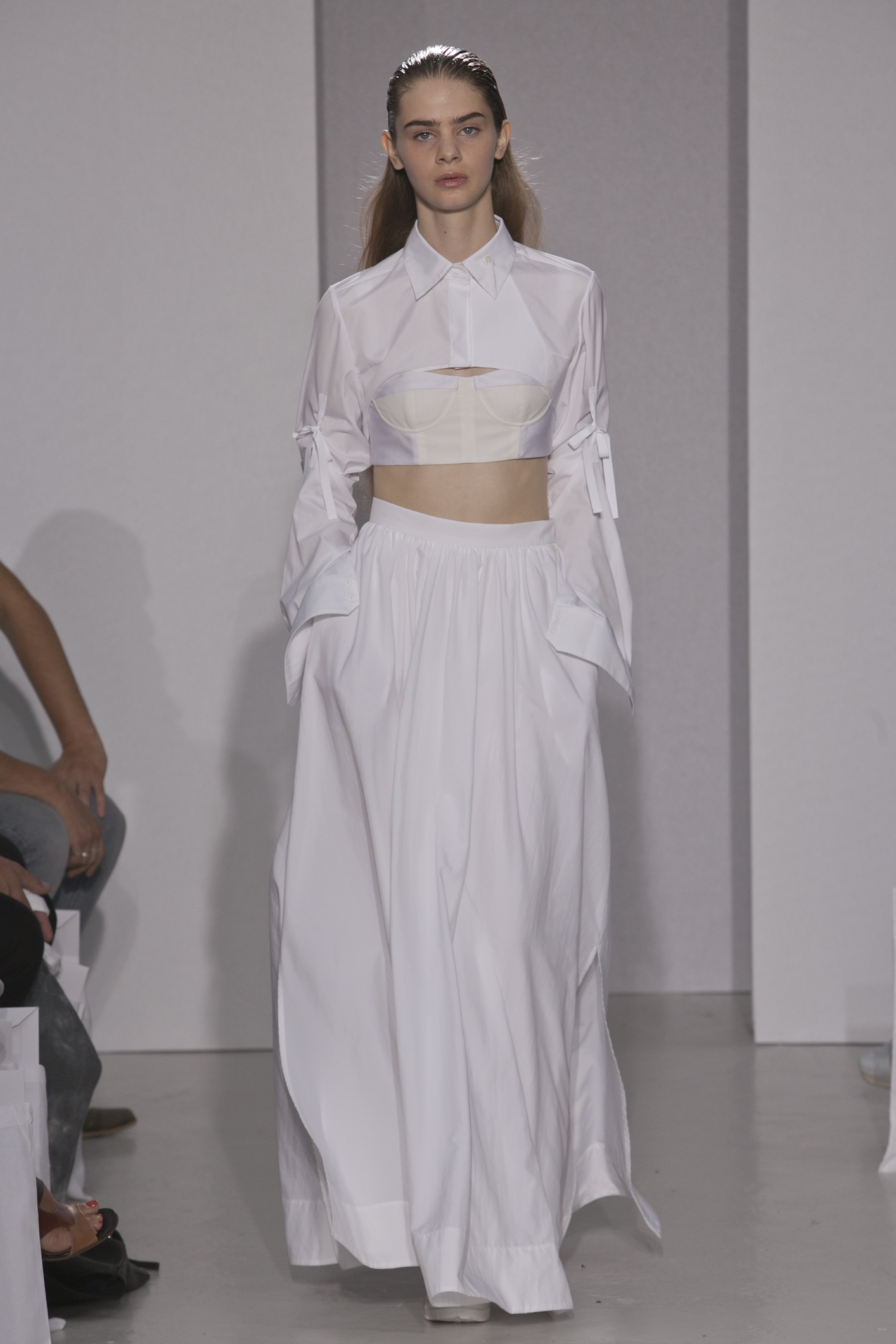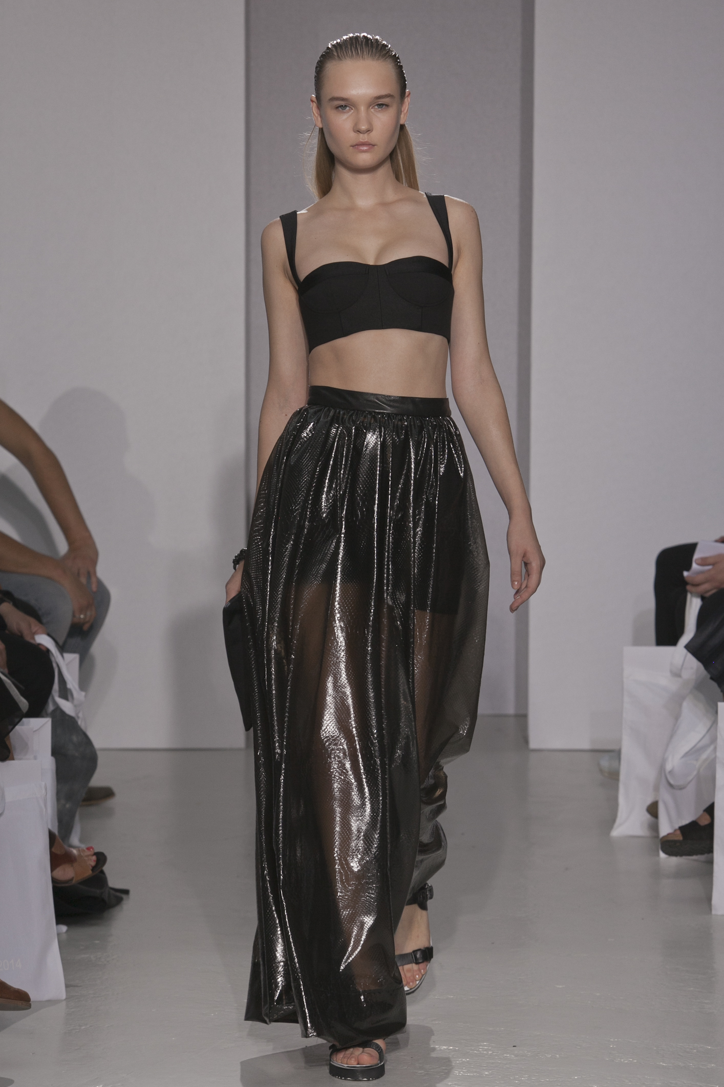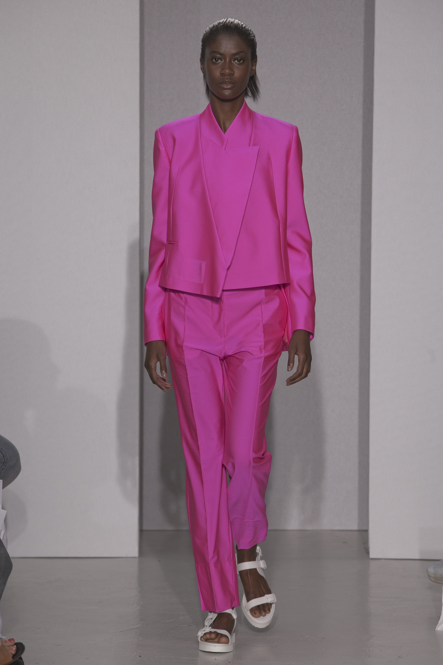 La silueta es relajada, escotes redondeados, pantalones rasgados y sandalias planas con hebillas y trench livianos. El color rosa llamativo pone de manifiesto una serie atrevida y femenina, en lana liviana como una camisa de vestir y vaporosa enmarcando el busto por un sujetador balconette cuadrado. Jardineros y vestidos de cóctel siguen la creación de una serie de bustiers en popelina. Un toque perverso, el uneclutch con cable y una falda amplia en PVC print pitón extiende el discurso de las texturas inquietantes.