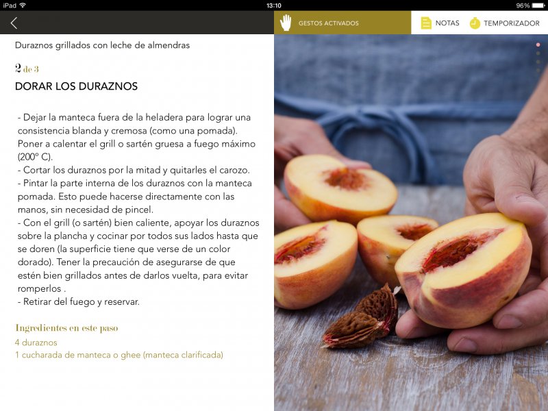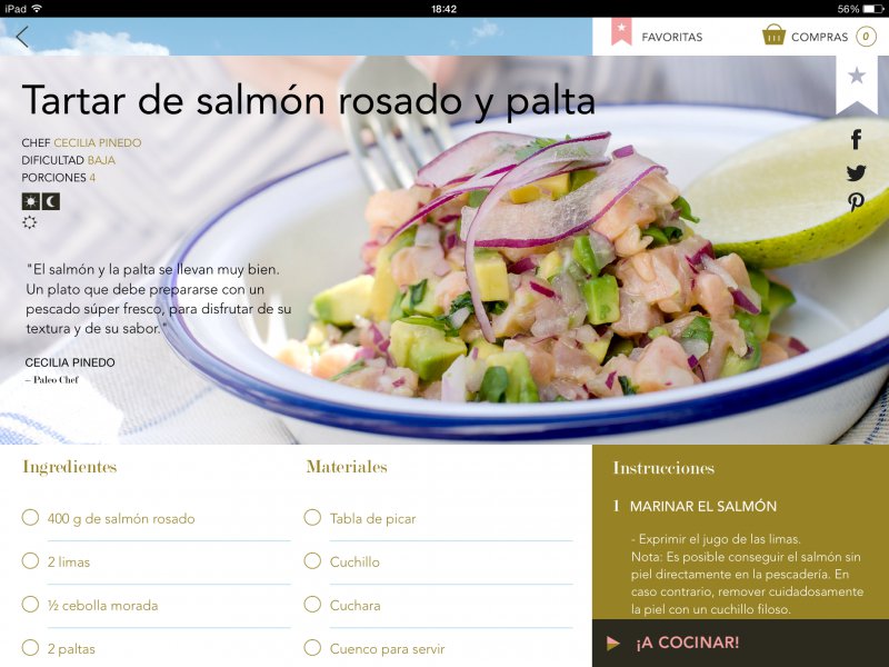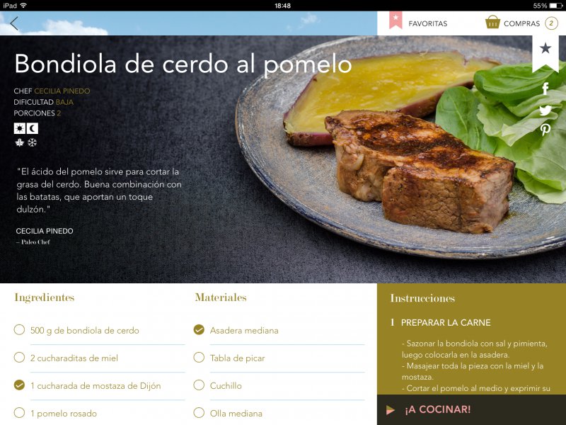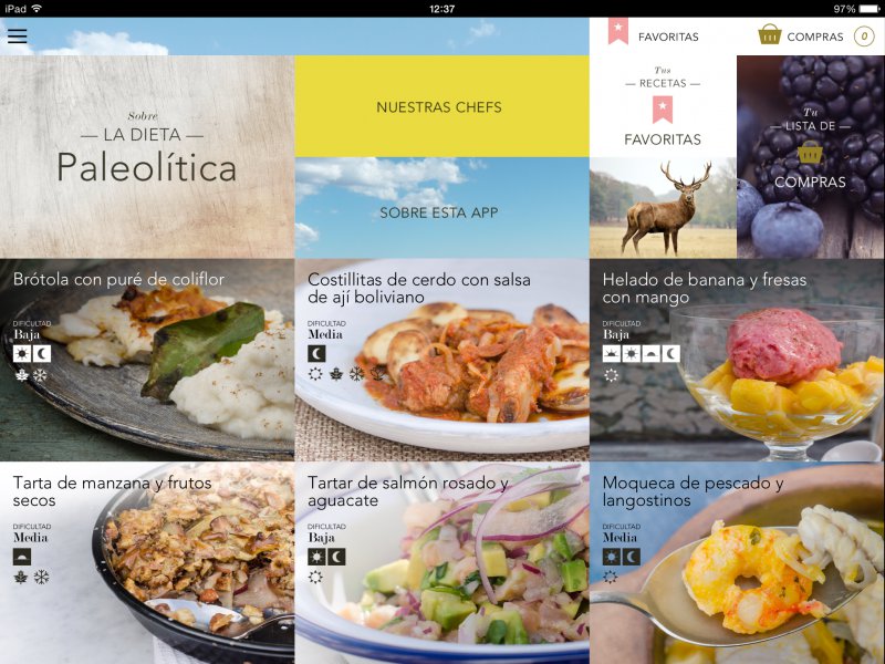 El otro tema es poder darle variedad a los platos, cuando después de pasado un tiempo se empieza a volver rutinario y aburrido el bife con ensalada. Para esto les recomiendo navegar por la web que hay varios sitios con muy buenas recetas, como PaleOMG, o bajarse la aplicación Cocina Paleo (de Ninja Máquina, a USD1,99 en iTunes), que viene con propuestas creadas por las chefs Jimena Ramirez, Cecilia Pinedo y Diana Abreu. Trae fotos, una sección donde podés armar tu lista para no olvidarte de nada cuando vas al supermercado, y 30 recetas divididas por momentos del día (desayuno, almuerzo, merienda y cena) o por estación. ¡Sus hamburguesas de cordero con menta son espectaculares!