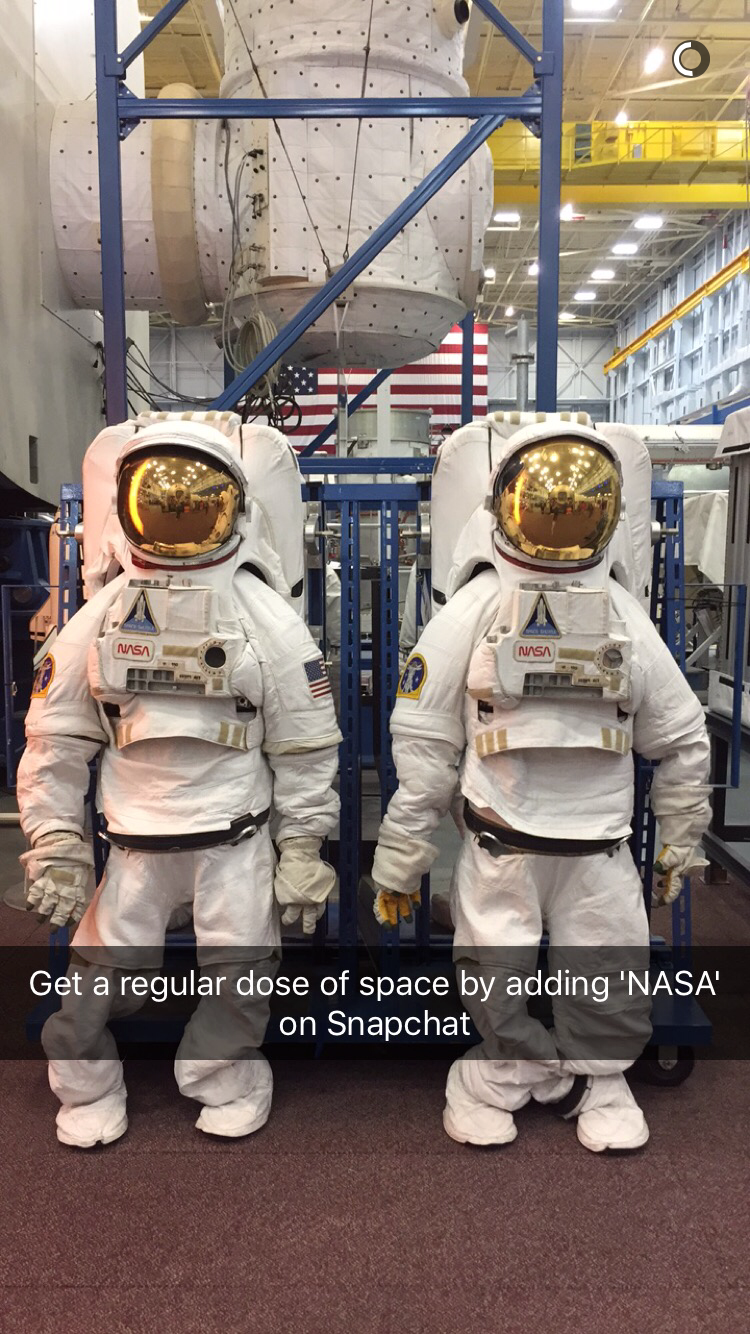 La Administración Nacional de la Aeronáutica y del Espacio, o simplemente NASA, sigue con su gran manejo de redes sociales con la cuenta de Snapchat más cósmica de todas, mostrándonos el trabajo que realizan día a día, enseñando sobre cuerpos celestiales, la galaxia y sus cohetes, y mostrando la vida diaria de los astronautas en la Estación Espacial Internacional.