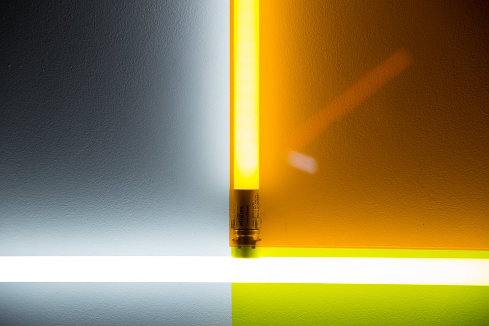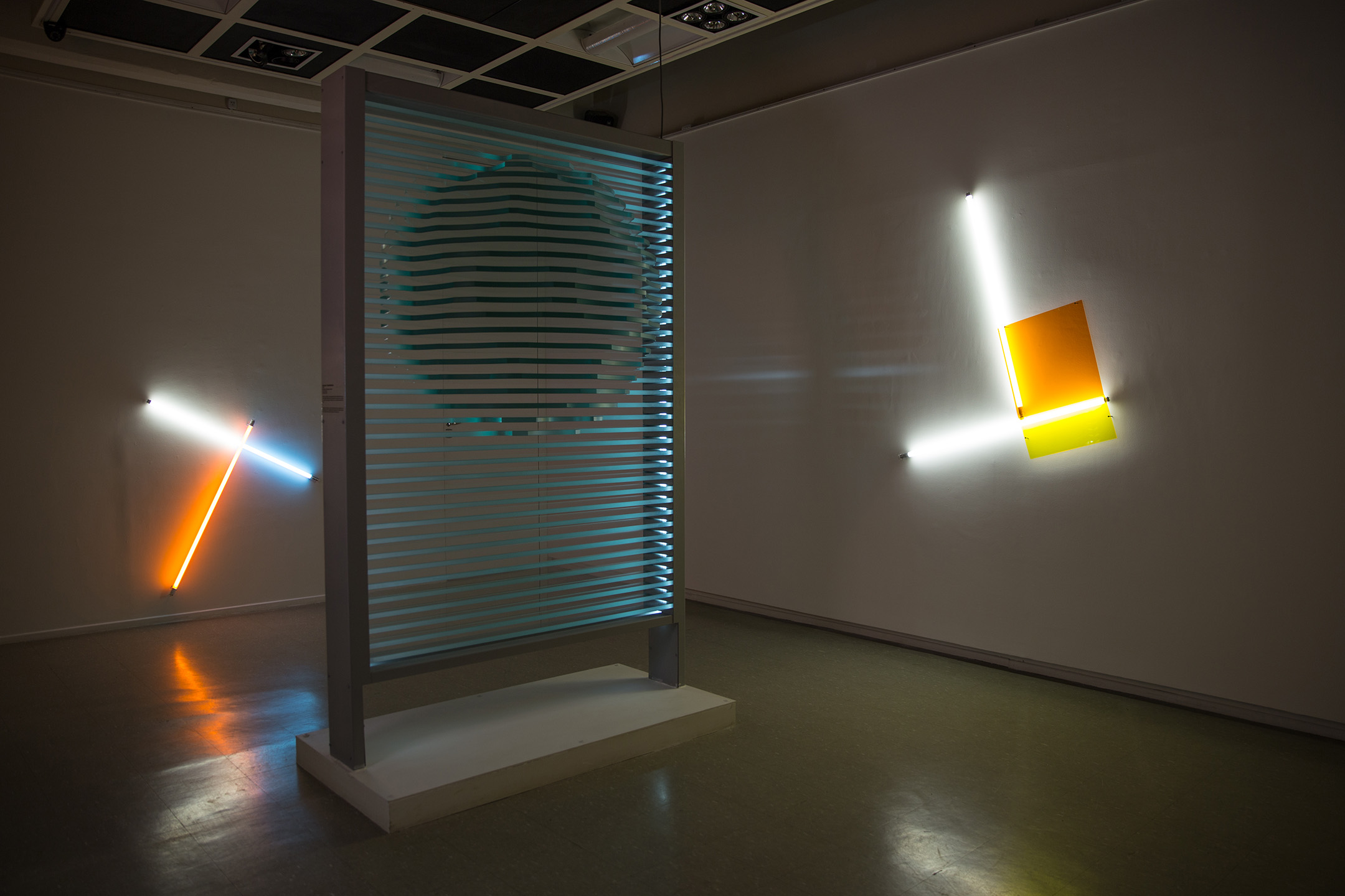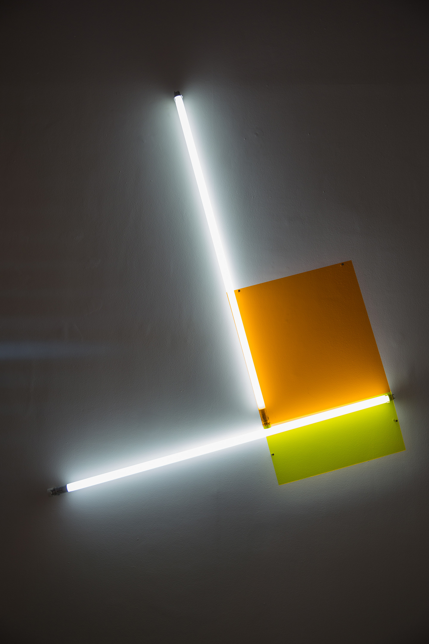 La muestra consta de 3 obras (que llamo Pinturas) en la sala y una instalación lumínica de tubos led naranjas. Para mi son la forma que tengo de ver el mundo, yo veo así las cosas, pienso en las sensaciones que provoca la luz en el espacio y entre si.