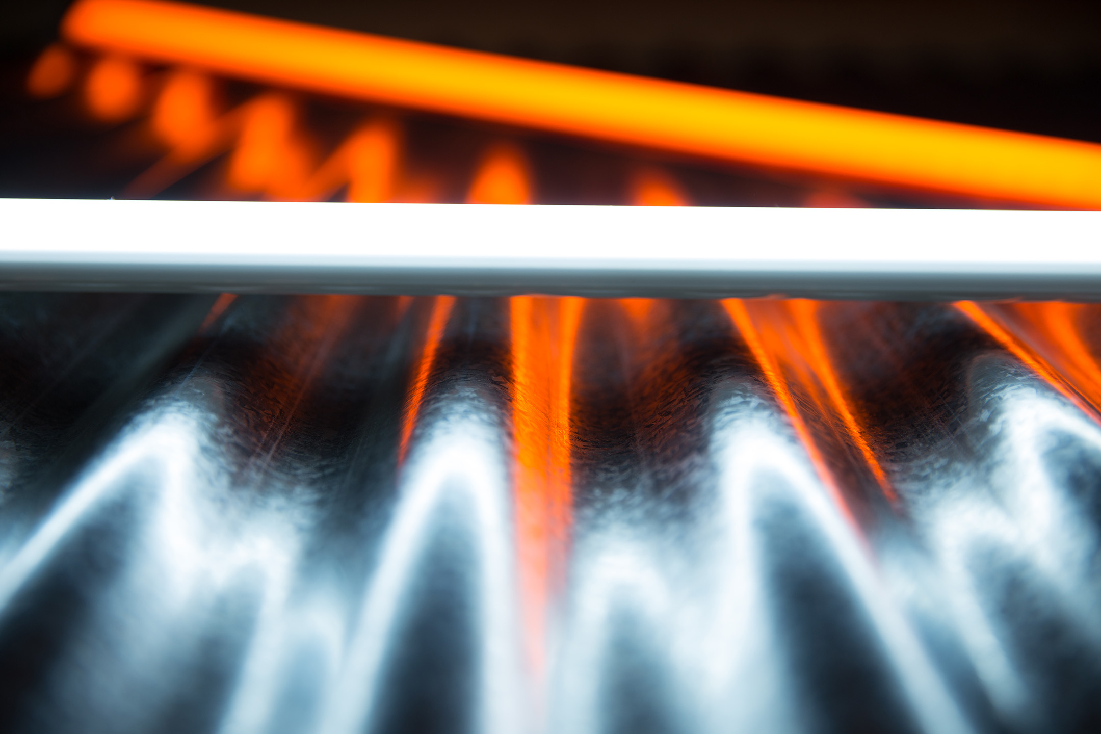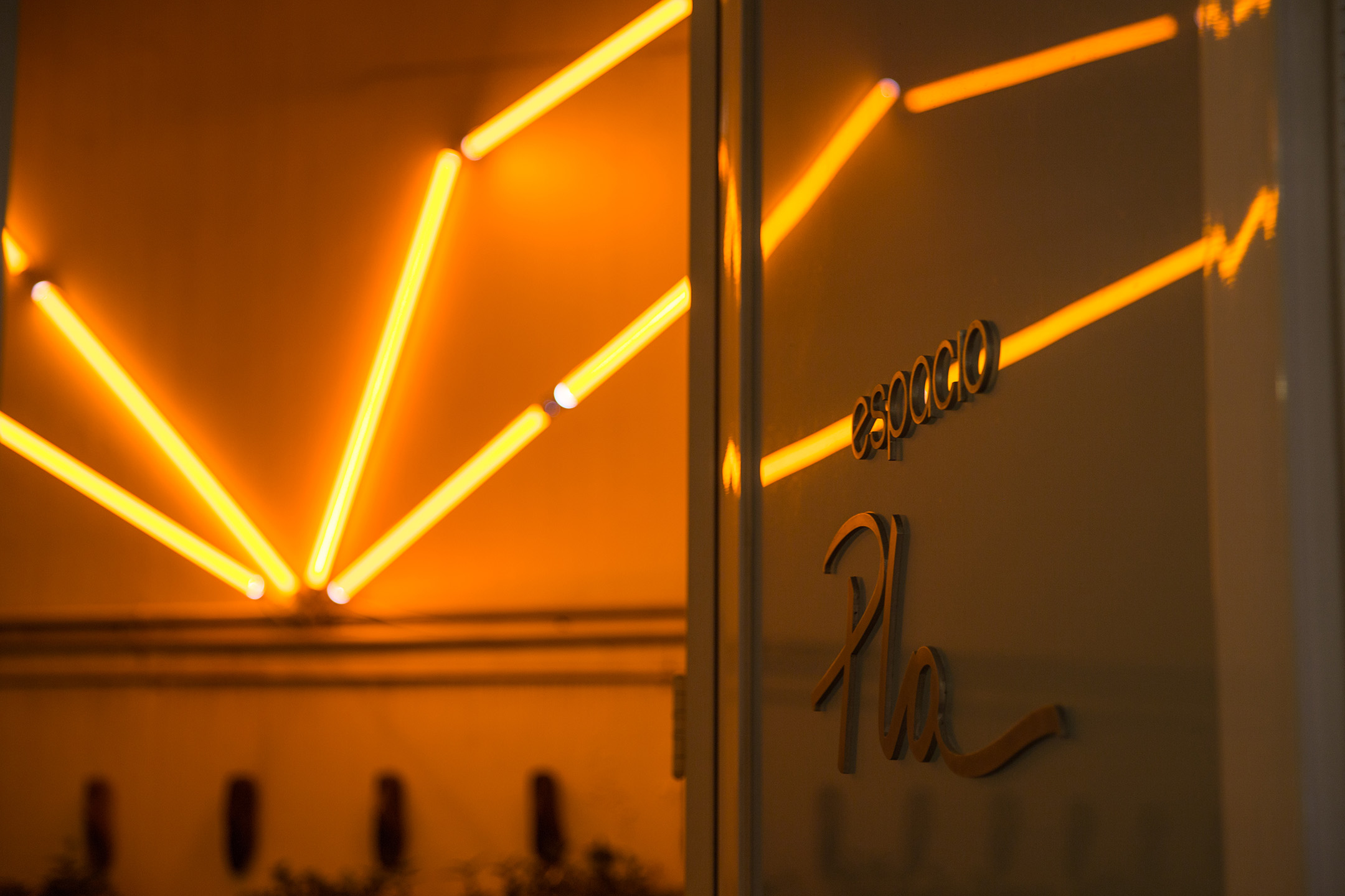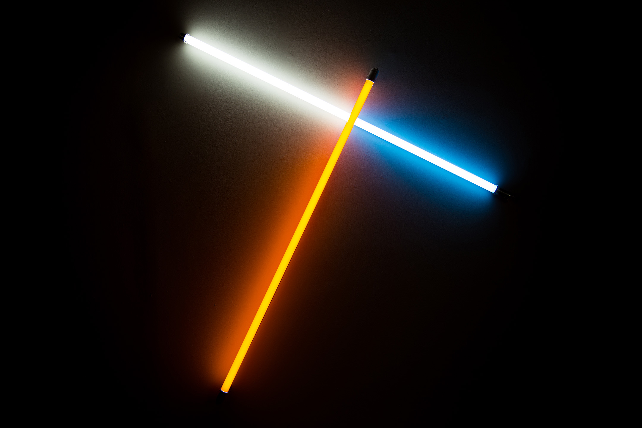 La muestra consta de 3 obras (que llamo Pinturas) en la sala y una instalación lumínica de tubos led naranjas. Para mi son la forma que tengo de ver el mundo, yo veo así las cosas, pienso en las sensaciones que provoca la luz en el espacio y entre si.