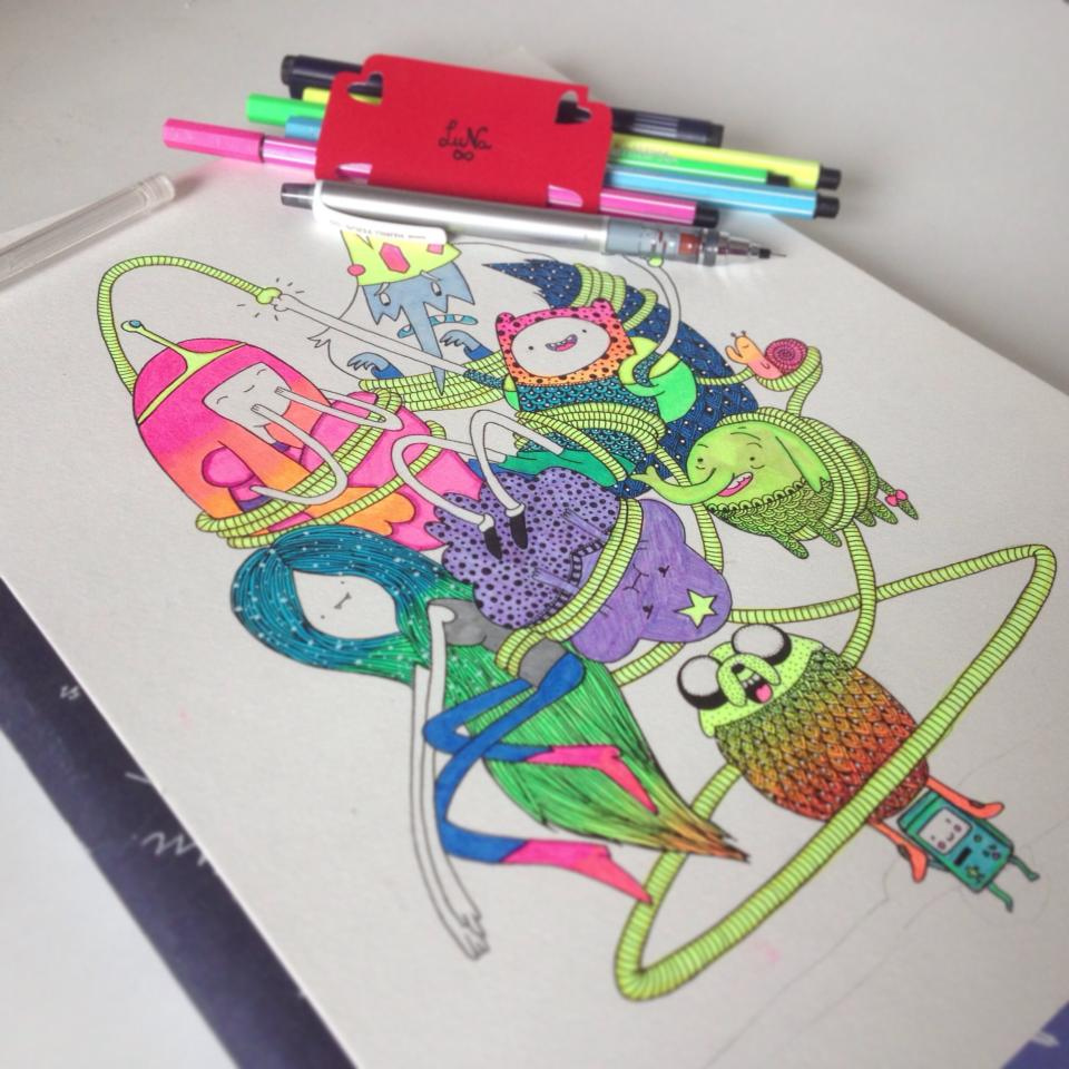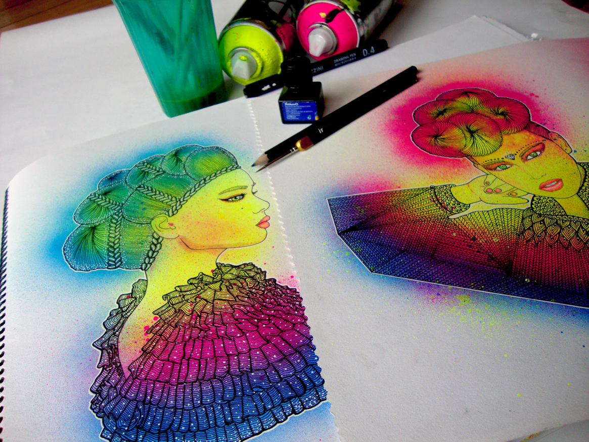 La mayoría de las veces es a mano. A veces termino dibujos en Photoshop, pero sólo retoco algunos valores o le agrego un fondo al dibujo. Básicamente, casi todos son totalmente manuales.