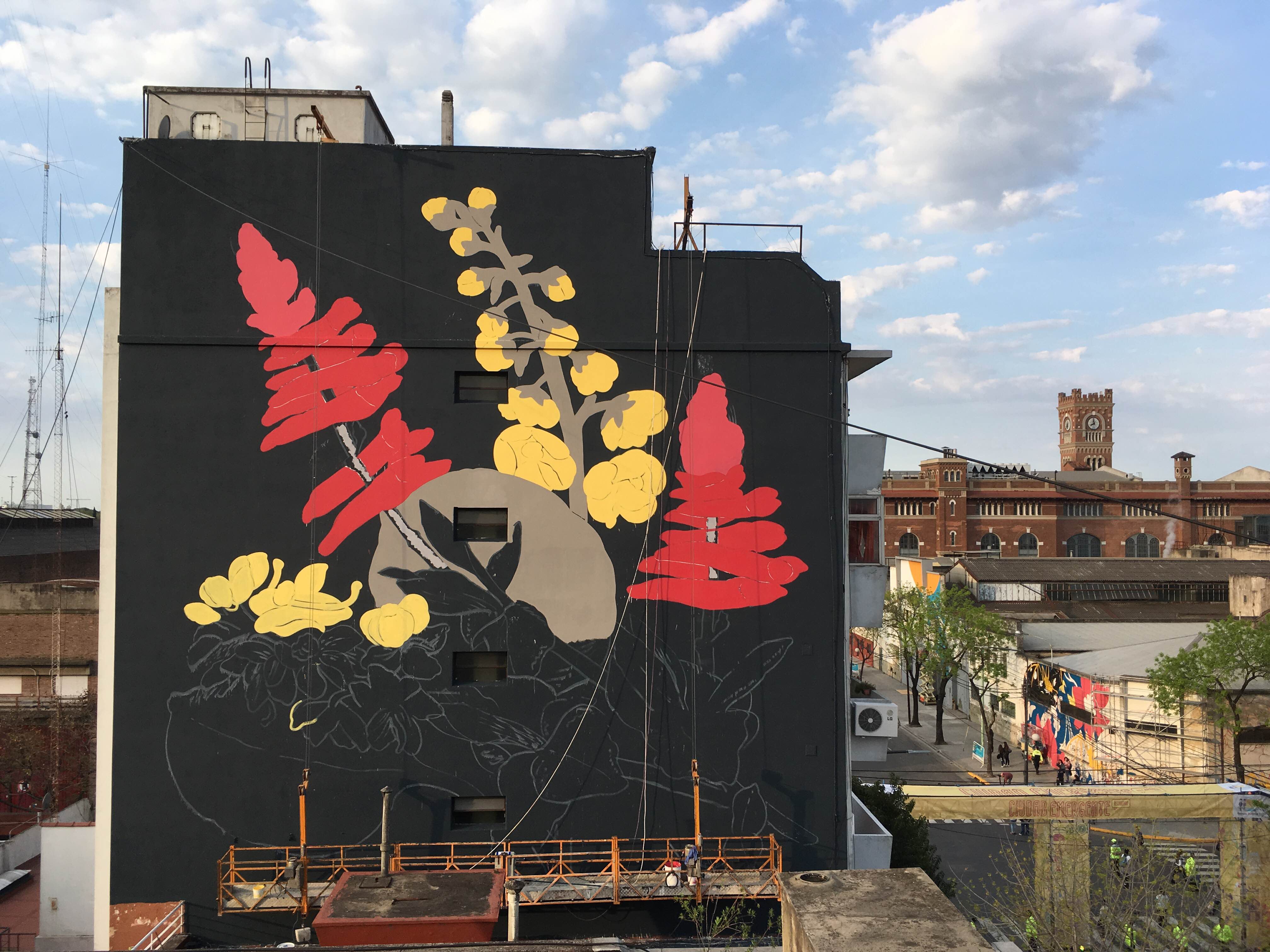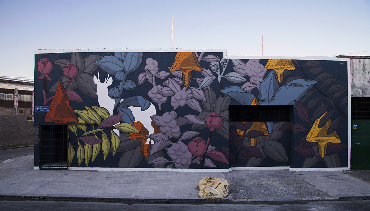 Mis lecturas las hago sobre la pared y sobre su entorno. La pintura se ve determinada por la información que te rodea y cómo la traducís. Y esta es una de las principales diferencias – y virtudes –  del mural con respecto a la tela o trabajos de estudio. Hay una base de datos que se encuentra permanentemente activa y lo que hace interesante al mural es el diálogo con ella. Internamente, hago una analogía: pienso el espacio a trabajar como una comida y a la pintura como la sal. Si le ponés muy poca, queda insulsa; pero si salás demasiado no sirve. Es una ecuación que pone en juego el desafío de dar con la cantidad justa.