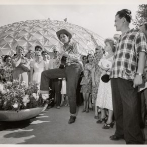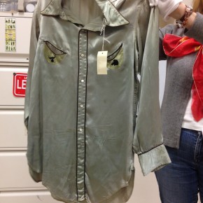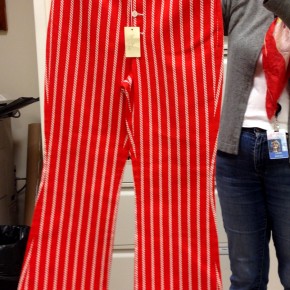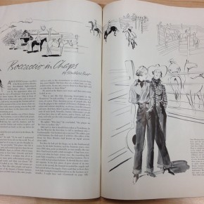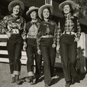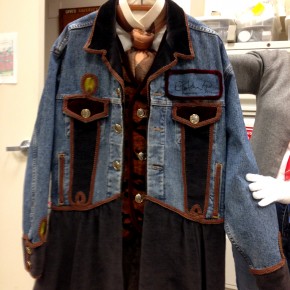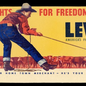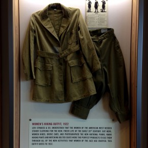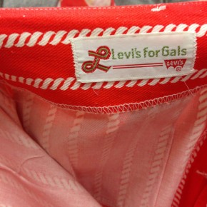 Le sigue una caja con una muy deteriorada campera de jean, que fue encontrada en pésimas condiciones y restaurada por el equipo de la marca, una camisa de rodeo en satén verde agua y los primeros jeans Lady Levi’s creados para la mujer, hace ya 80 años, cuando reemplazar las faldas por pantalones en público era solamente aceptable a la hora vacacionar en los ranchos del oeste americano. Una Vogue ilustrada de 1935 los acompaña, con el primer visionario artículo sobre una nueva tendencia que nacía, un must-have en el guardarropas de toda chica americana.