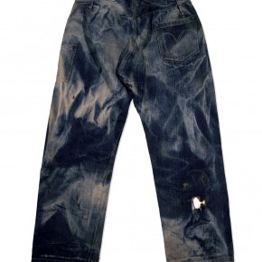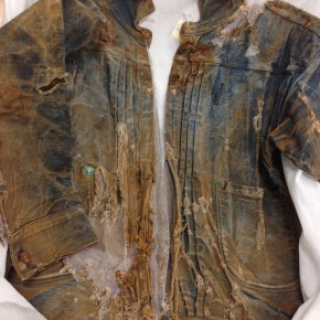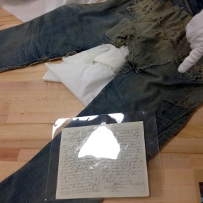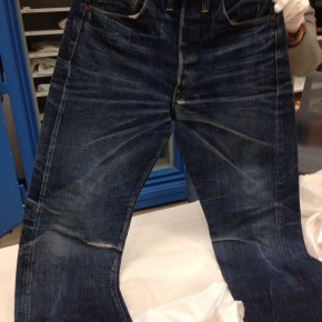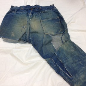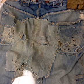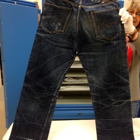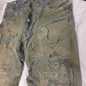 Las dos joyas de la corona del archivo son las primeras en salir de la bóveda. Dos jeans con casi 135 años de antigüedad se descubren entre paños de tela blanca, absolutamente impecables, tanto que, salvo por alguna rotura y el hecho de que al segundo par le falta una pierna (cortarlos era una práctica común entre los mineros, que usaban el género para emparchar sus nuevos pantalones) los dos pares de 501 parecen listos para usar. Traen un solo bolsillo en la parte trasera, ya que el doble bolsillo recién se incorporaría en 1901, bordado con la inconfundible doble costura curva de hilo, los patentados ribetes de cobre y una fortaleza y resistencia sorprendentes, logrando explicar por sí mismos cómo es que los 501 se conviertieron en la prenda más vendida de la historia.