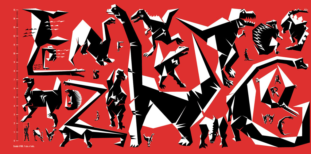 “El estilo es como un cubismo o futurismo digital de trazos rectos. Muy sintético en cuanto a forma y color, que para mí va más directo al concepto”, cuenta el autor. En cuanto a las razones de su elección temática, él mismo se reconoce como un fanático de los dinosaurios y al decidirse a hacer un libro completo (textos, ilustraciones y diseño) por sí mismo, sintió que el tema obligado debían ser los “lagartos terribles”.