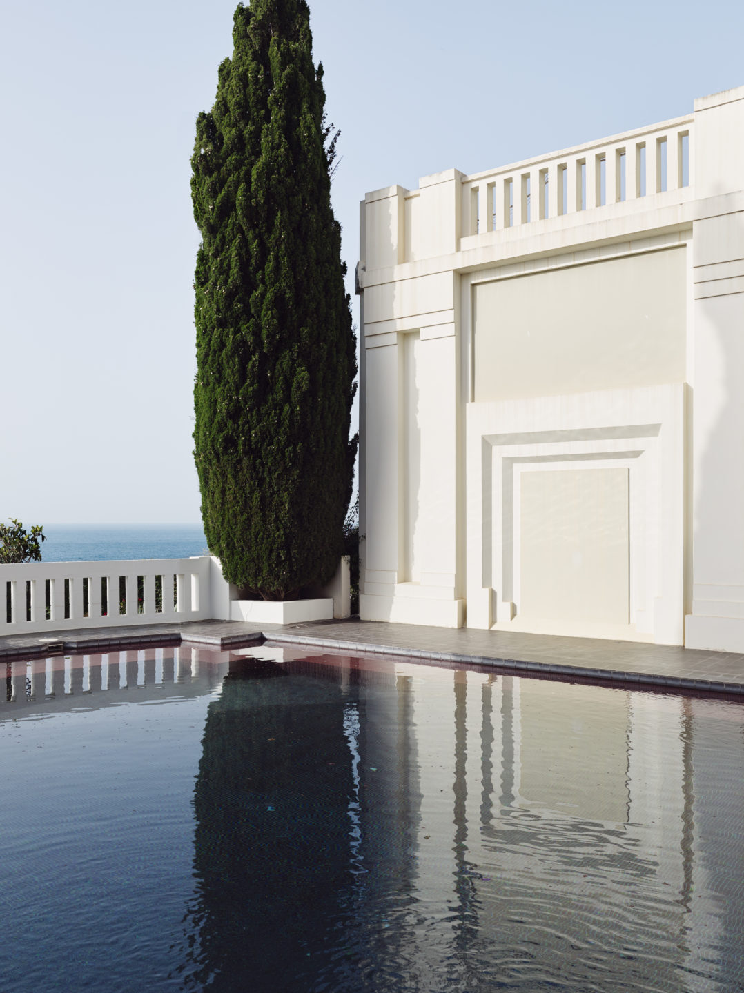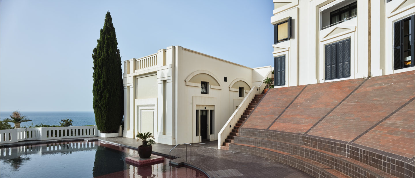 La piscina, donde se desarrollan las actividades estivales, ocupa, como en la tradición del teatro griego, el lugar del escenario y se extiende hacia el acantilado enmarcando el paisaje.