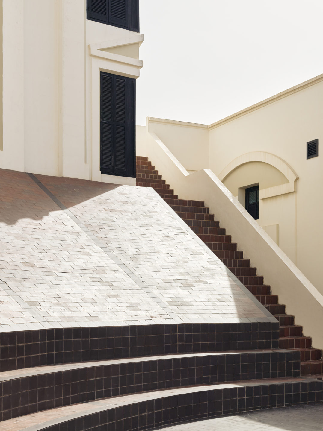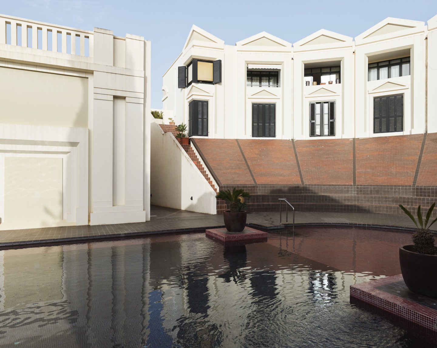 La diferencia de cota entre este edificio y la zona que rodea la piscina se resuelve por medio de una superficie inclinada convexa, representación del antiguo anfiteatro en su expresión espacial, que protege la orientación principal de los apartamentos de la circulación colectiva. Dos hileras de gradas continuas constituyen la conexión del plano inclinado con el suelo de roca de la plaza.
