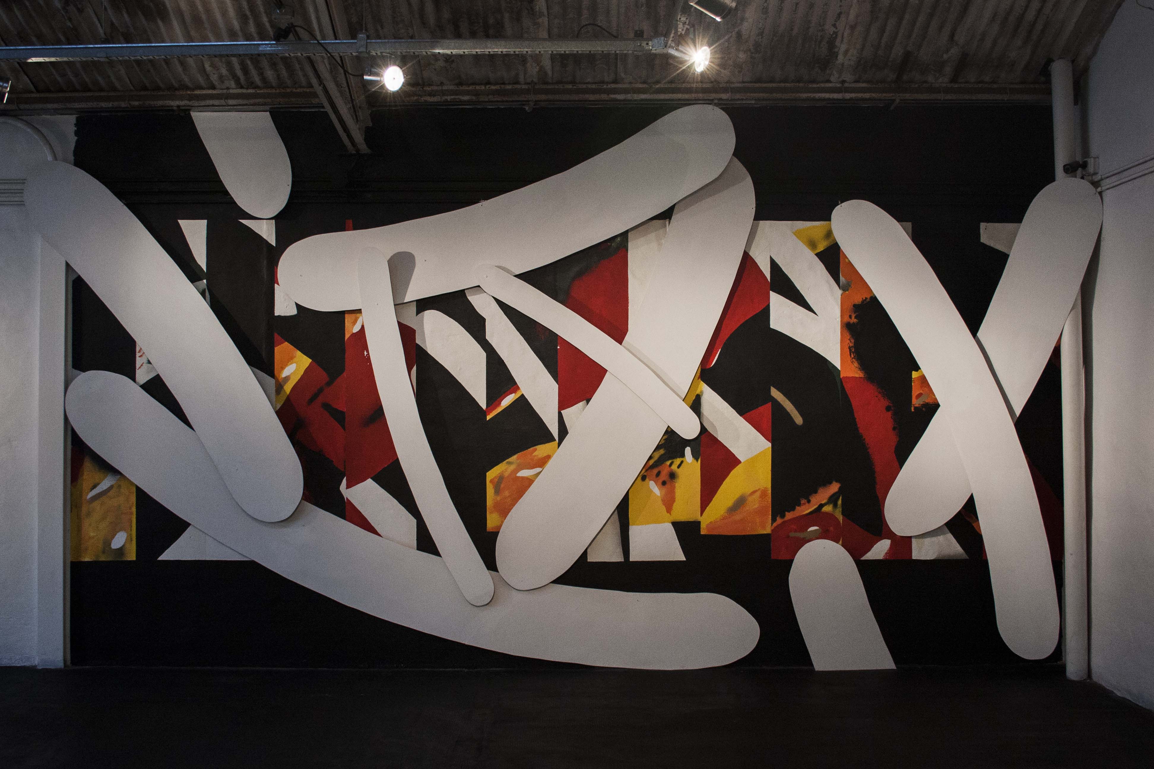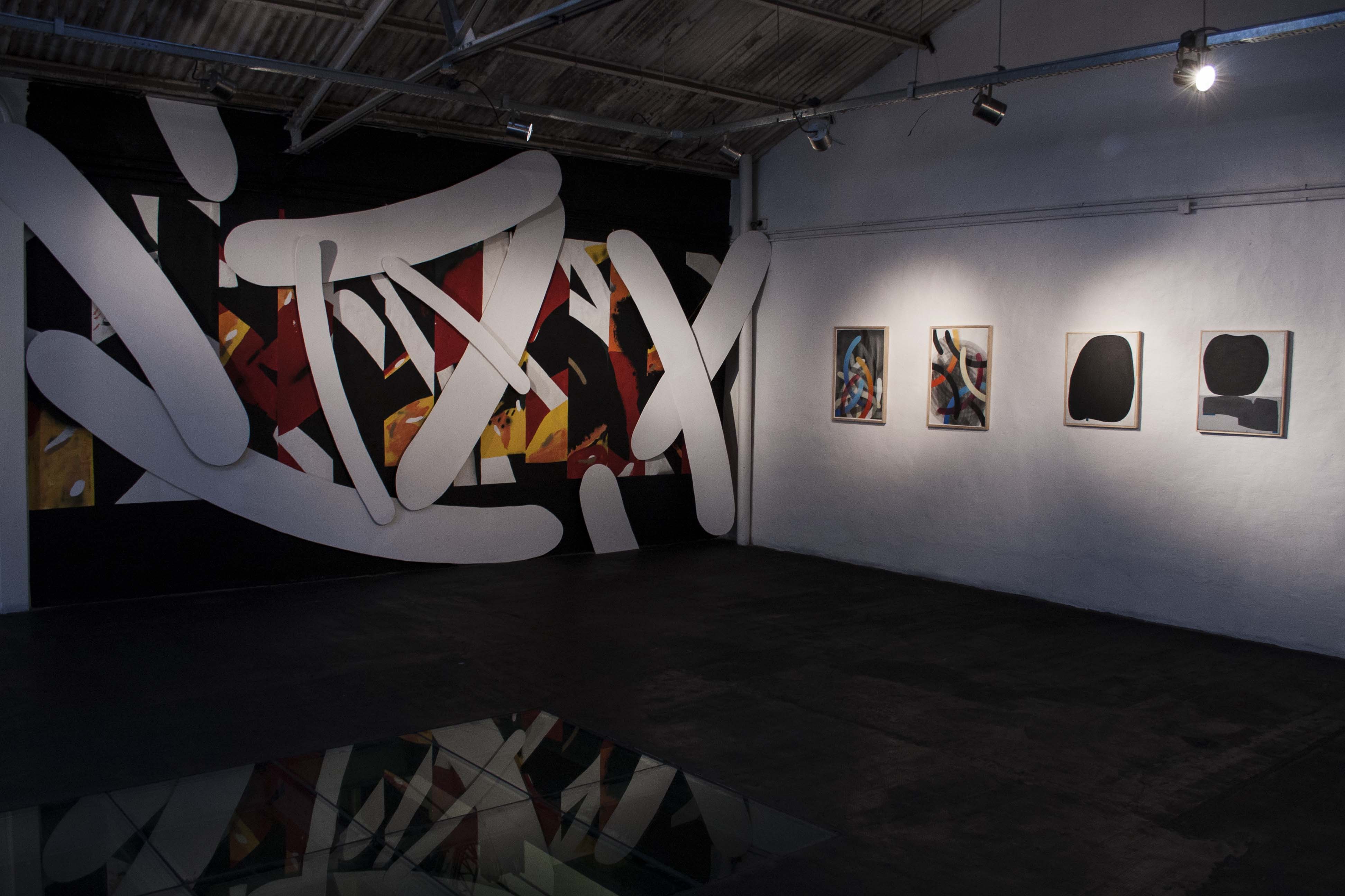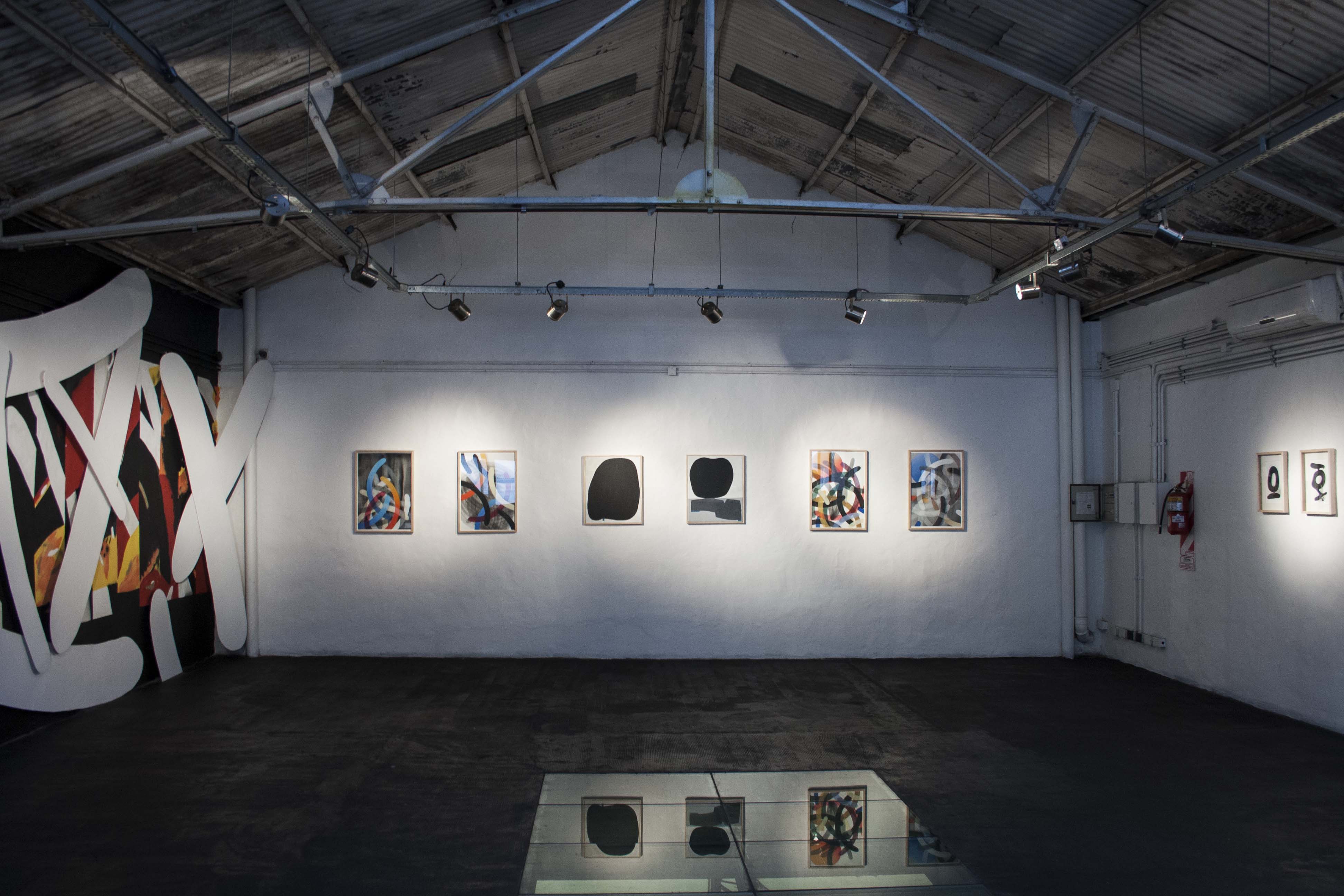 Las siluetas o manchas negras de 108 atrapan e invaden el espacio intervenido, como un órgano vivo que fue creciendo en la desolación del lugar. Mientras tanto, las composiciones geométricas de Moneyless provienen de los elementos más básicos de la existencia. Con distintas capas y efectos de transparencia, crean movimiento, tensión y profundidad.