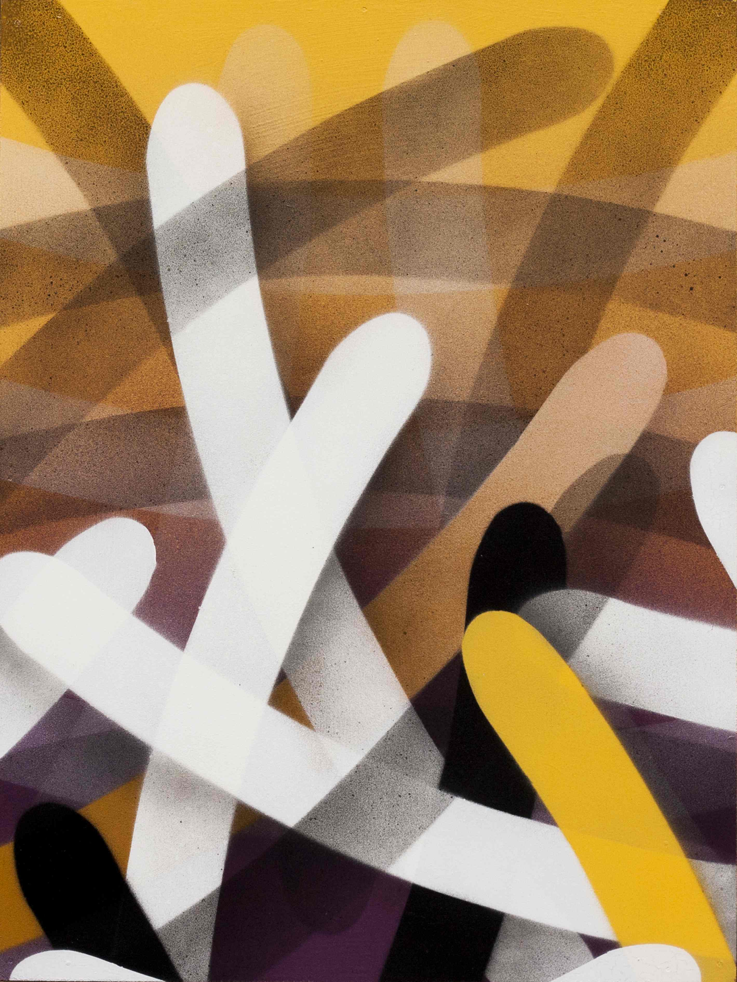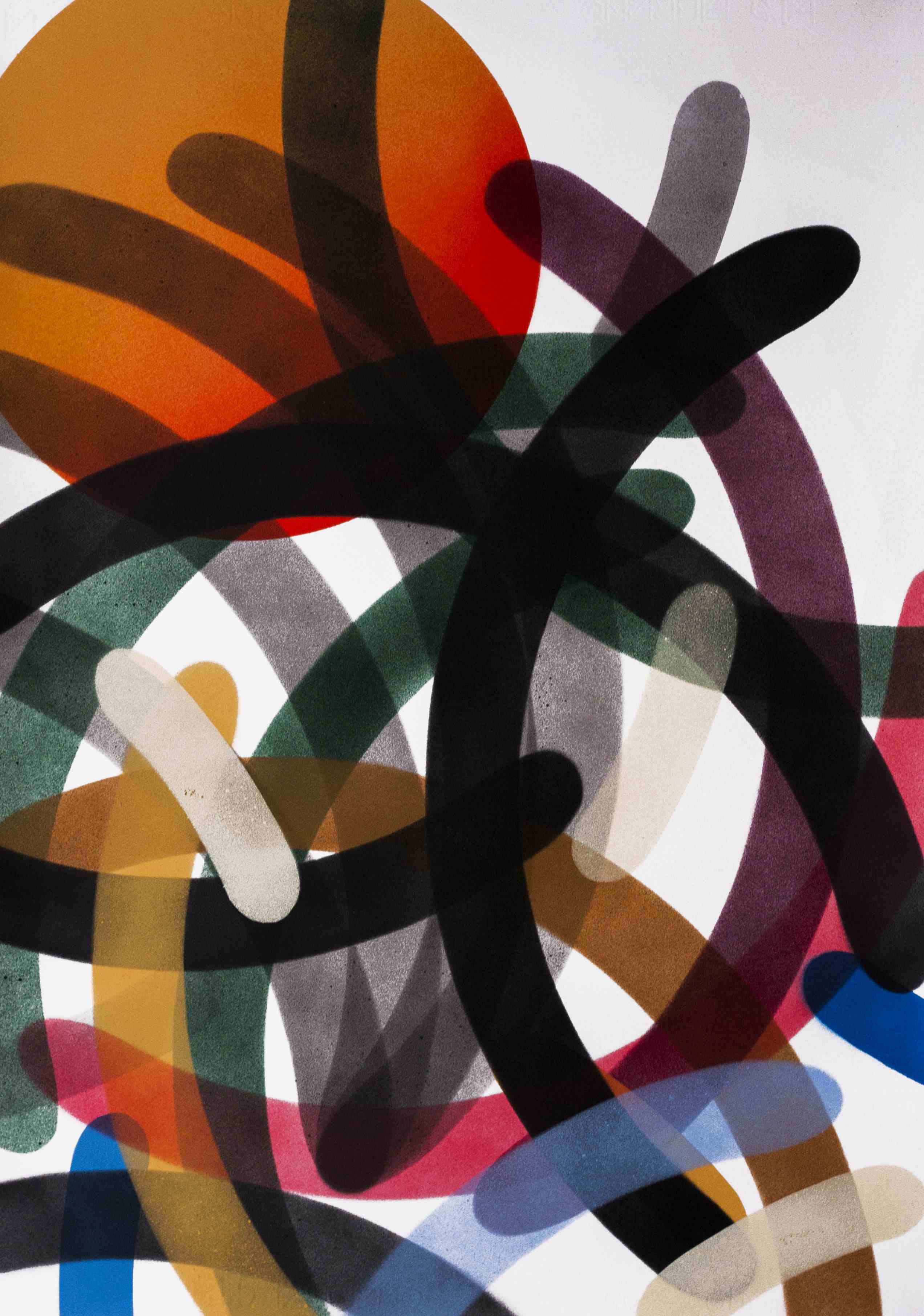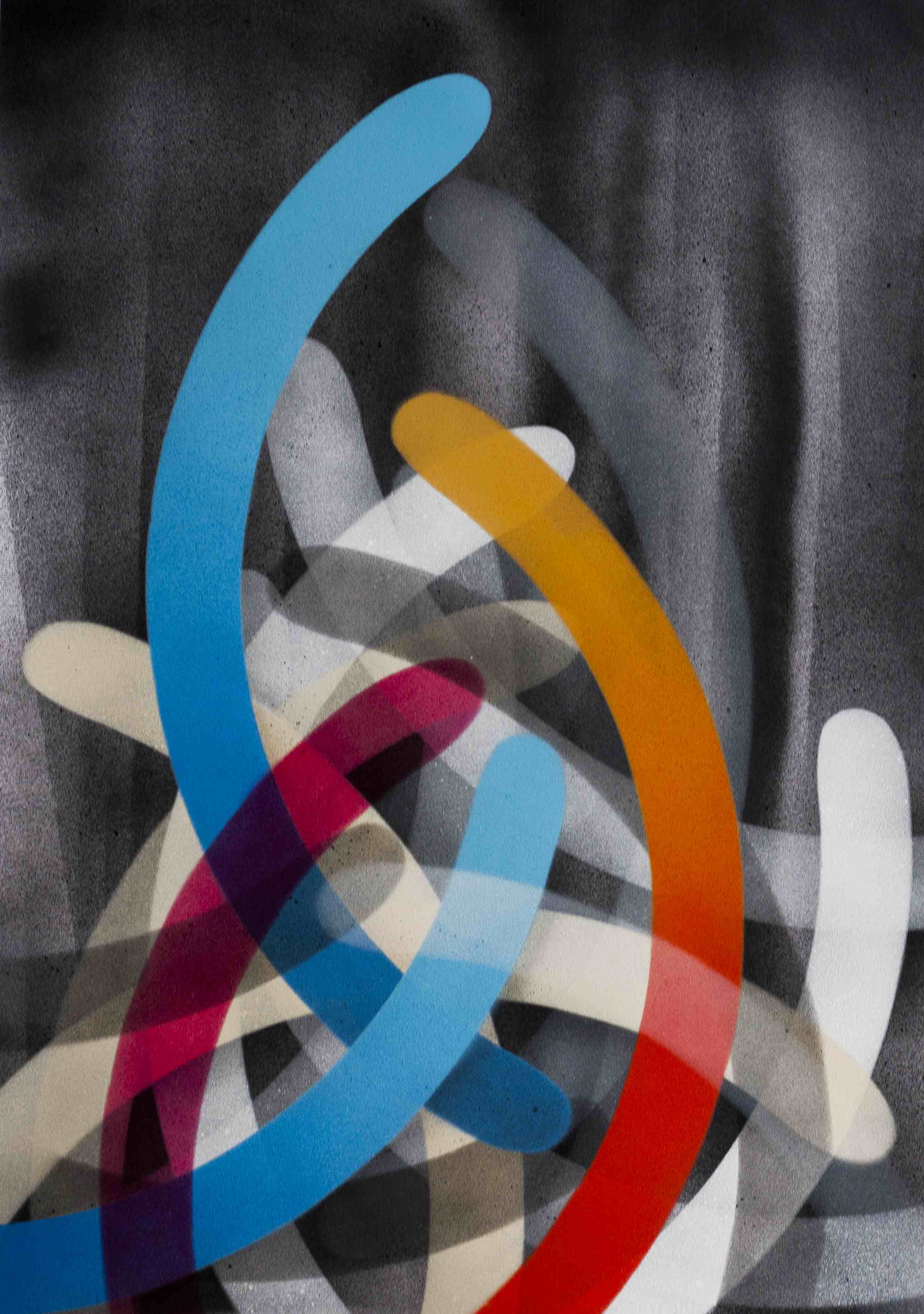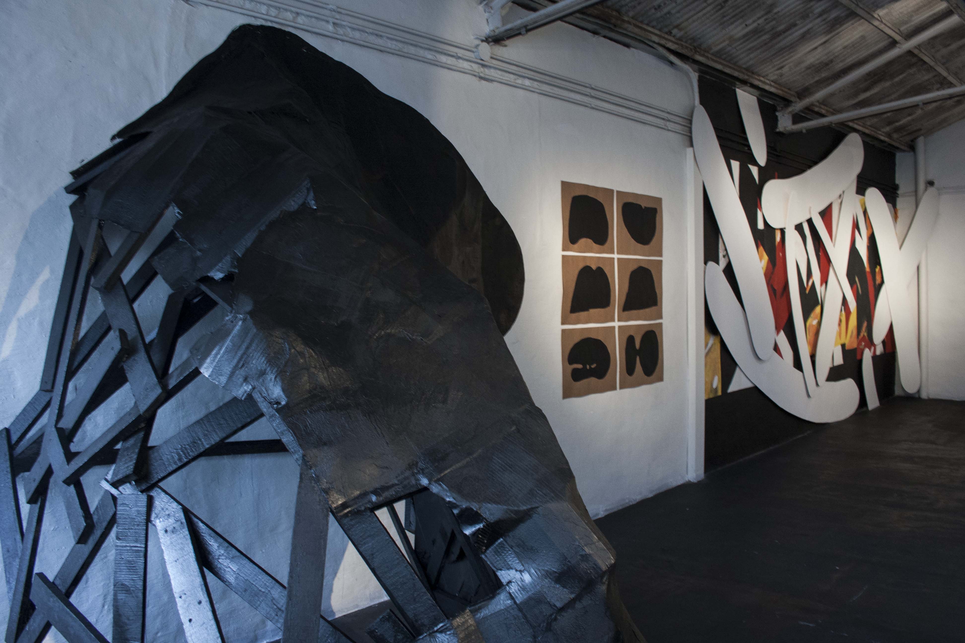 Las siluetas o manchas negras de 108 atrapan e invaden el espacio intervenido, como un órgano vivo que fue creciendo en la desolación del lugar. Mientras tanto, las composiciones geométricas de Moneyless provienen de los elementos más básicos de la existencia. Con distintas capas y efectos de transparencia, crean movimiento, tensión y profundidad.