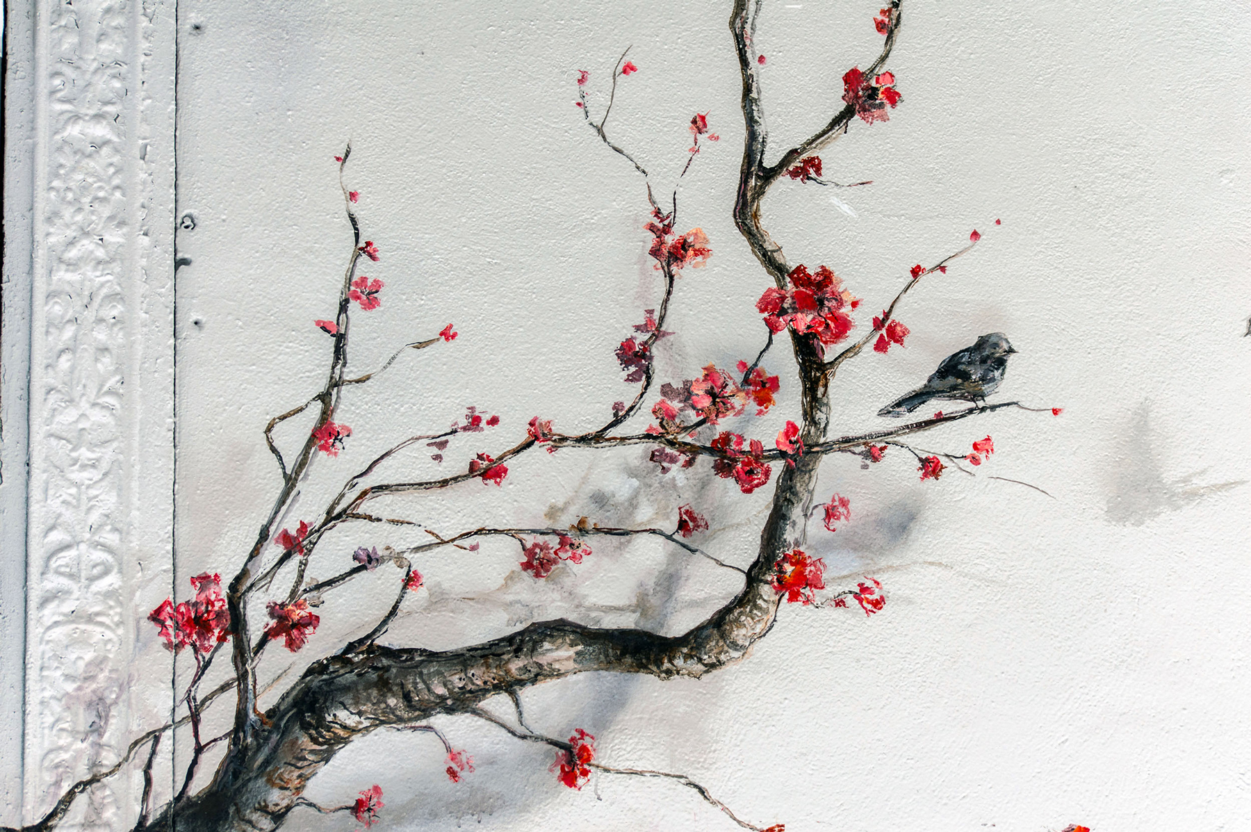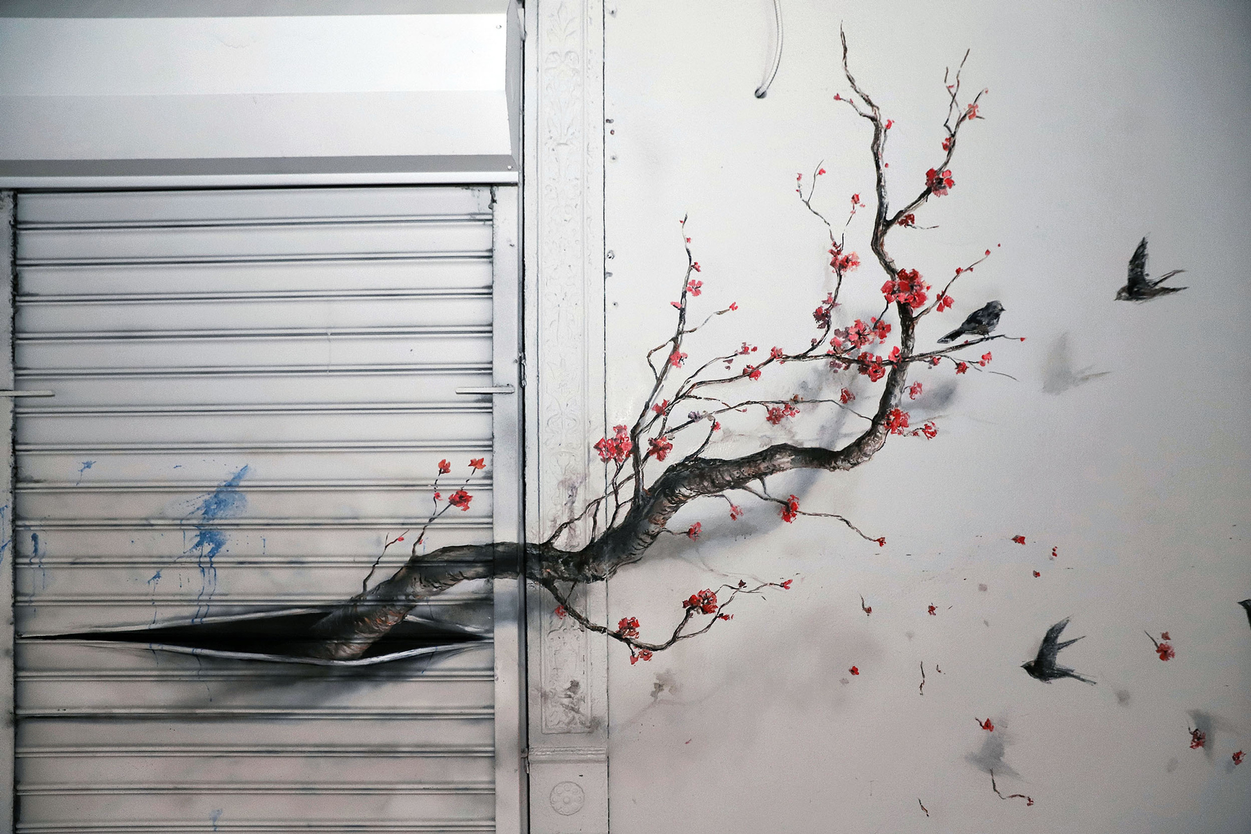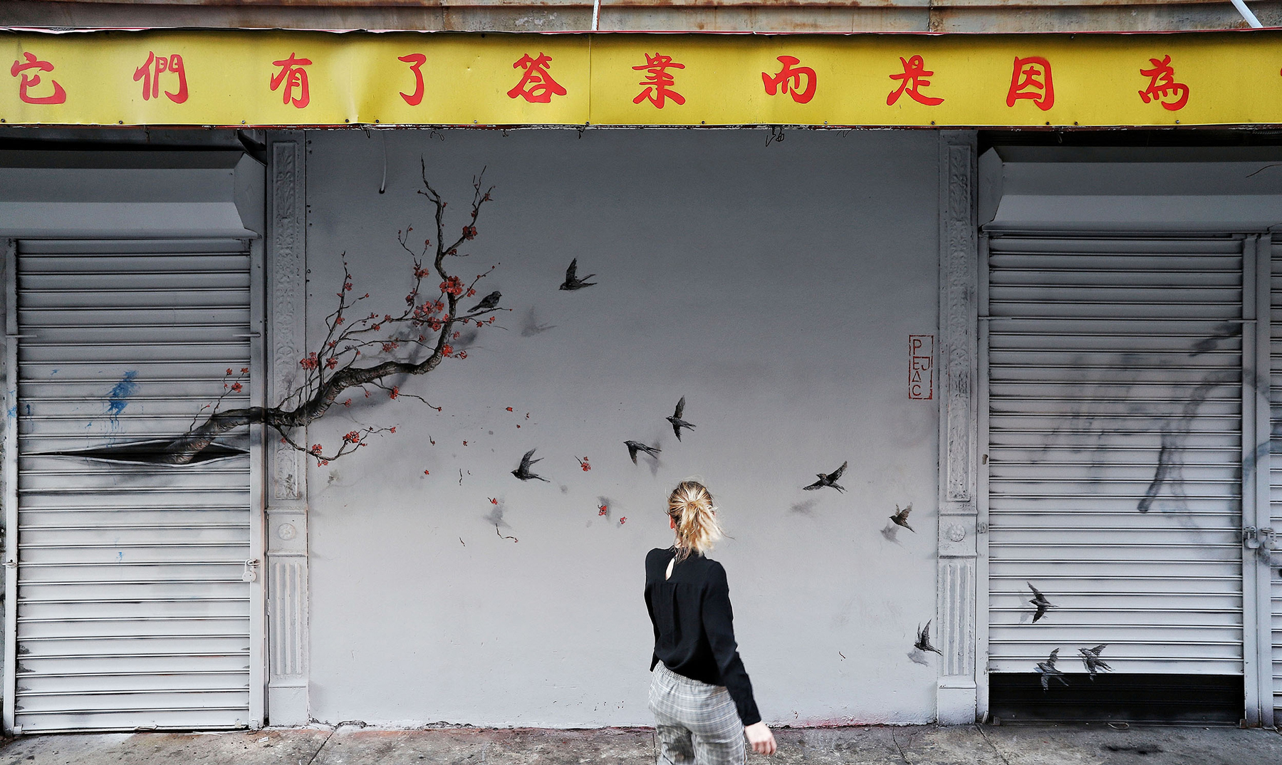 Inner Strength se ubica en la cortina de un negocio en Chinatown. Está completamente pintada a mano, representando una rama de cerezo que atraviesa el portón y está rodeada de golondrinas volando. Es una pieza de empoderamiento que retrata otro futuro hipotético en el que la naturaleza rompe las barreras impuestas por la mano del hombre, recuperando el terreno perdido a lo largo del camino.