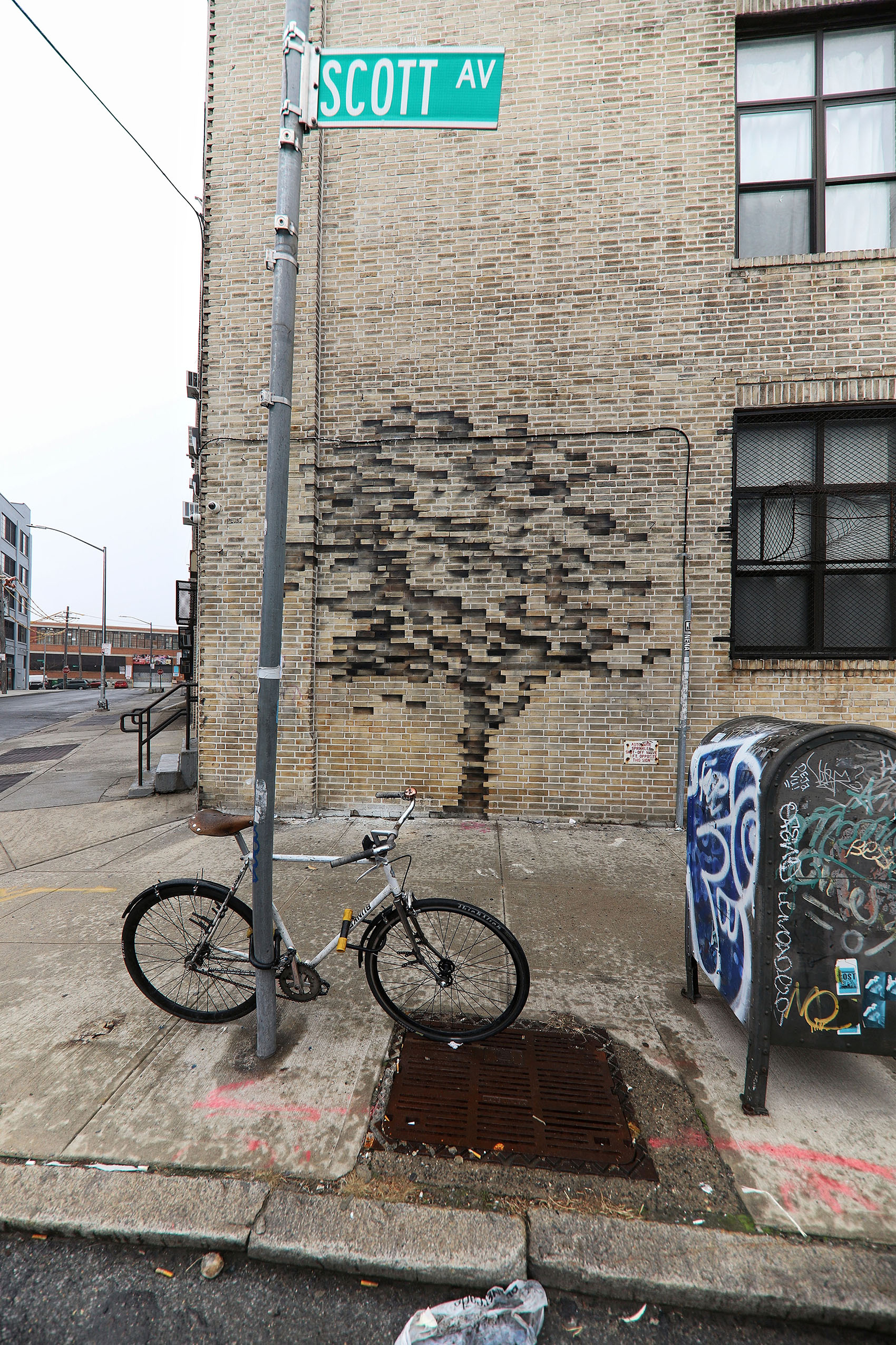Fossil es la primera obra, ubicada en Bushwick, Brooklyn. Usando una plantilla del tamaño de un ladrillo, Pejac pintó cuidadosamente sombras en una pared para generar la ilusión de que los ladrillos avanzan o retroceden sobre el muro, en una suerte de grilla pixelada que crea una figura de un árbol. Tomando una estructura robusta y un elemento urbano familiar como base, Fossil propone un hipotético futuro fatal en el que el único recuerdo de la naturaleza es la apariencia fosilizada de un árbol en una pared.