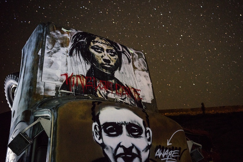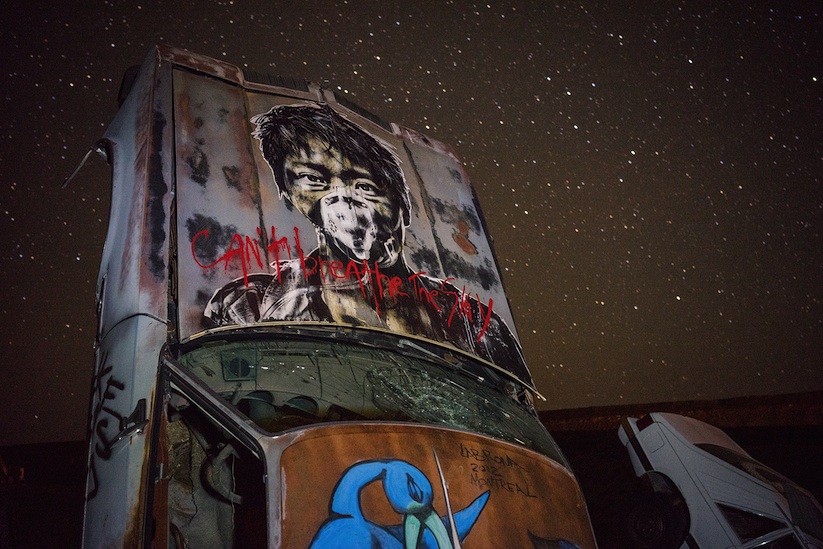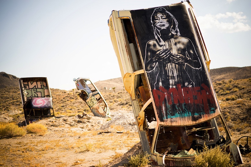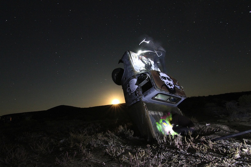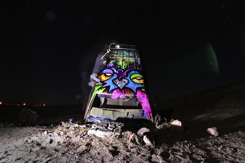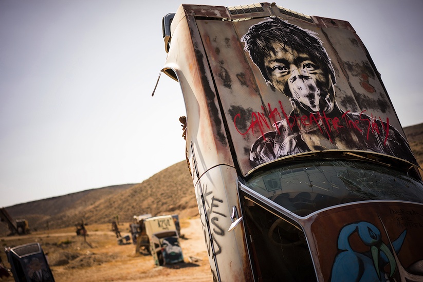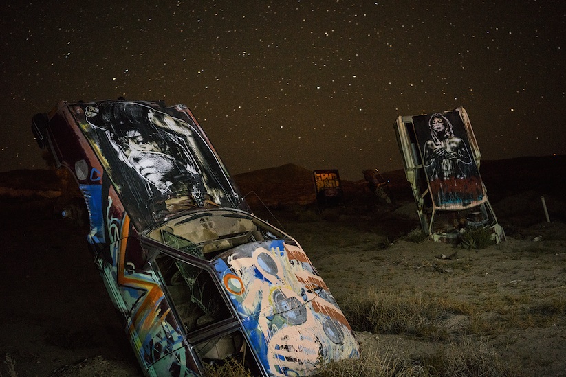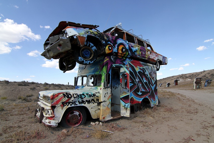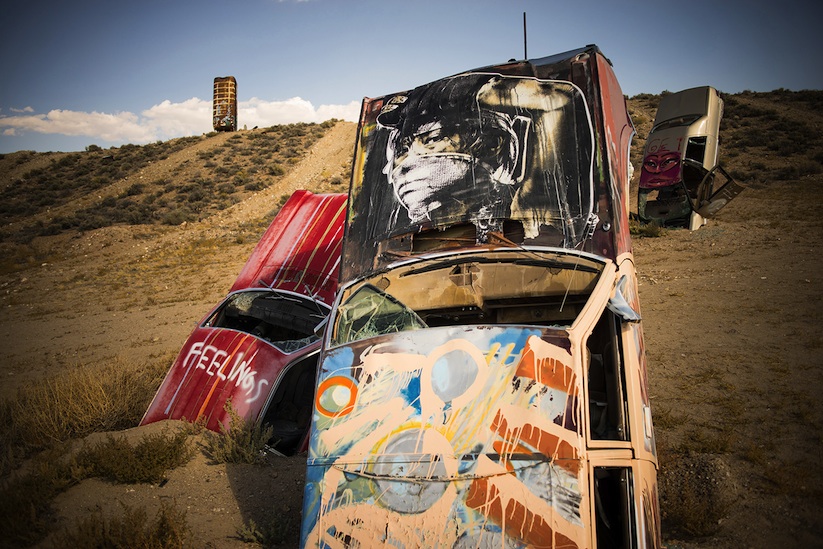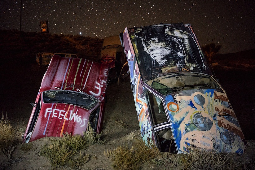 Eddie Colla y Nite Owl, dos artistas de Oakland, manejaron durante 10 horas para llegar al “International Car Forest of the Last Church” en Goldfield, Nevada, un cementerio de autos abandonados en el medio del desierto.