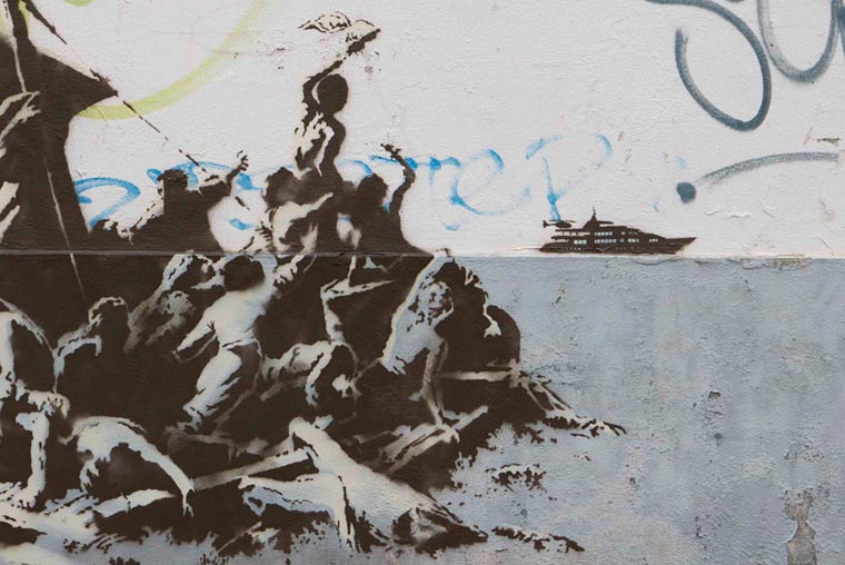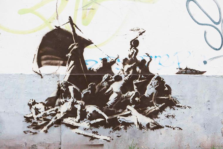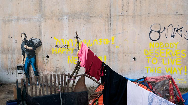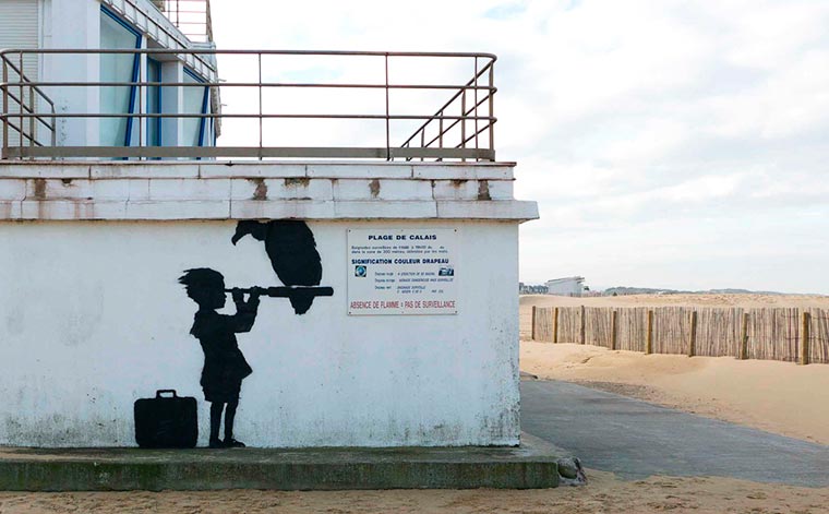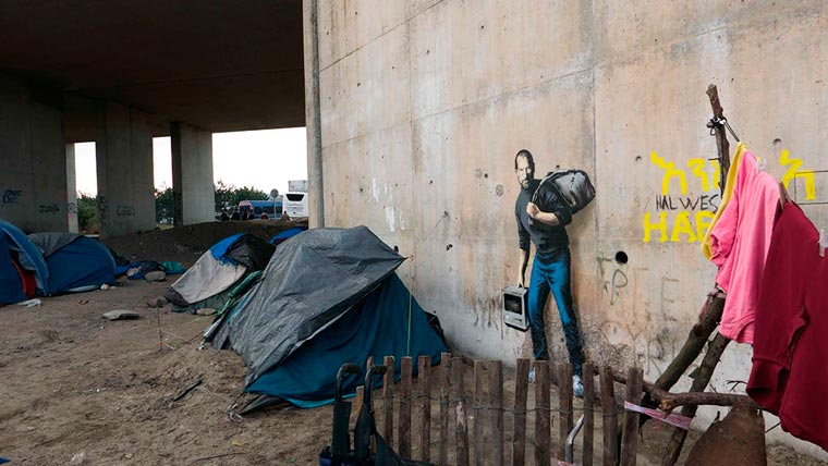 Luego de usar materiales recuperados de su reciente Dismaland para crear pequeños albergues para los refugiados en su obra “La Jungla de Calais”, en la ciudad francesa que estuvo en el foco de las recientes noticias sobre la migración siria, nos encontramos con 4 nuevos murales en las calles de Calais.