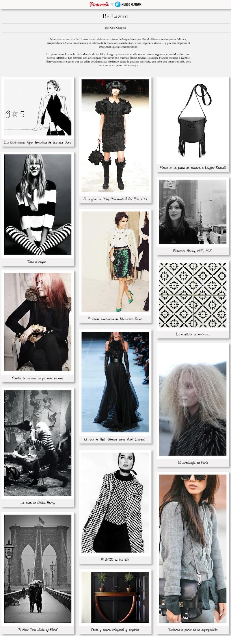 Arrancamos armando un board (en Pinterest, una obsesión personal) en el que Debbie Harry, Françoise Hardy, el mod, los 60, las rayas y el rock fueron protagonistas. Flaneur, al palo…