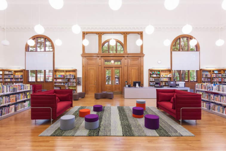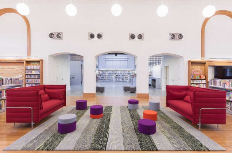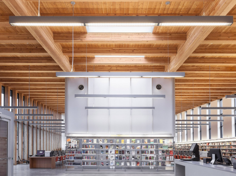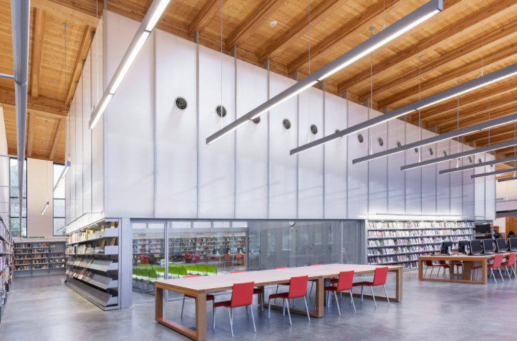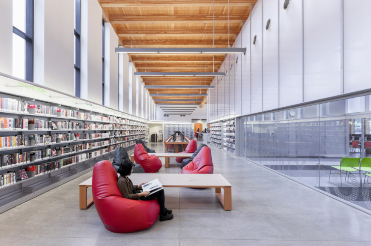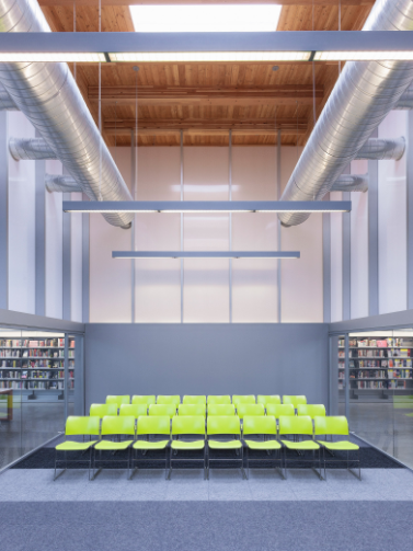 Este proyecto para la biblioteca pública de Stapleton Branch es una ampliación, caracterizada por amplios espacios, una lectura contemporánea del espacio y una apertura al exterior que mejora los amplios espacios interiores.