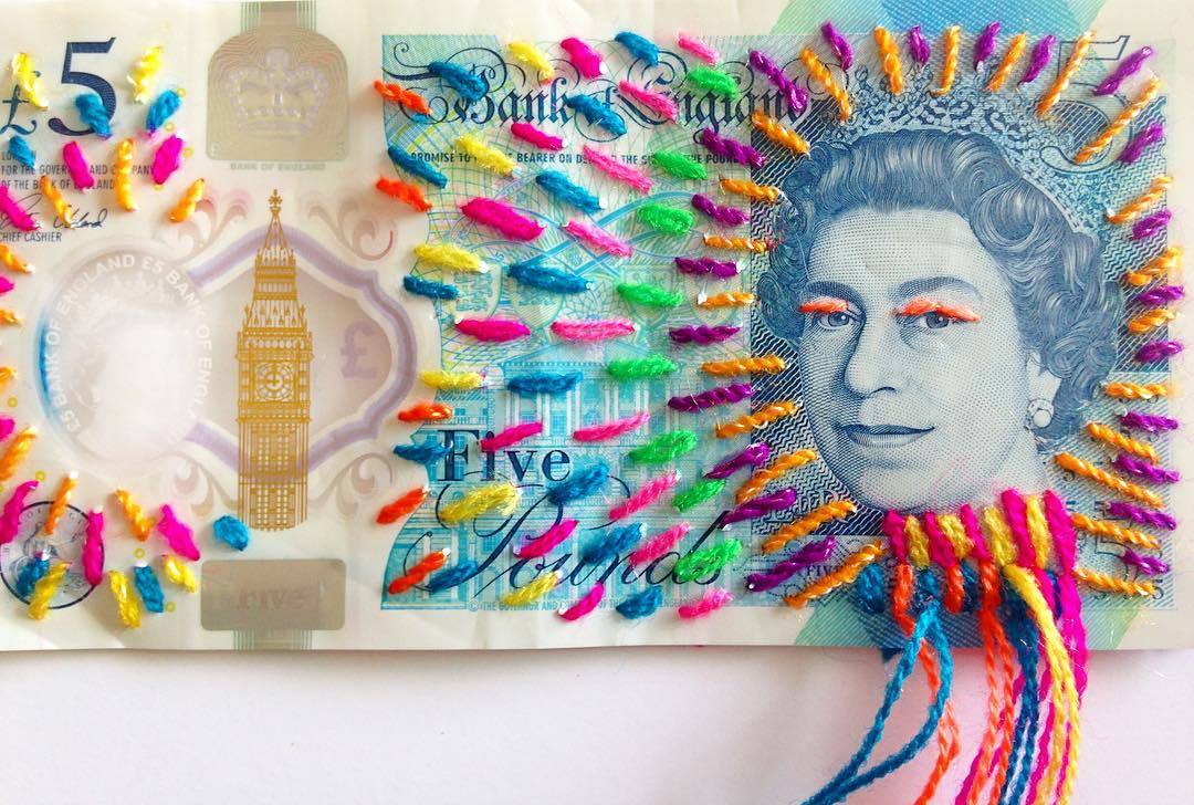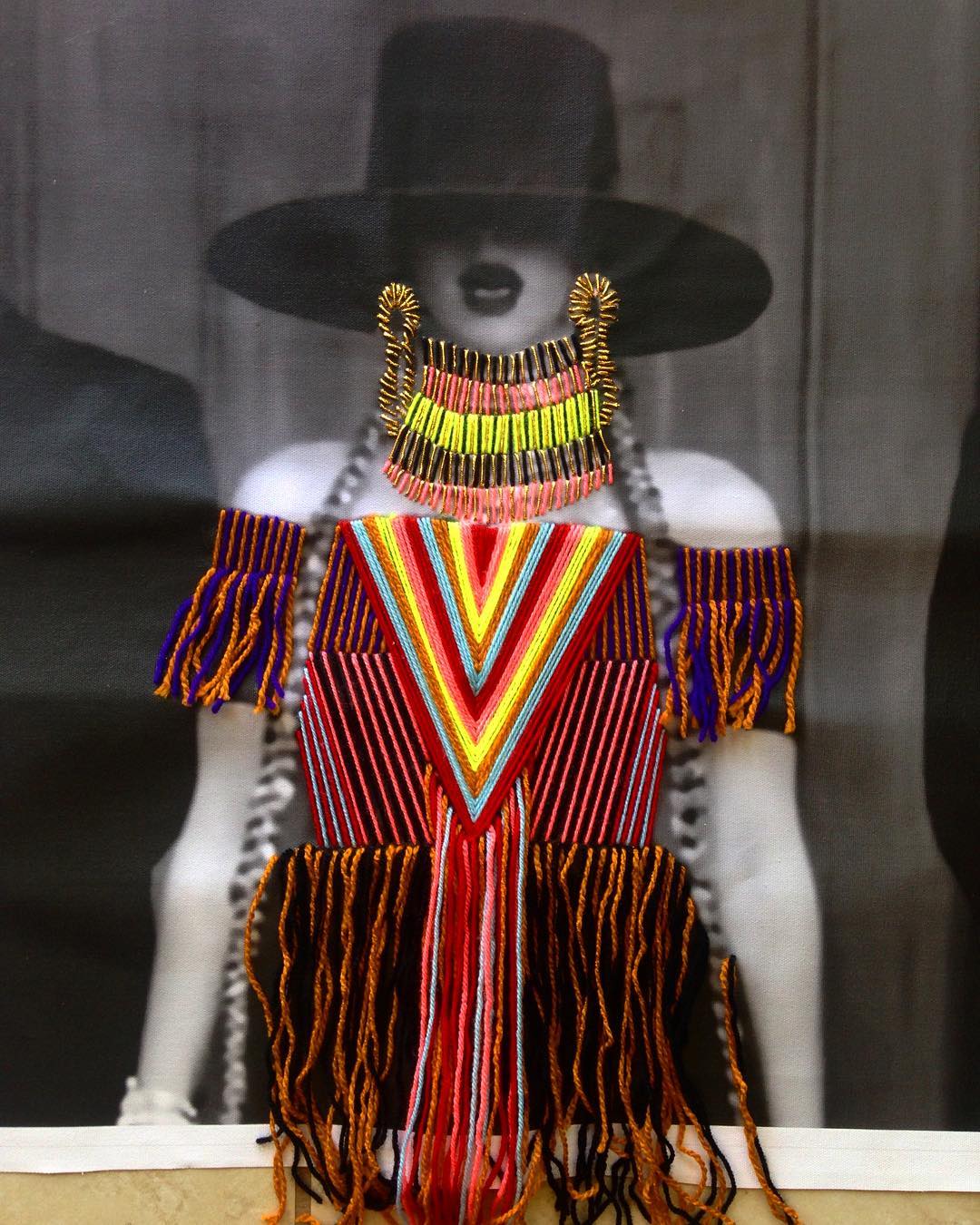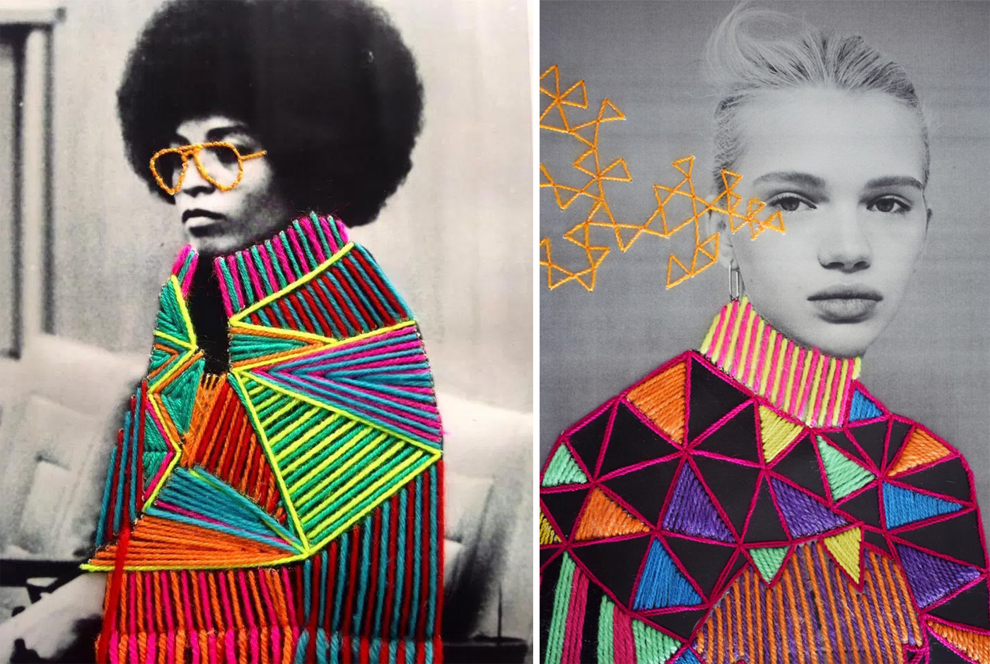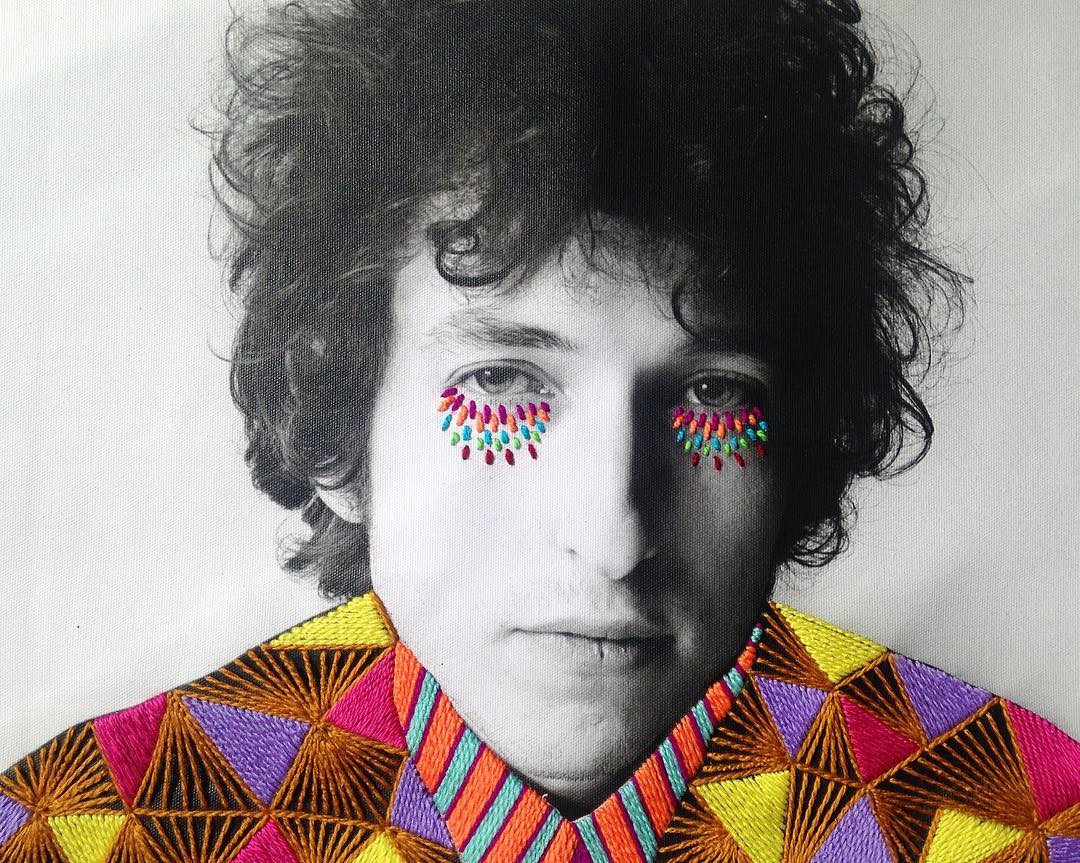 Trabajando con fotografías apropiadas de artistas, músicos y políticos, la artista textil mexicana Victoria Villasana aplica una capa de bordado colorida a cada imagen.