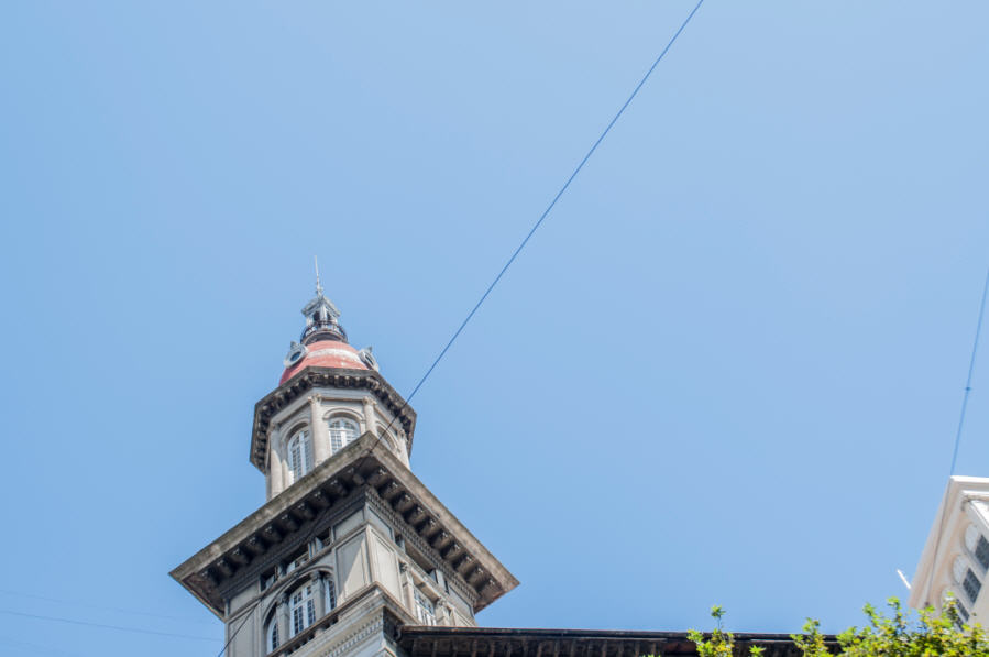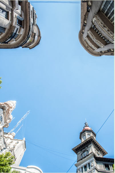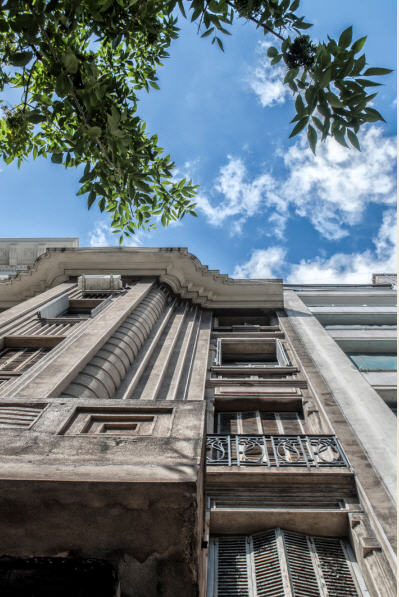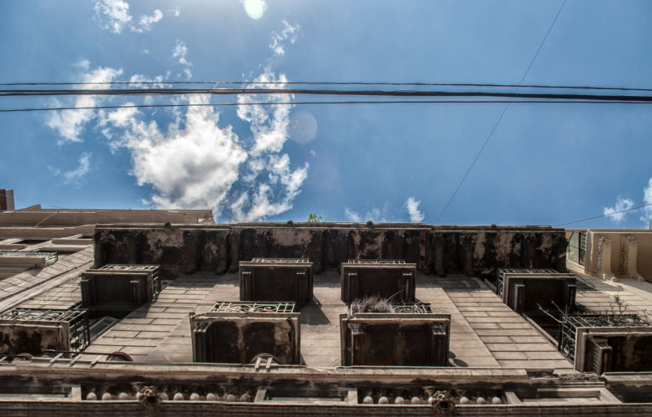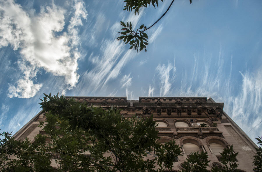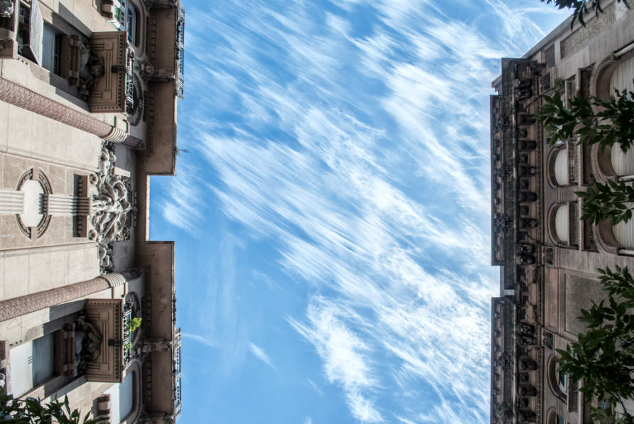 Buenos Aires vista desde abajo, la fachada de sus elegantes edificios y arriba un cielo pleno celeste.