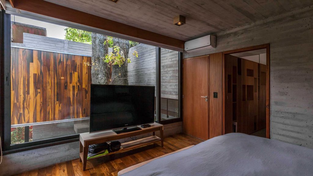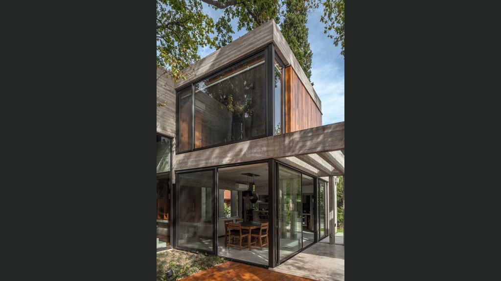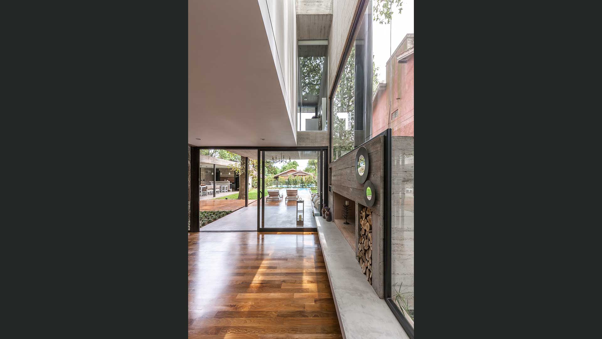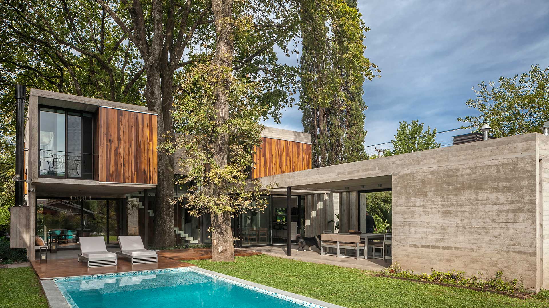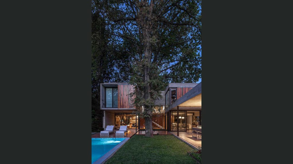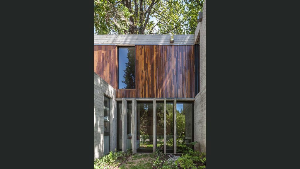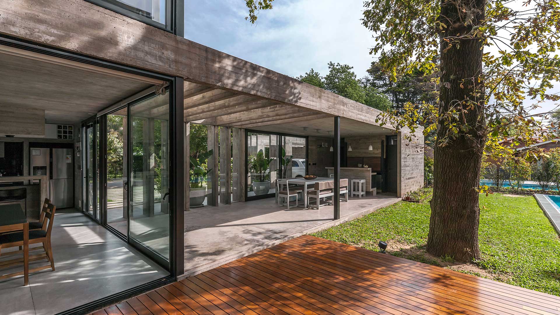 En relación con los requerimientos de materialidad de los dueños, se decidió que la planta baja de la vivienda, y su prolongación en los espacios semicubiertos, se resolvieran con tabiques de hormigón visto hacia el espacio público. Estos forman un zócalo continuo que se perfora más o menos según las necesidades de los ambientes que define y sobre el que se apoya una estructura más liviana de perfiles metálicos y paneles con mínimas aberturas hacia las calles y con terminación exterior de tablas de madera. Por el contrario, hacia el interior y envolviendo los robles, la casa es totalmente abierta, de manera que cada ambiente participa del ambiente contiguo y del paisaje.