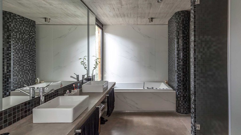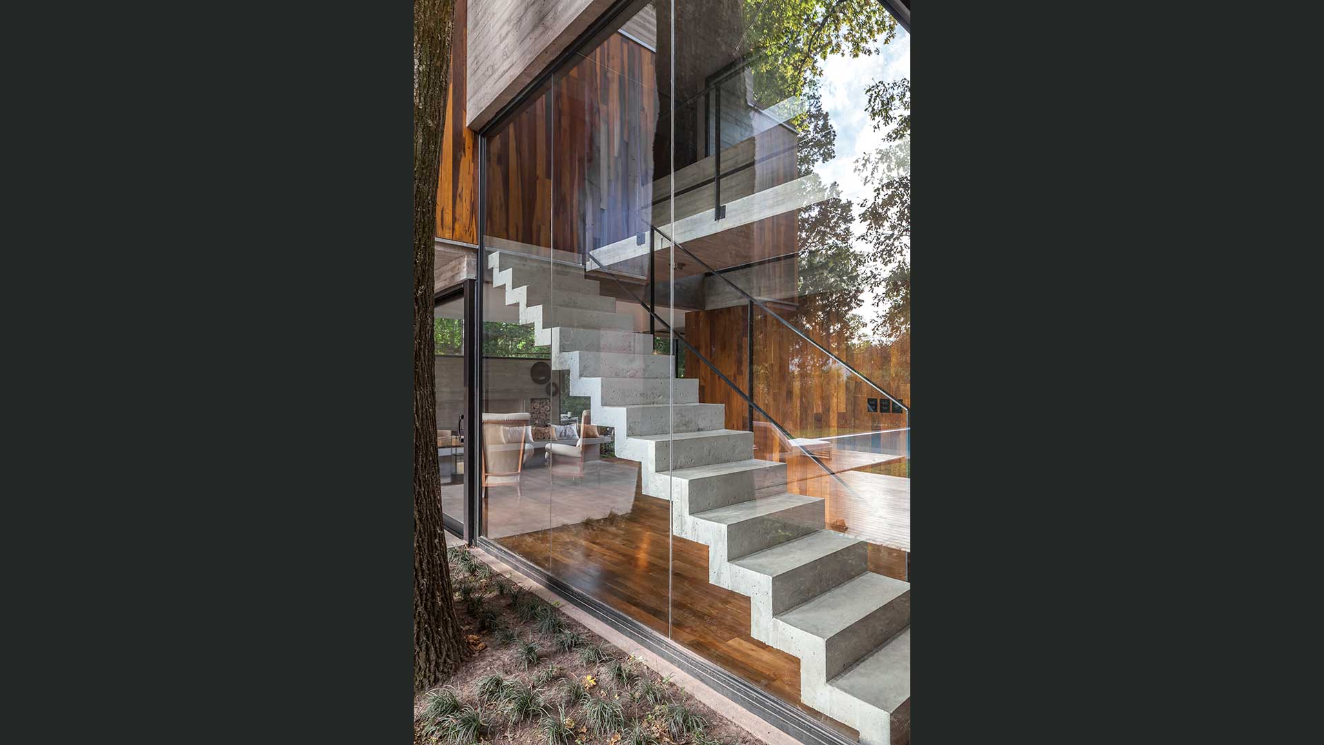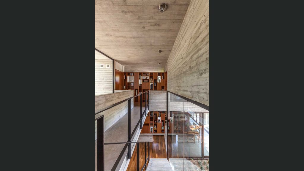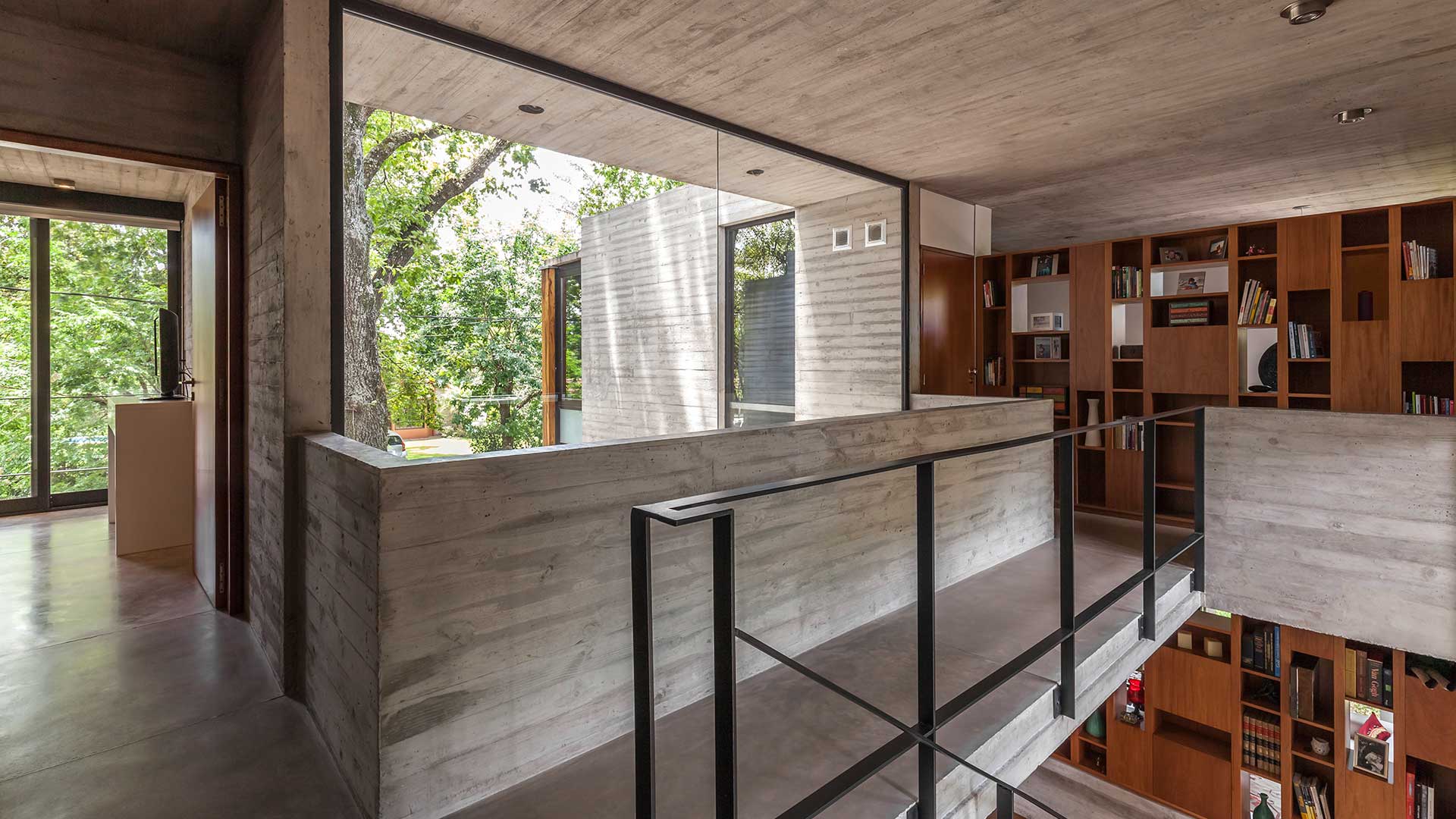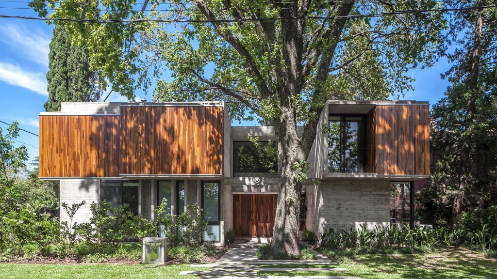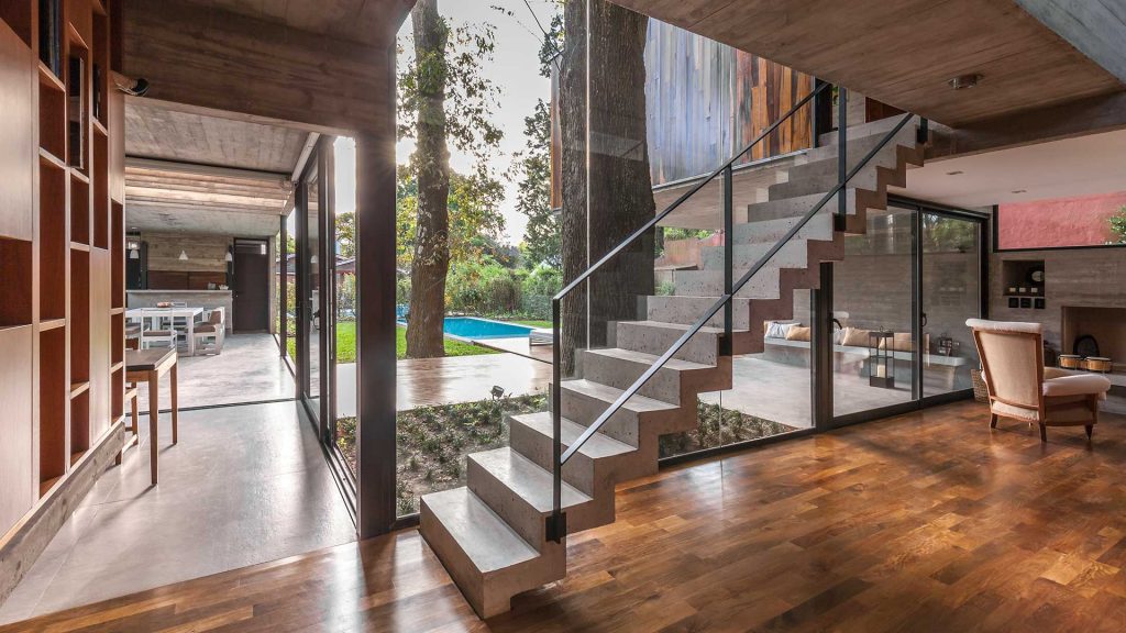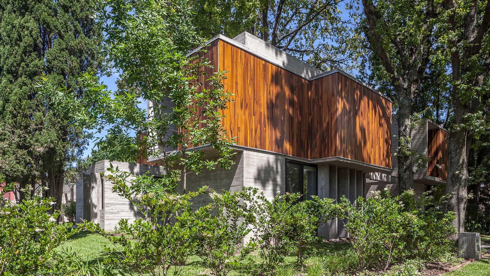 En relación con los requerimientos de materialidad de los dueños, se decidió que la planta baja de la vivienda, y su prolongación en los espacios semicubiertos, se resolvieran con tabiques de hormigón visto hacia el espacio público. Estos forman un zócalo continuo que se perfora más o menos según las necesidades de los ambientes que define y sobre el que se apoya una estructura más liviana de perfiles metálicos y paneles con mínimas aberturas hacia las calles y con terminación exterior de tablas de madera. Por el contrario, hacia el interior y envolviendo los robles, la casa es totalmente abierta, de manera que cada ambiente participa del ambiente contiguo y del paisaje.