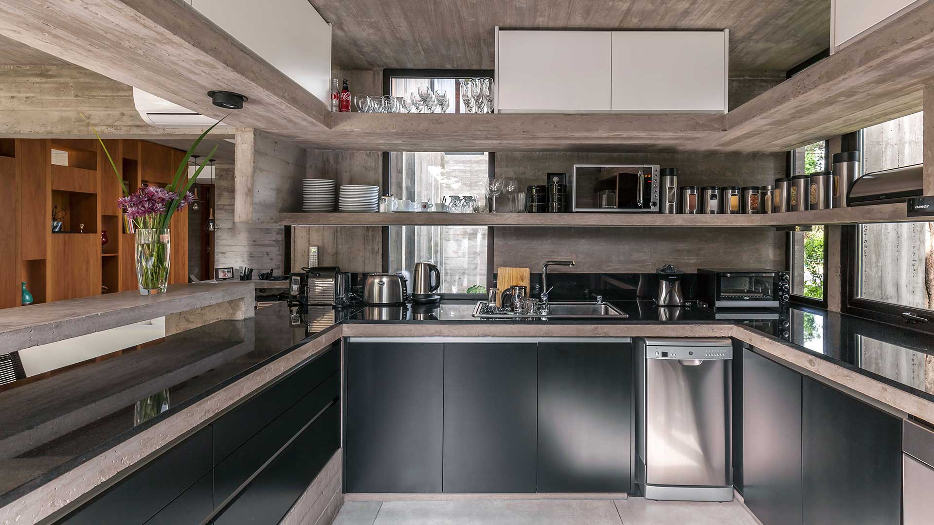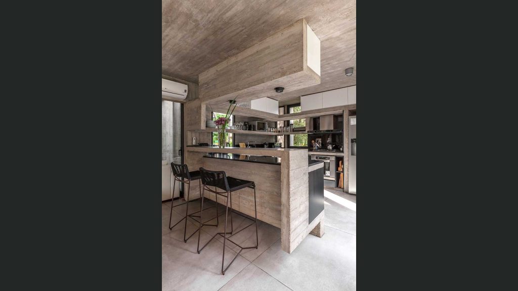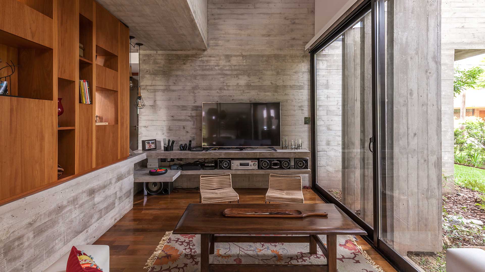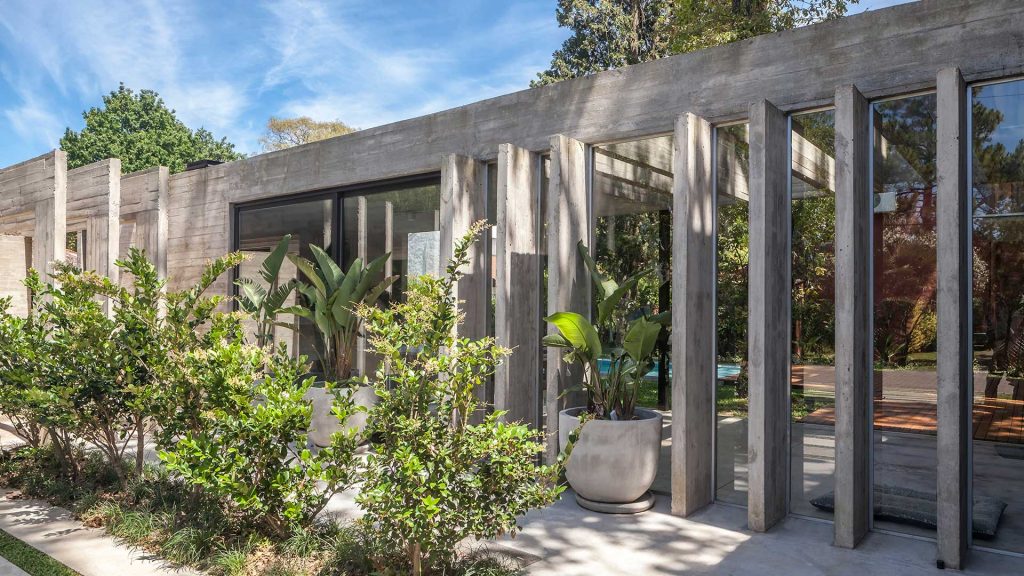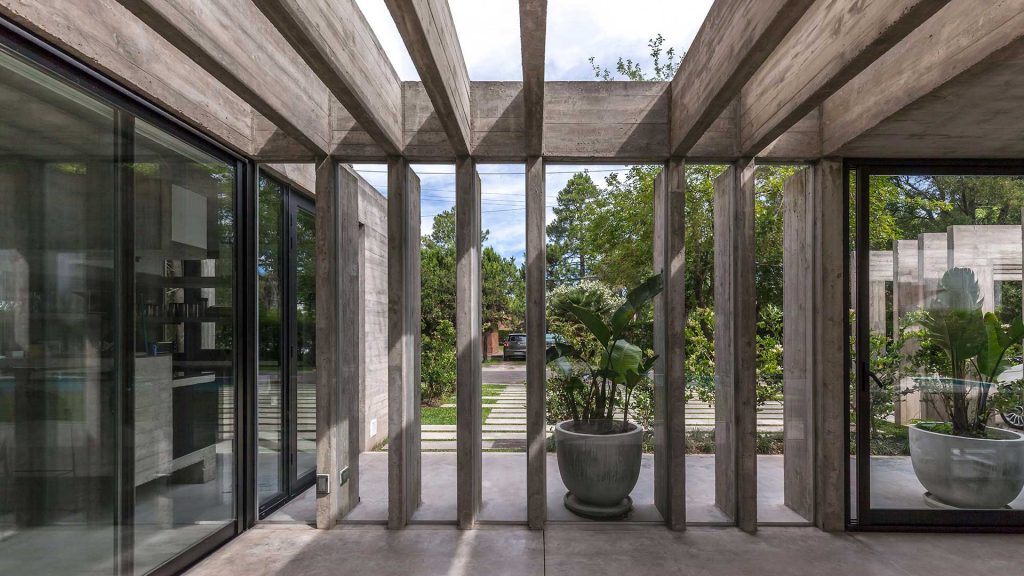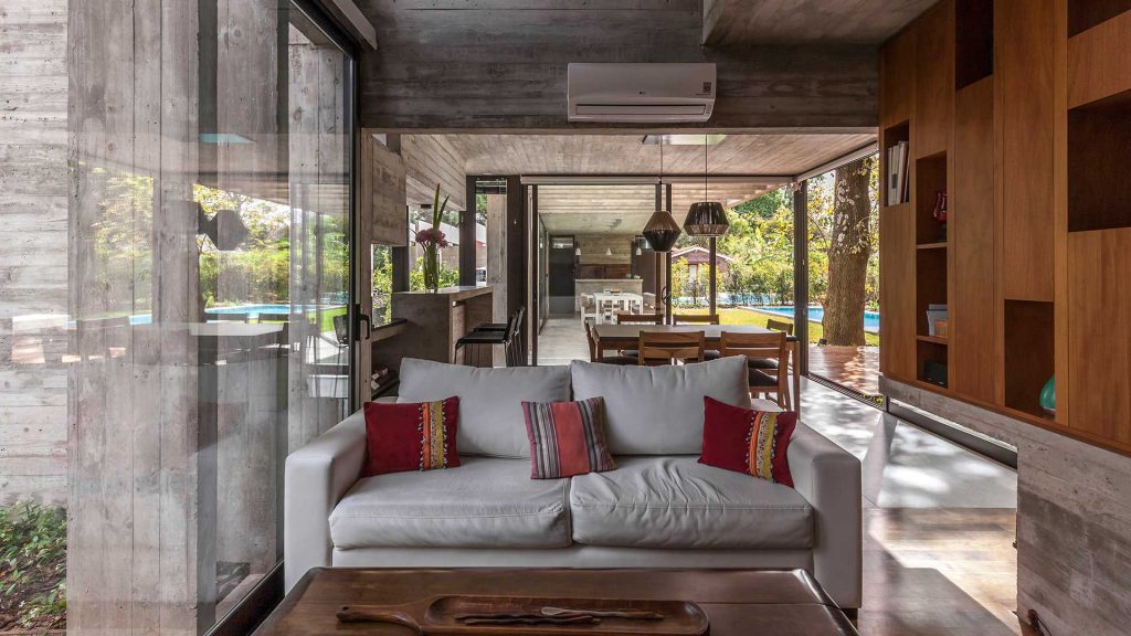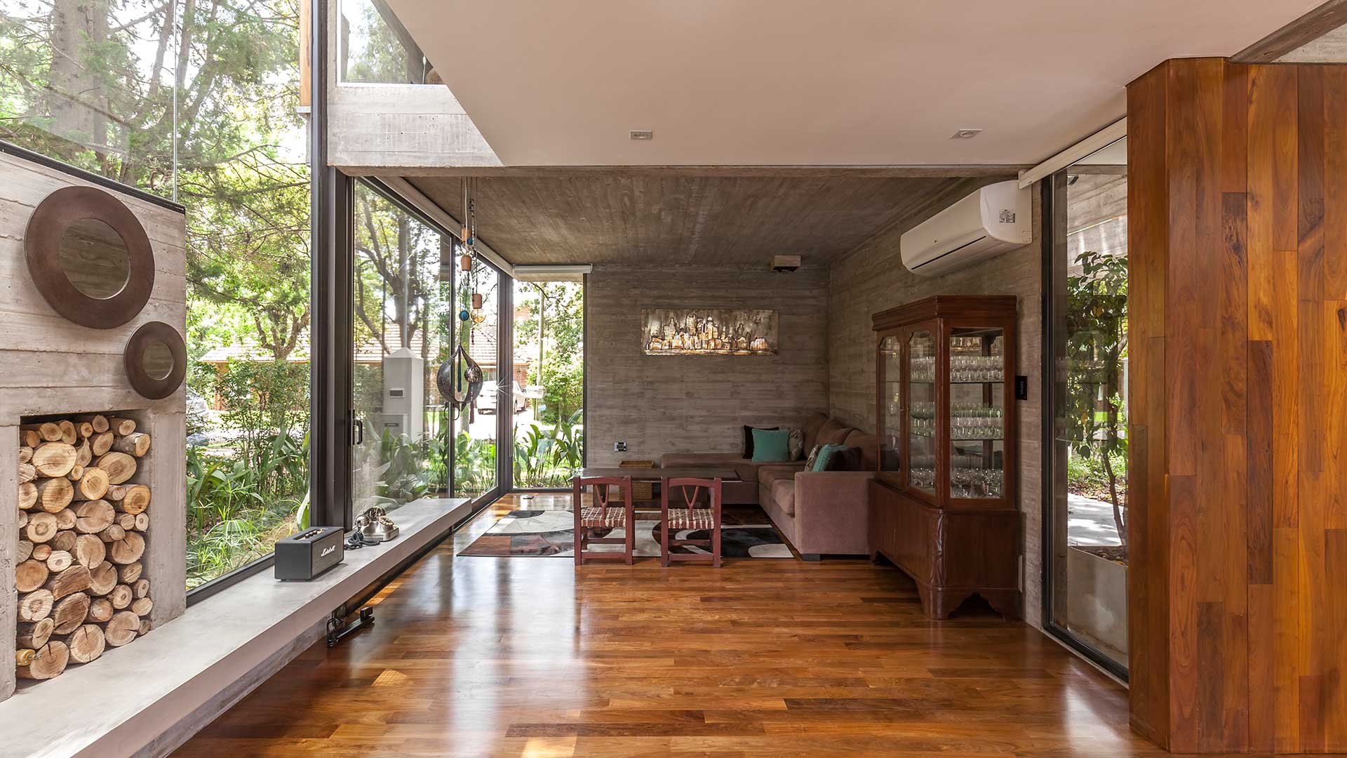 Una vivienda de uso permanente con el especial requerimiento de que posibilitara vivir intensamente la relación entre los espacios interiores y el exterior tan apreciado por los dueños. Otro pedido expresado fue que, si bien estaban interesados en una casa construida con hormigón a la vista, deseaban que la presencia de la madera rompiera esa expresión monocromática.