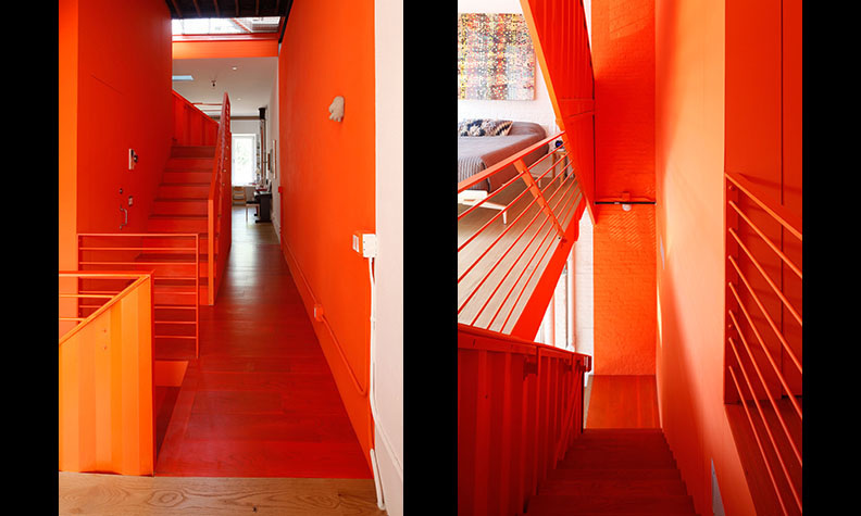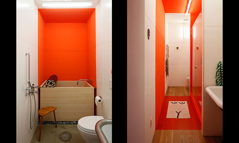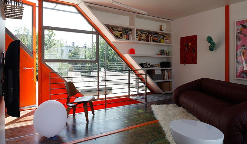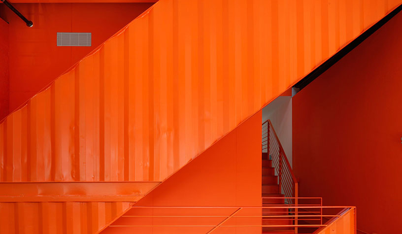 Manteniendo partes de la pintura original y otros toques en naranja brillante, los cortes en diagonal planteados en los contenedores hacen que el espacio aparente ir siempre hacia arriba.