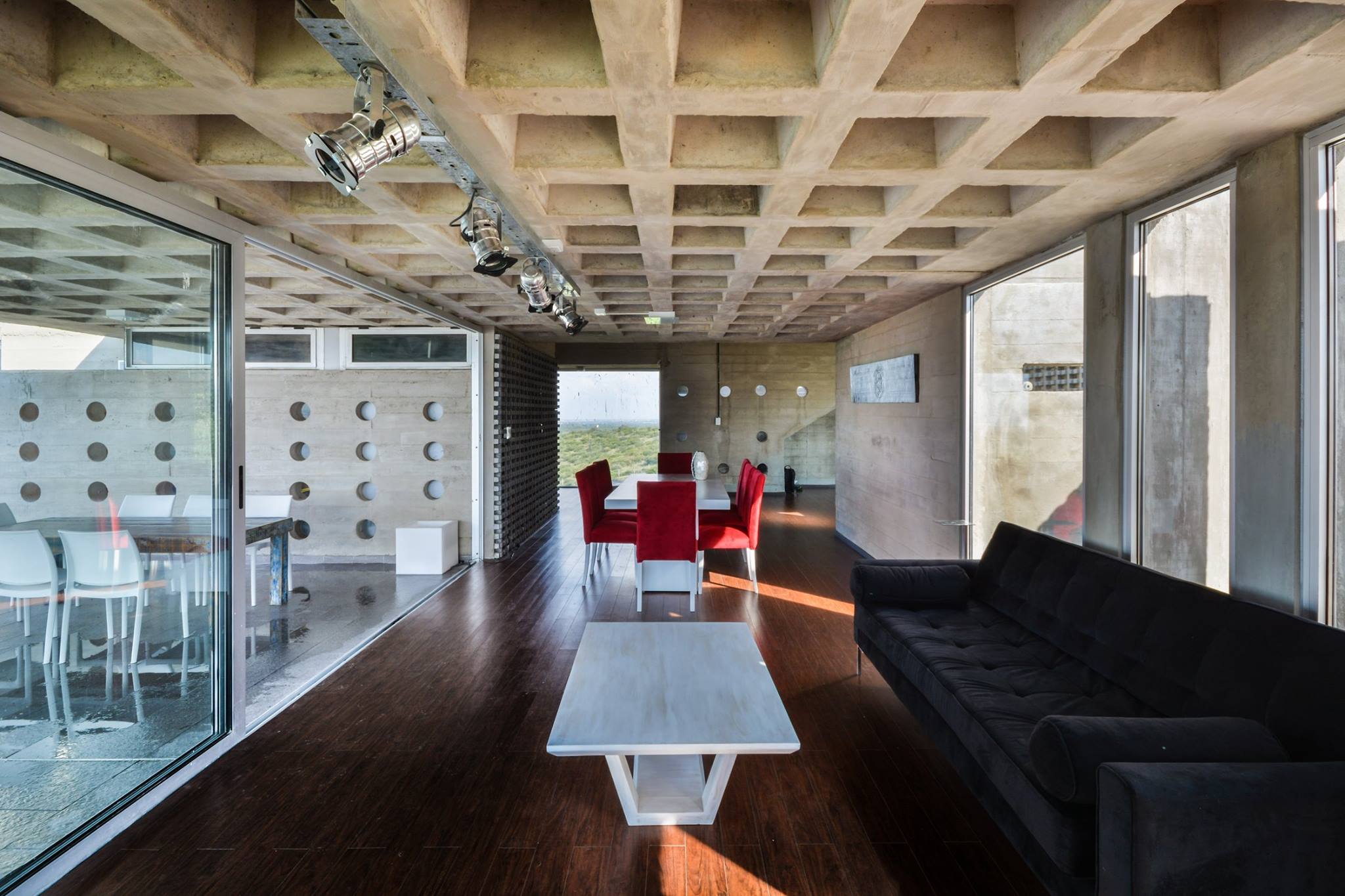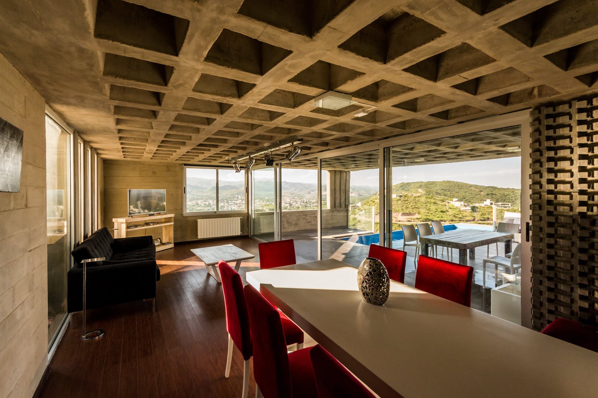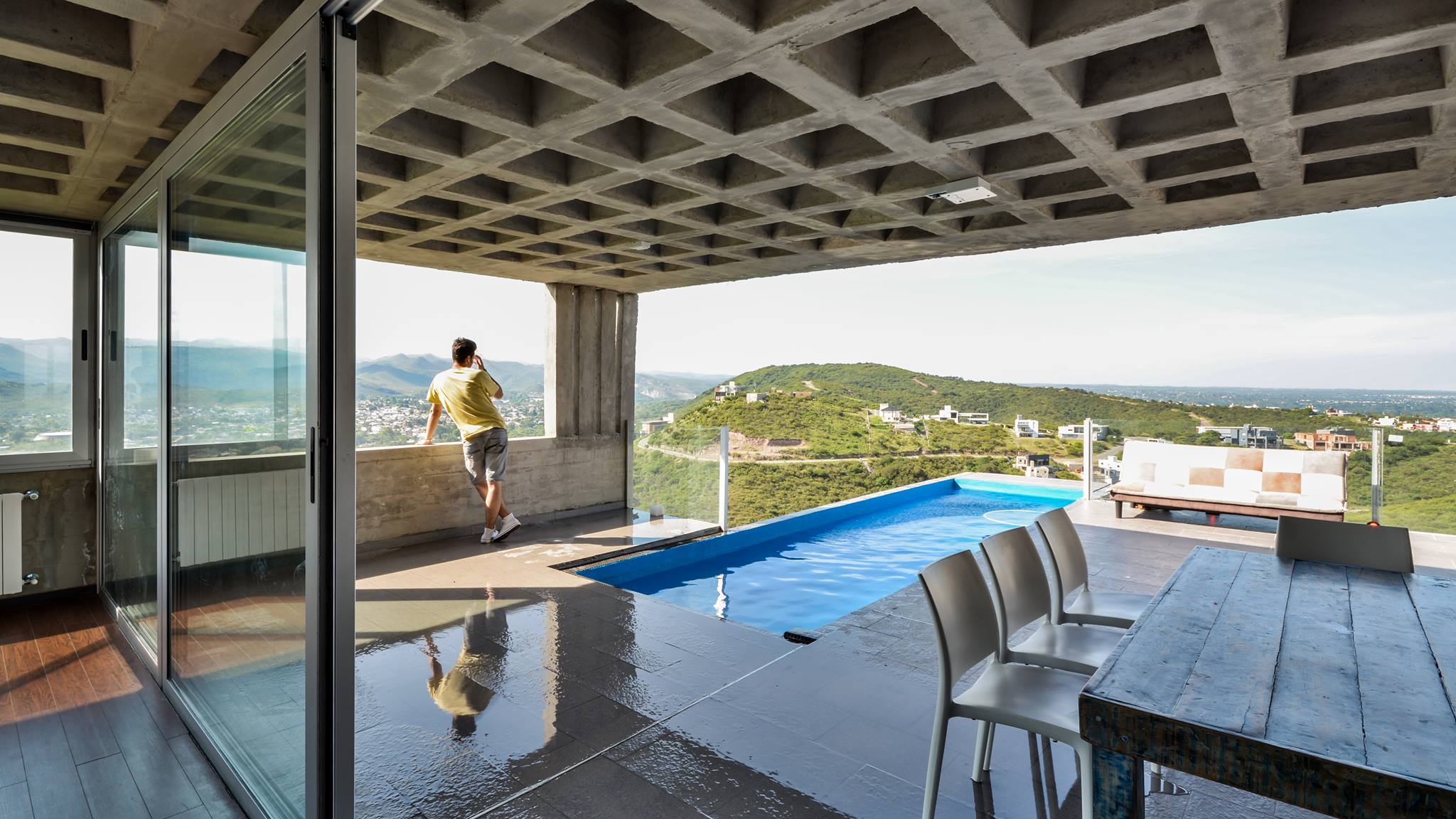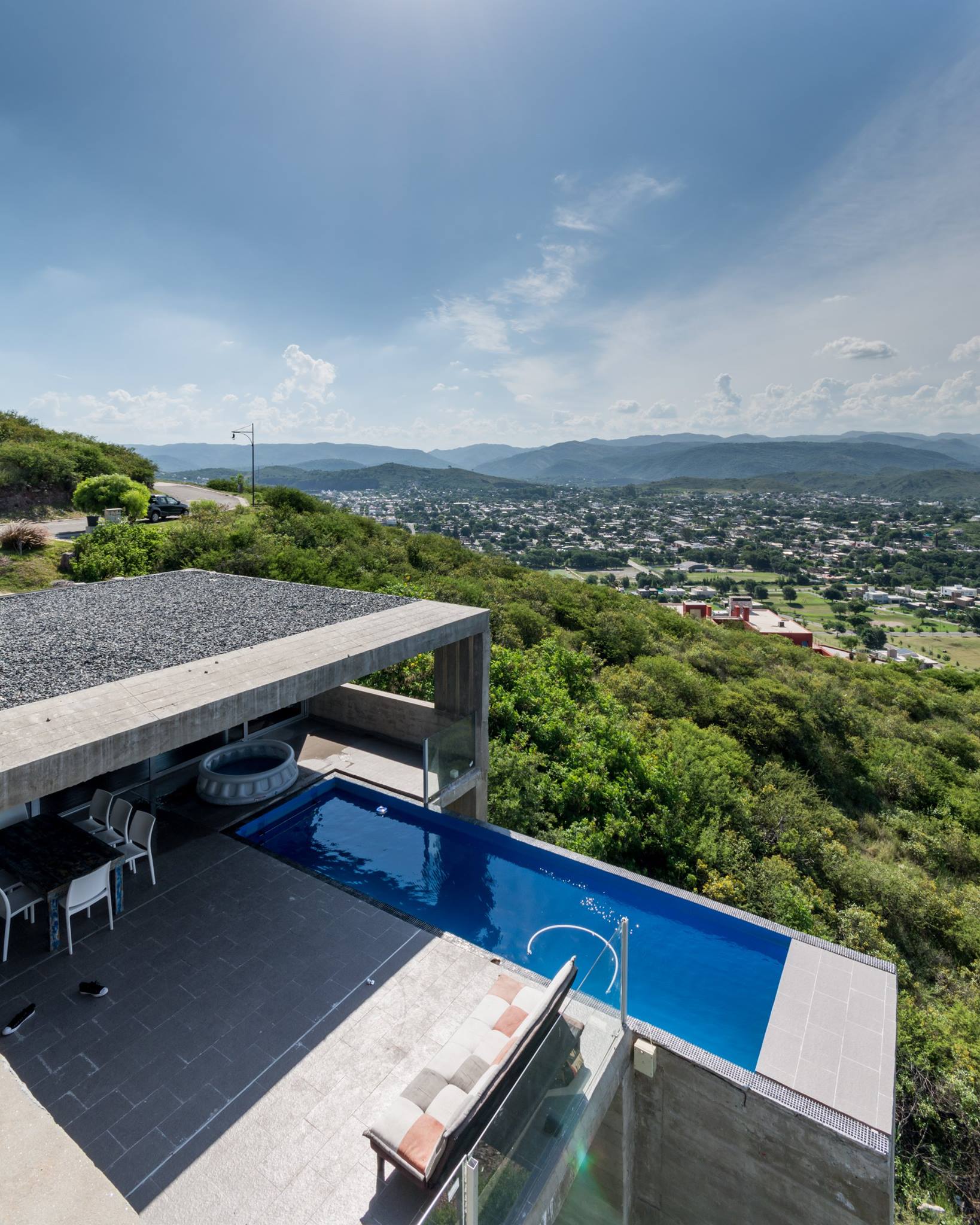 Son 380 metros cuadrados que se dividen en tres plantas con una constante conexión con el exterior, logrando el objetivo de que la casa se asemeje a una suerte de cueva en la sierra. Es así como el área de acceso en el piso más alto sirve como el lugar destinado a las actividades públicas de la casa, con el living, cocina, comedor y área de parrilla con la piscina que hace de balcón infinito frente el paisaje.