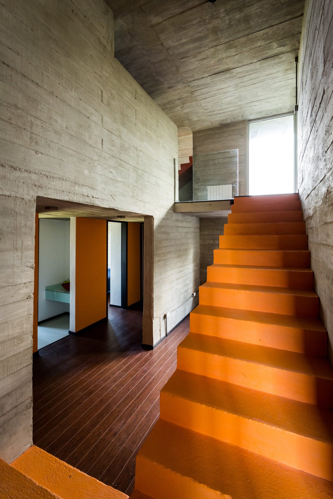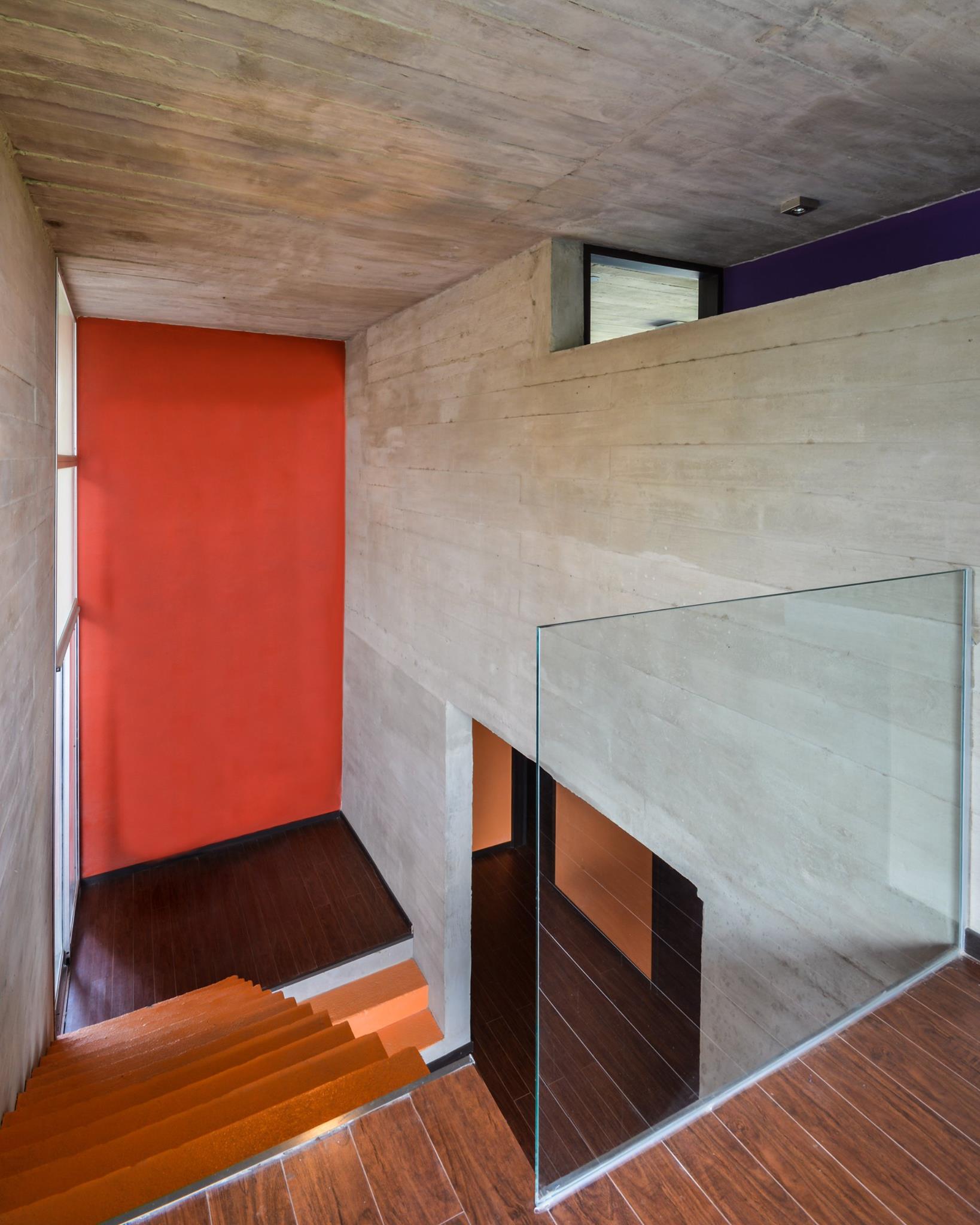 Yendo hacia los niveles inferiores de la casa nos encontramos con las cuatro habitaciones, baños y un pequeño estar y patio. A lo largo de la casa, acentos de color tocan elementos como paredes y la escalera principal, dejando el resto del lugar con el hormigón sin acabar.