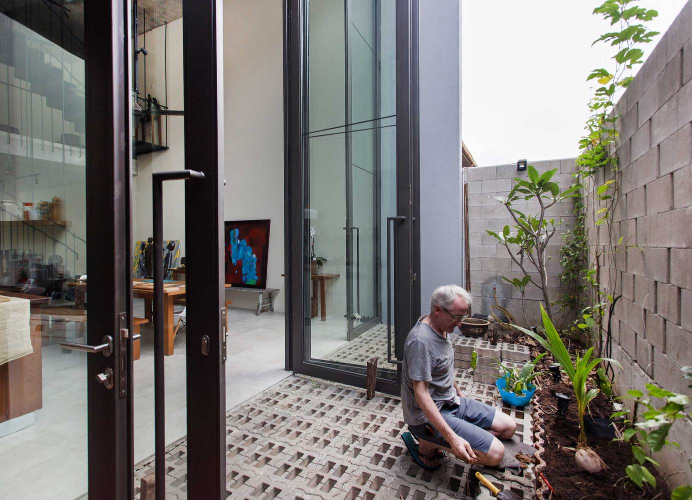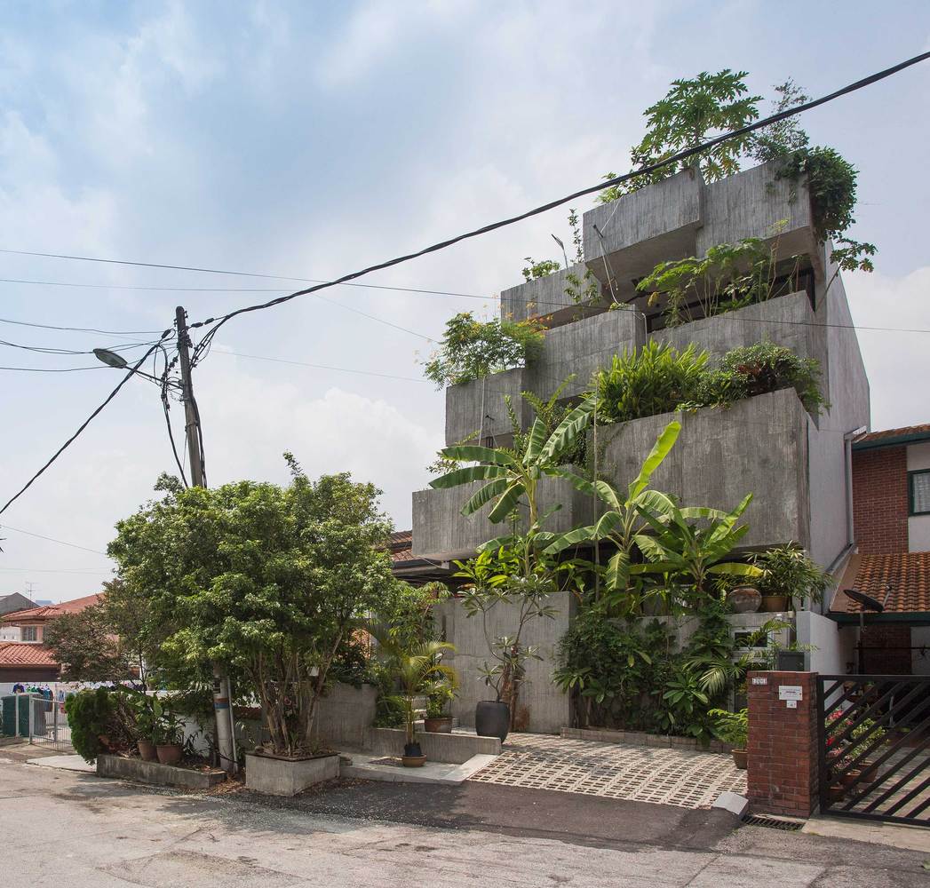 La casa con sus maceteros de concreto en cascada, ocupados con más de 40 tipos de plantas comestibles en cada piso, crea un fuerte contraste visual con las construcciones vecinas. Su fachada empotrada proporciona espacios públicos adicionales para la interacción entre vecinos. Esto puede verse en la primera maceta que se construye alrededor de un árbol de jazmín existente, que sirve como mobiliario urbano proporcionando una conexión entre la pareja y su vecindario.