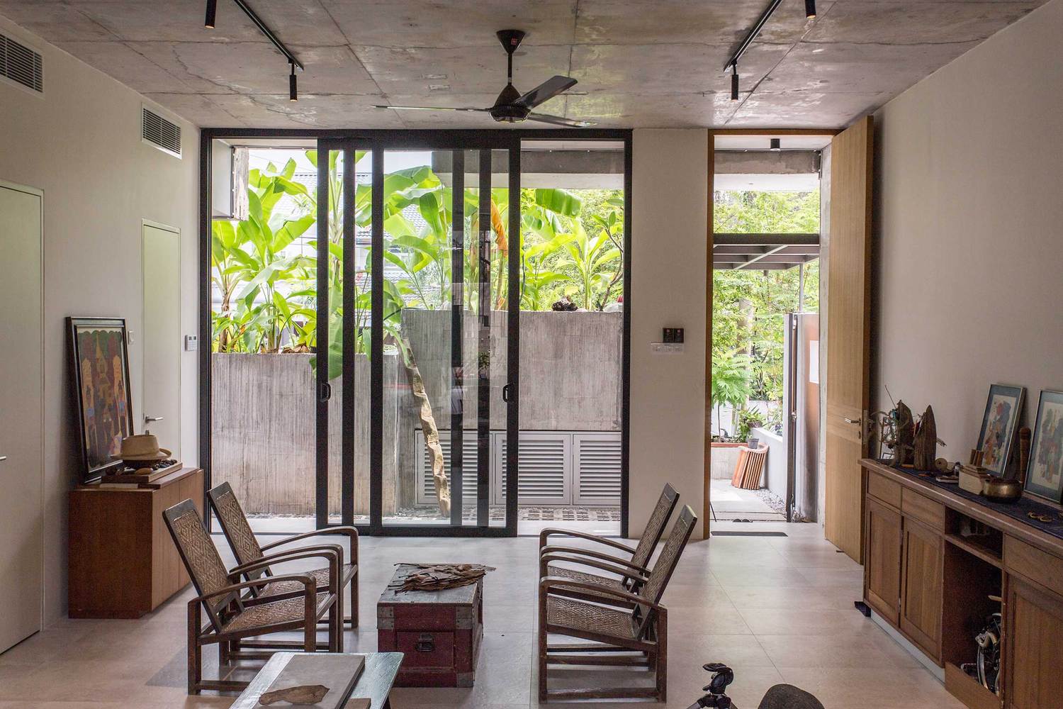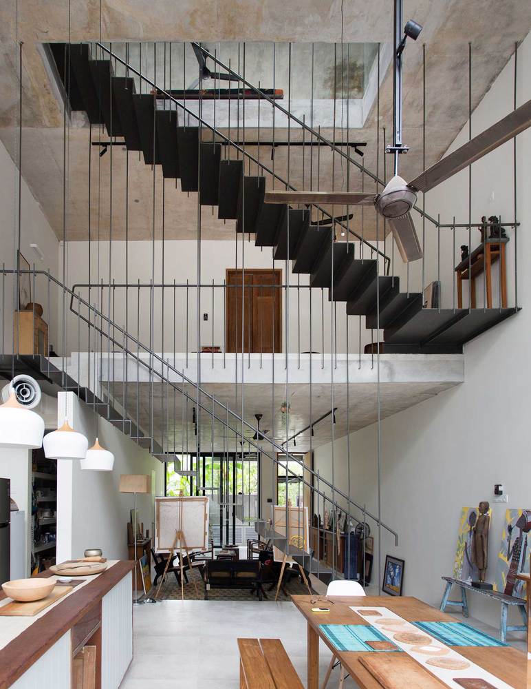 Los espacios internos están impregnados de un fuerte sentido de hospitalidad y de la actitud del propietario hacia la vida y la agricultura de las tropicales comunidades urbanas que trabajan con métodos sostenibles. Al abrir la puerta, inmediatamente se percibe la luz y la ventilación cruzada, y a la vez, se logra ver la totalidad de la planta baja que solo tiene una separación de vidrio entre la parte delantera y trasera. En la parte posterior de la casa, luego de pasar por la sala de estar y la escalera central, se encuentra una cocina y un comedor de doble altura, separado de la terraza con muro verde por un gran ventanal.