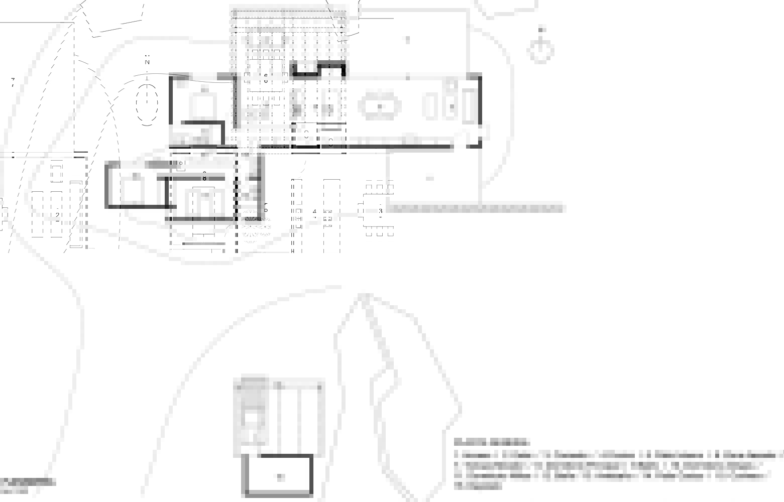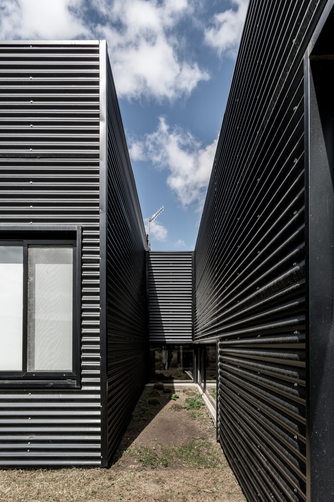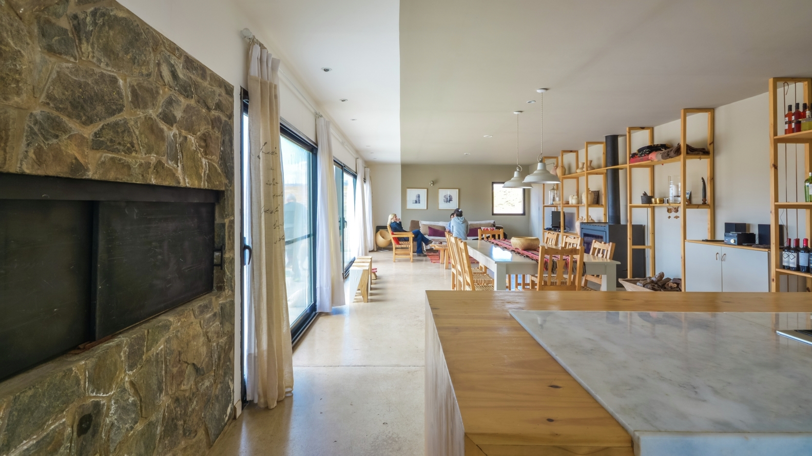 La casa se cierra al sur y se abre al norte, al paisaje de las sierras cercanas, la luz y el calor. En el interior se encuentran dos patios que unen la zona de parrillas con el resto de la casa, y otro más estrecho para iluminar el pasillo donde se ubican los dormitorios.