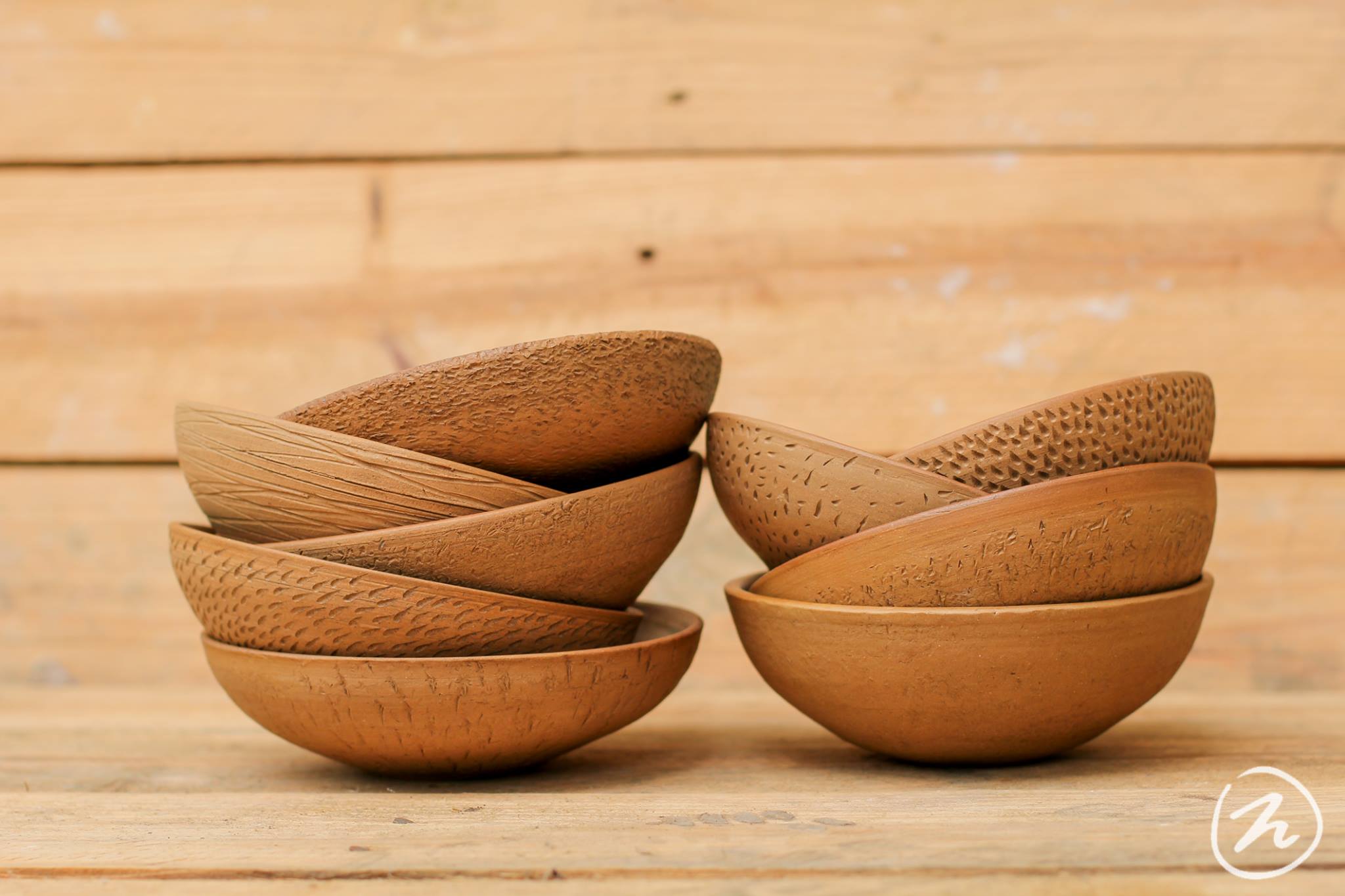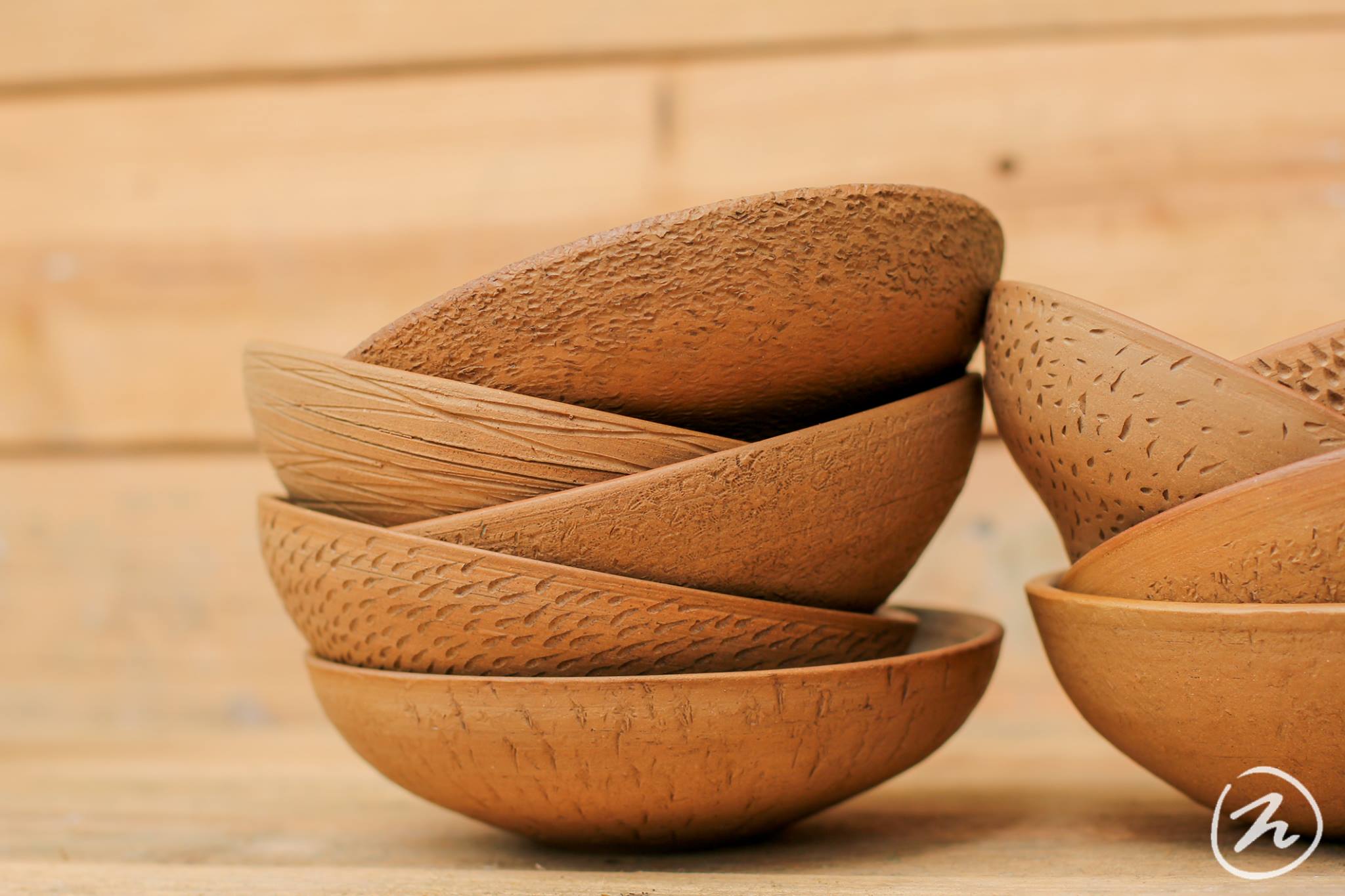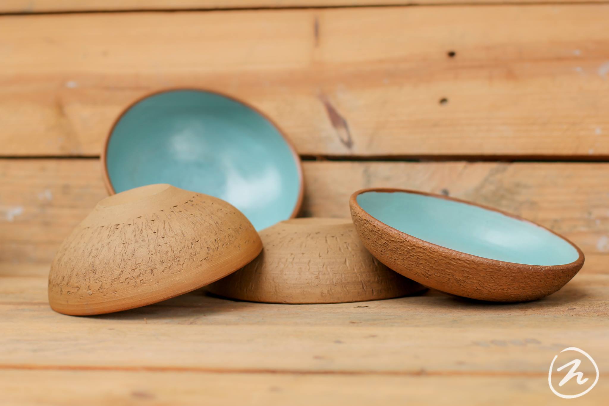 Nanomo son piezas hechas en gres, en el torno alfarero, y luego intervenidas manualmente una por una y horneadas a 1200 grados. En la mayoría trato de dejar una parte de pasta a la vista, y la otra esmaltada o engobada, que vendría a ser el atuendo. Así como la vestimenta, más allá de cuestiones estéticas lo indispensable en Nanomo es que sean objetos utilitarios.