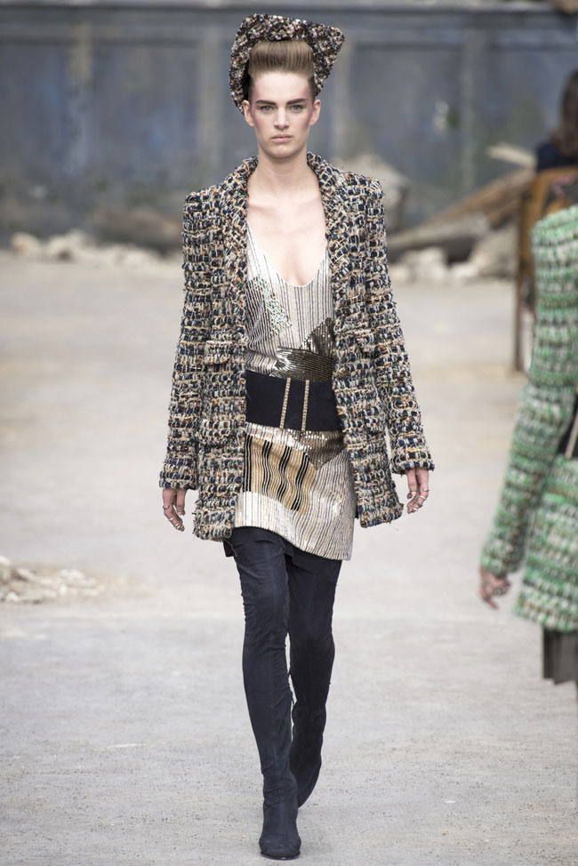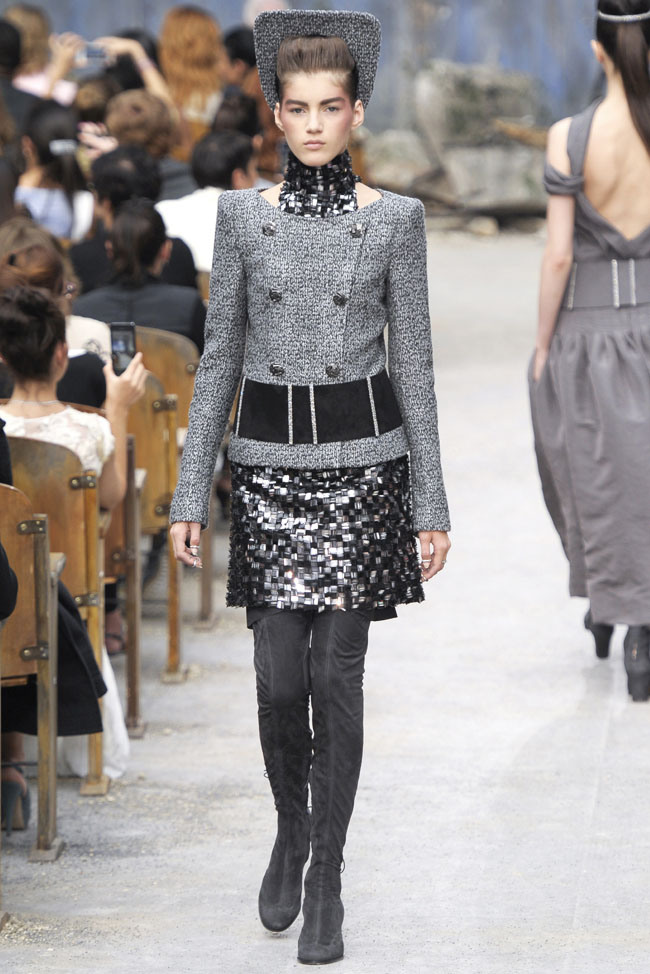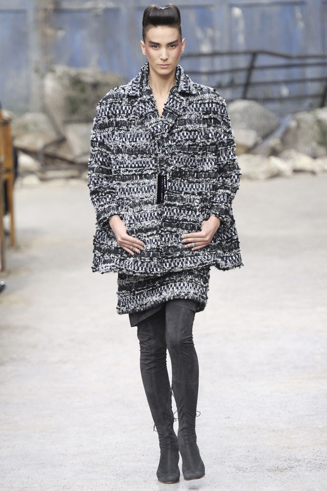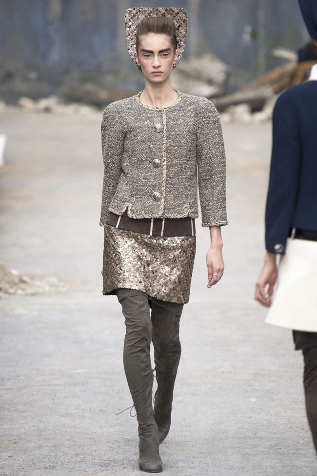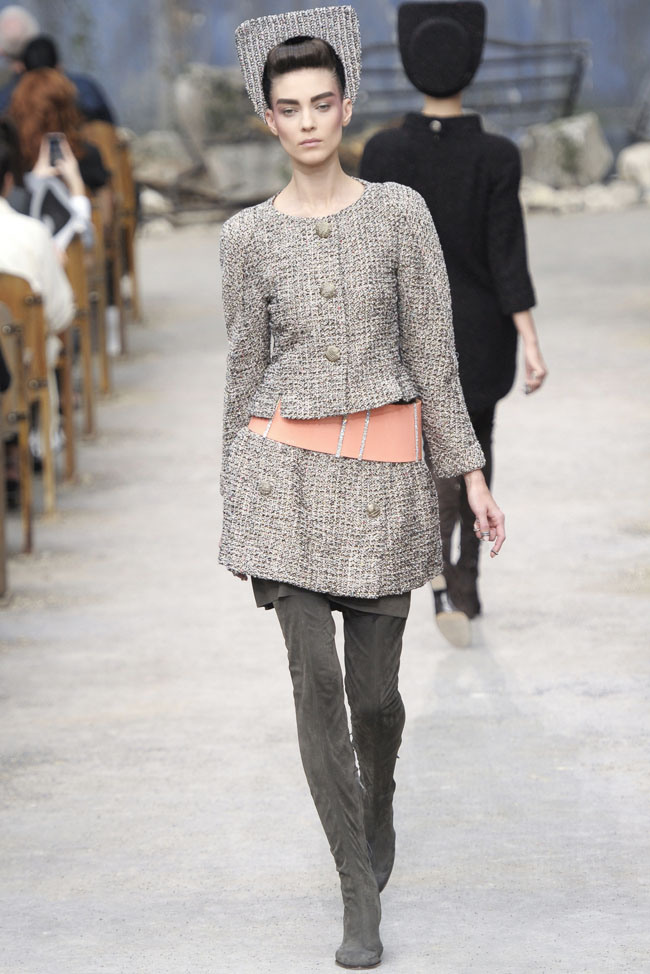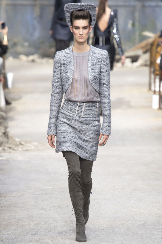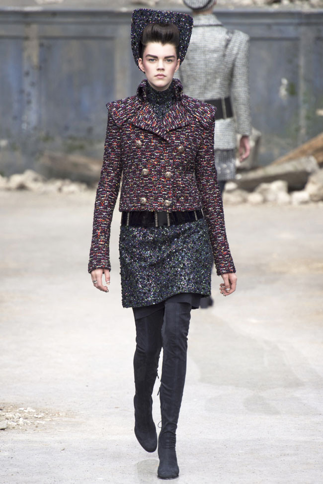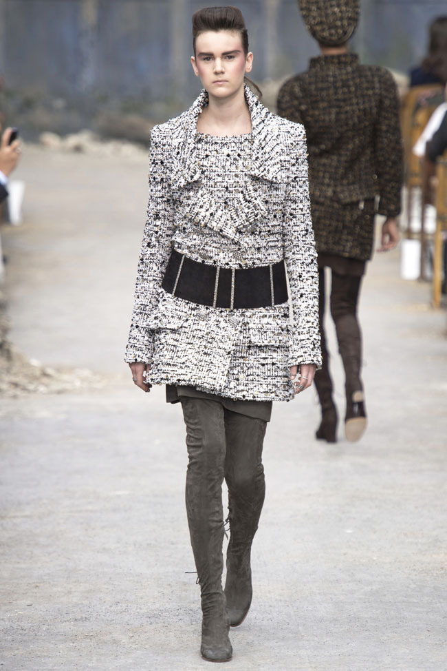 No podía faltar el tweed, que en los primeros looks de la colección se hizo presente en chaquetas y faldas, que sobre capas y capas abrigan el invierno como ninguno. Es refrescante ver una línea que se apropie del frío como lo hizo Chanel en esta temporada, con prendas realmente pensadas para la temporada. Es de esta forma que Lagerfeld vuelve a apostar, de la misma manera que en propuestas anteriores, a las botas altísimas y pantalones por debajo de vestidos y faldas para abrigar el invierno.