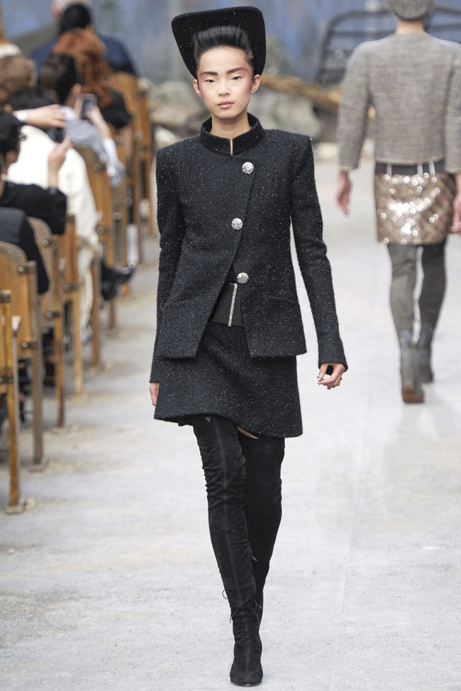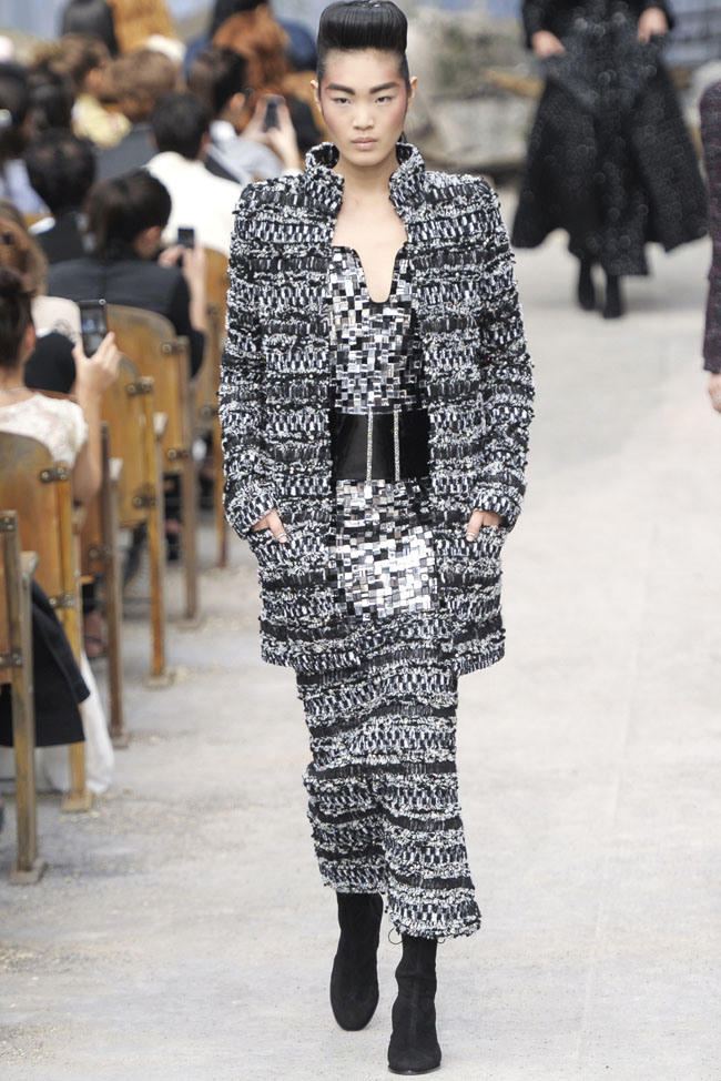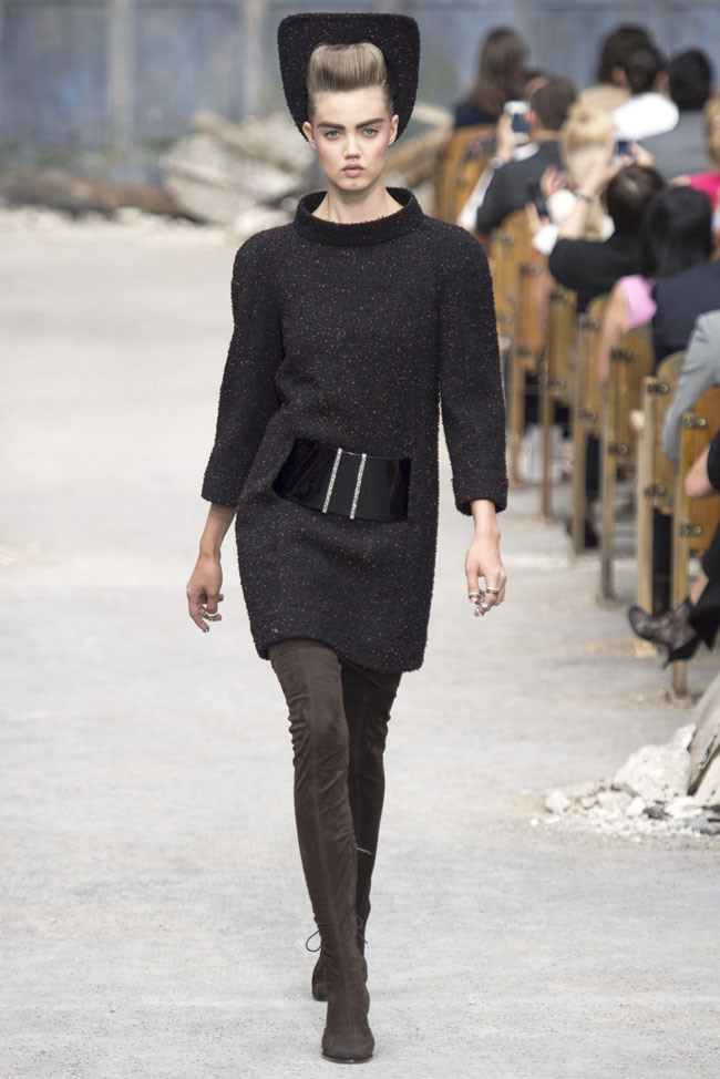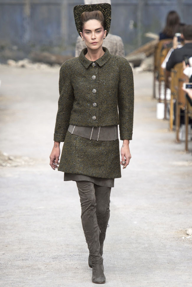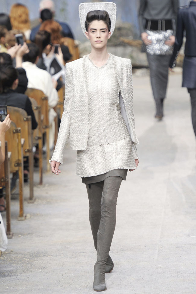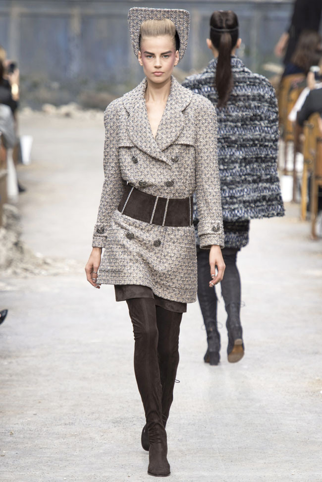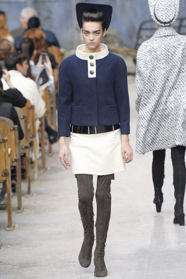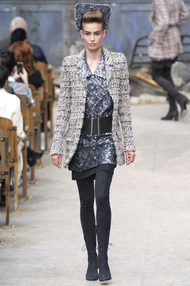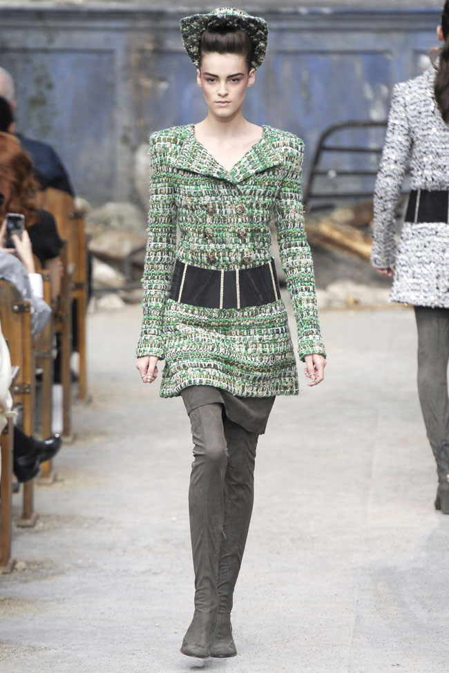 No podía faltar el tweed, que en los primeros looks de la colección se hizo presente en chaquetas y faldas, que sobre capas y capas abrigan el invierno como ninguno. Es refrescante ver una línea que se apropie del frío como lo hizo Chanel en esta temporada, con prendas realmente pensadas para la temporada. Es de esta forma que Lagerfeld vuelve a apostar, de la misma manera que en propuestas anteriores, a las botas altísimas y pantalones por debajo de vestidos y faldas para abrigar el invierno.