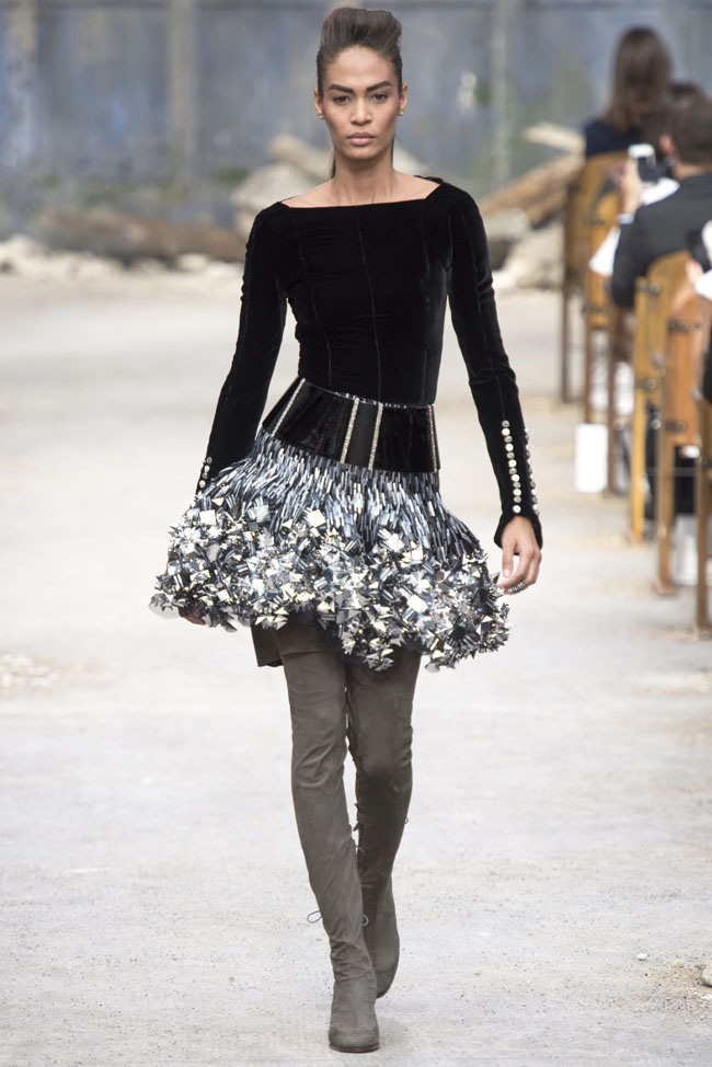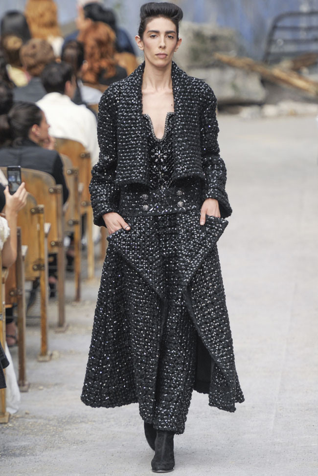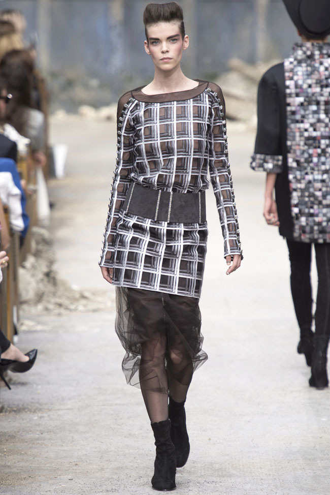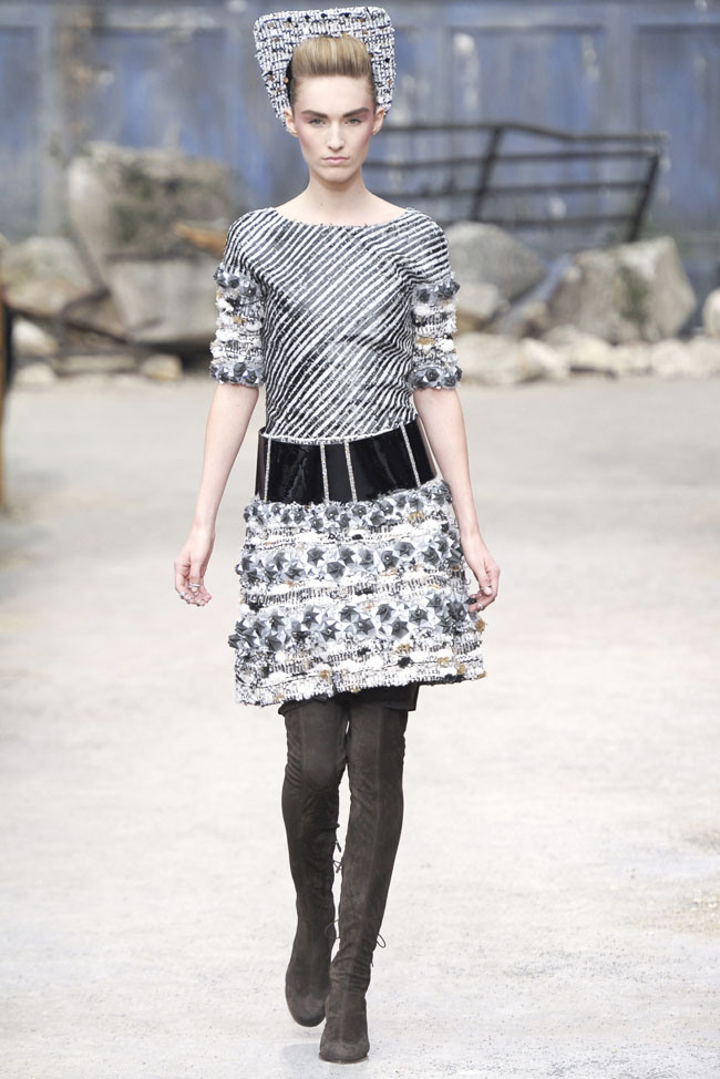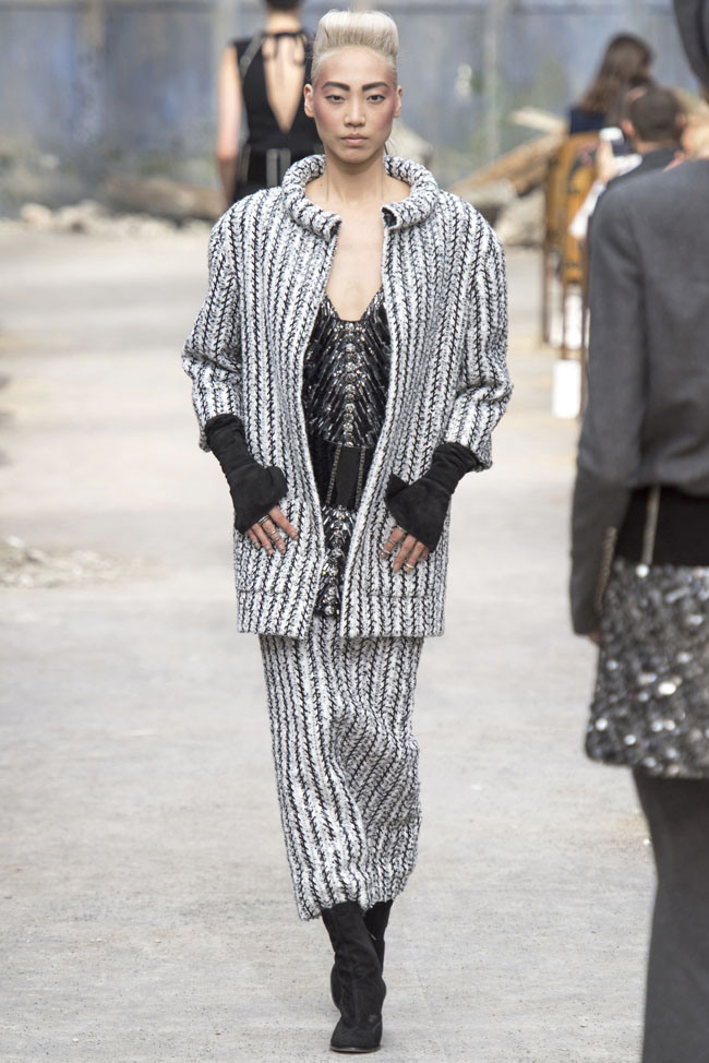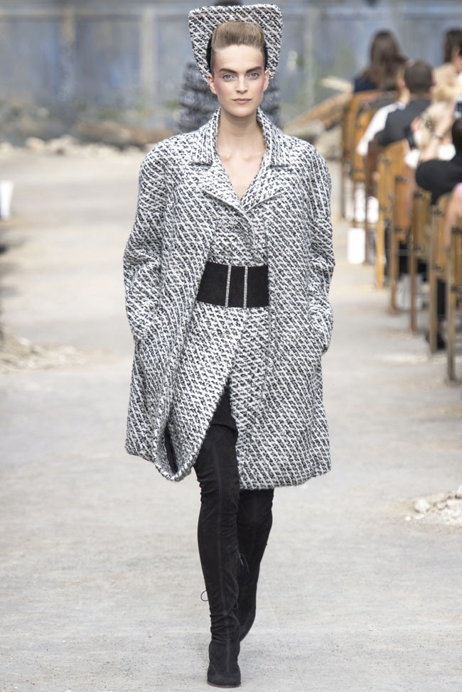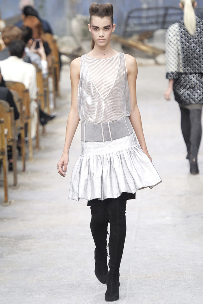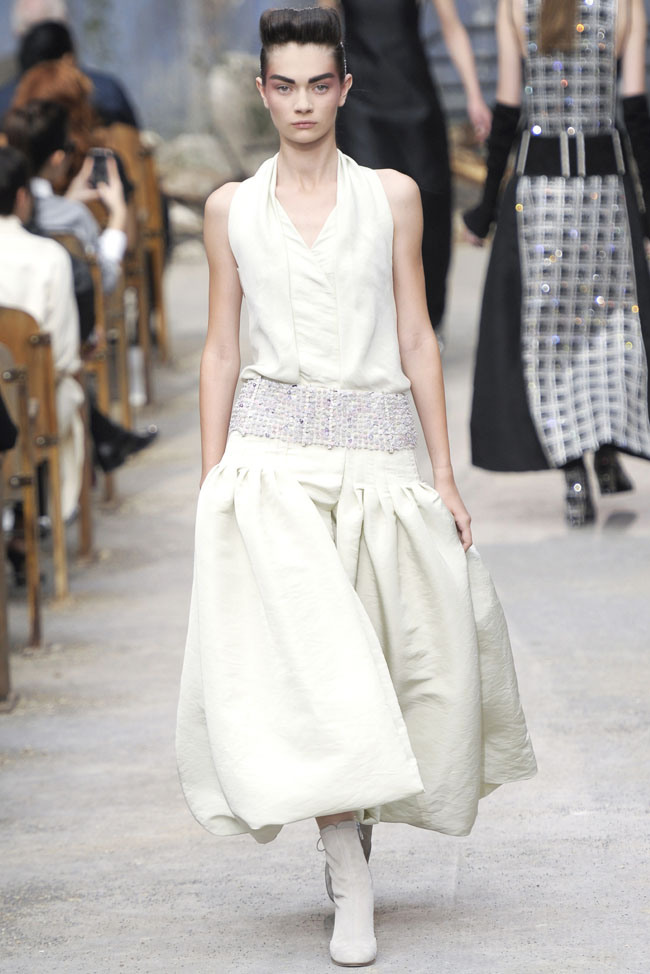 No podía faltar el tweed, que en los primeros looks de la colección se hizo presente en chaquetas y faldas, que sobre capas y capas abrigan el invierno como ninguno. Es refrescante ver una línea que se apropie del frío como lo hizo Chanel en esta temporada, con prendas realmente pensadas para la temporada. Es de esta forma que Lagerfeld vuelve a apostar, de la misma manera que en propuestas anteriores, a las botas altísimas y pantalones por debajo de vestidos y faldas para abrigar el invierno.