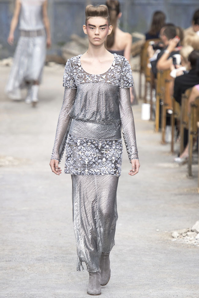 Esta colección brilló, literalmente, con hilos, telas, pailletes y detalles metálicos para que cada uno de los looks tuviera esa sensación de estar confeccionado con pequeños trozos de vidrio, casi como su hubieran sido recuperados luego de la explosión de un cristal. Brillos que no faltaron en cada uno de los anchos cinturones que, a la cadera, marcaron la silueta de la marca para esta temporada, una pieza polémica que no logró funcionar en todos los looks aunque sí consiguió darle aires de uniforme, como azafatas de un futuro ideal.