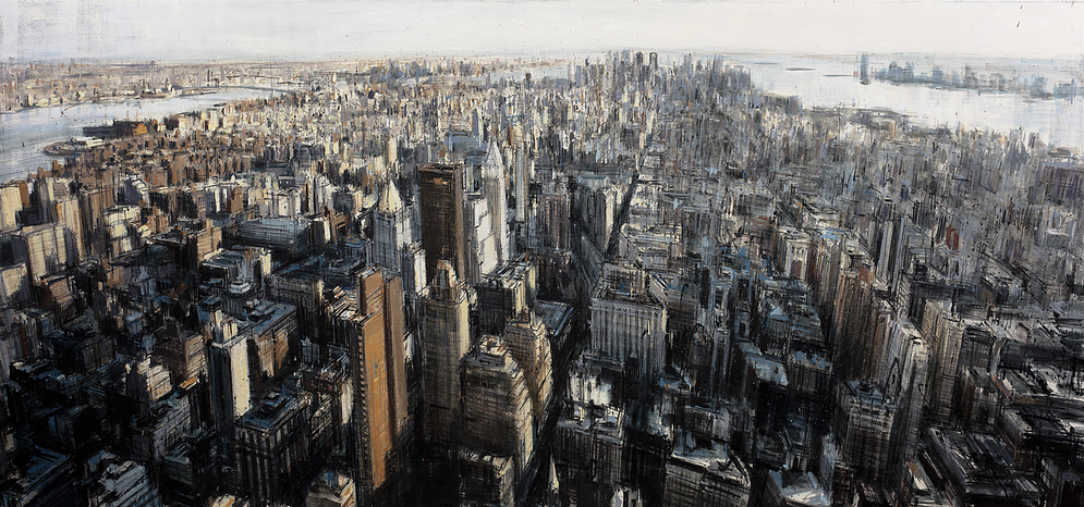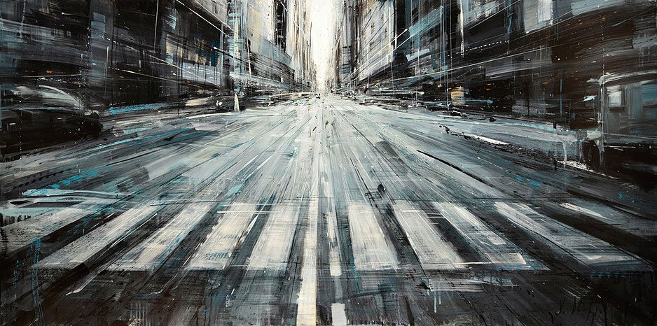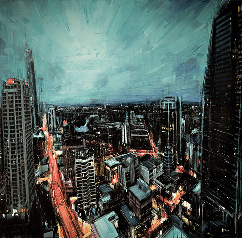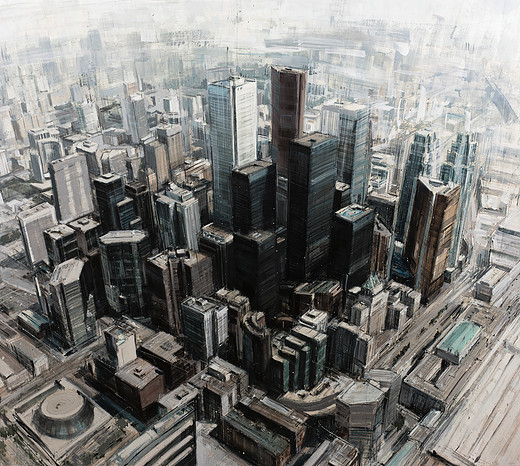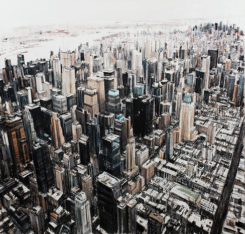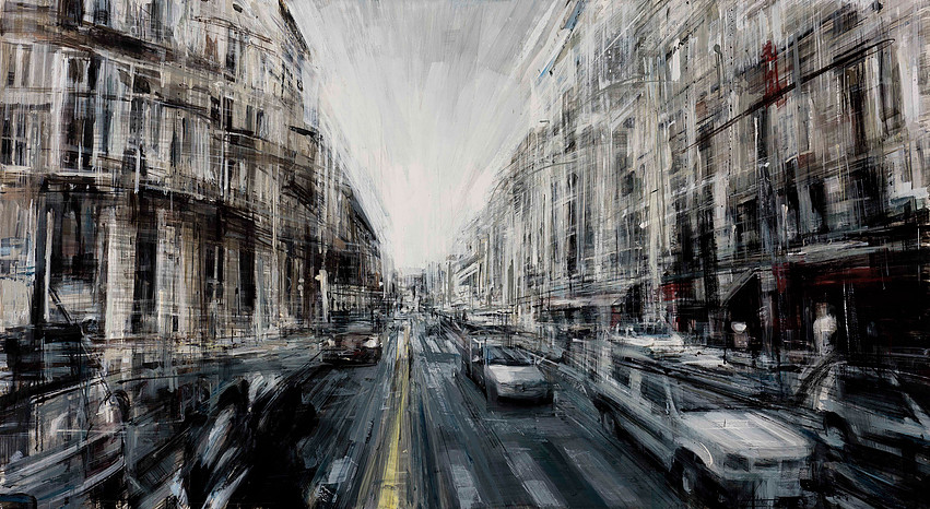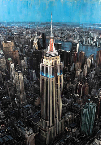 El artista tiene un método de pinceladas rápidas y dinámicas y de esta forma reescribe los edificios y rascacielos de las ciudades, destacado la verticalidad de los mismos.