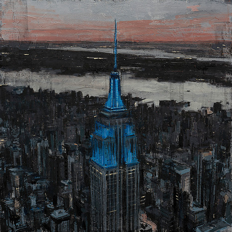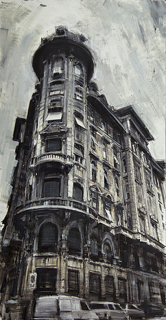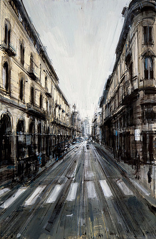 Sus trabajos hechos al óleo nos muestran las distintas ciudades que recorre con una visión solitaria y nostálgica.