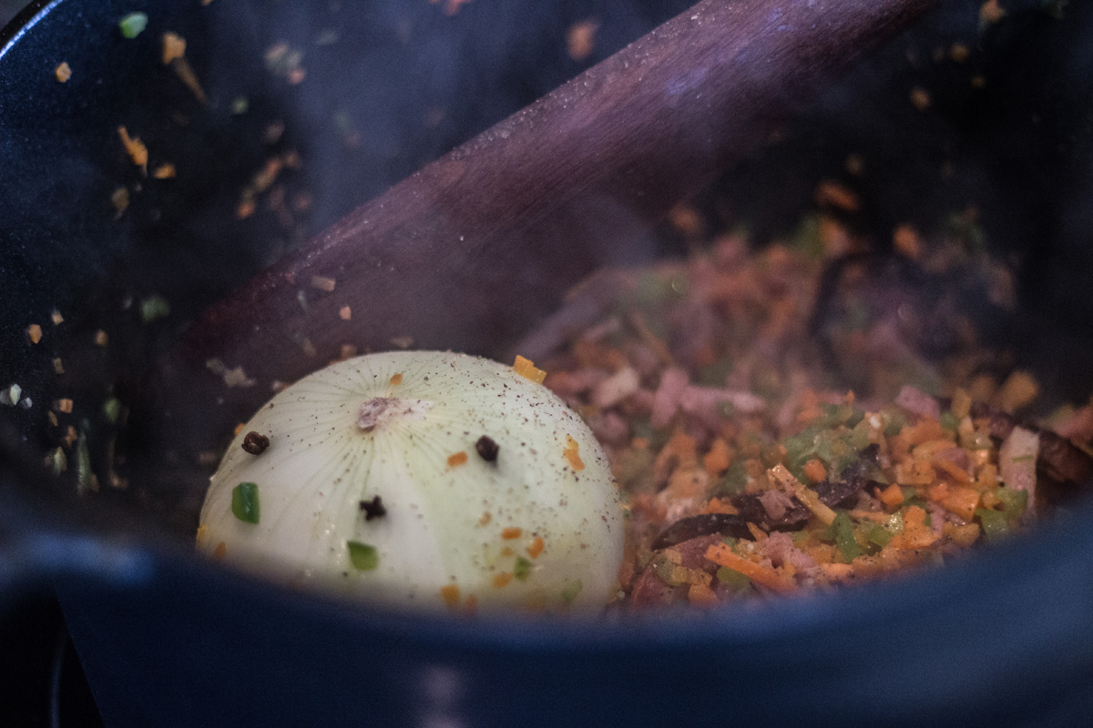 - Insertá los clavos de olor en la cebolla entera y pelada.