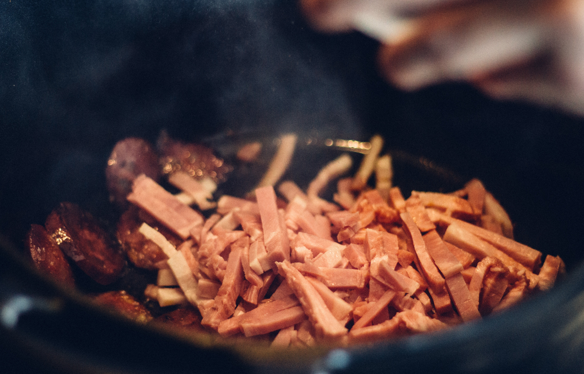 En una olla con aceite, salteá a fuego medio las ruedas de chorizo. Agregale los bastones de panceta.