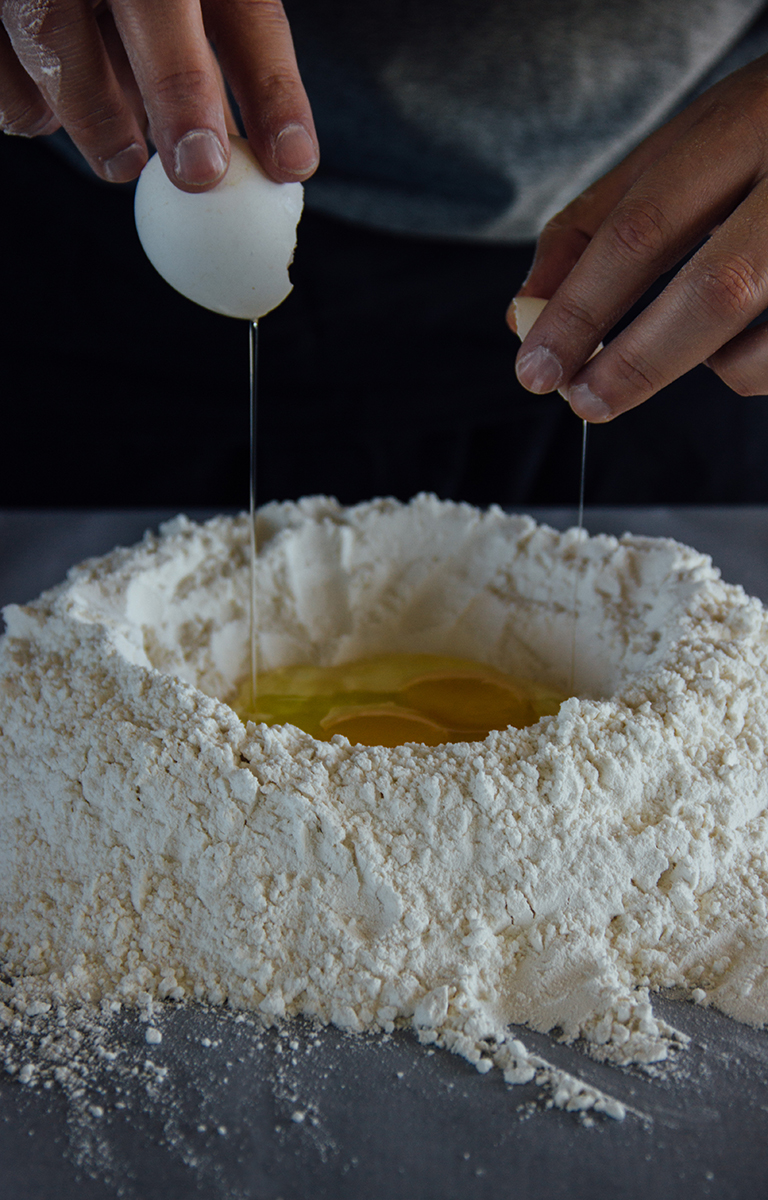 En otro, mezclá el huevo, el aceite, la sal y el agua. Hacé un volcán con la harina y volcá la preparación anterior en el medio, mezclando bien (a mano o con el gancho de la batidora). Amasá durante unos 10 minutos sobre una superficie enharinada (unos 5 minutos si lo estás haciendo con la batidora).
