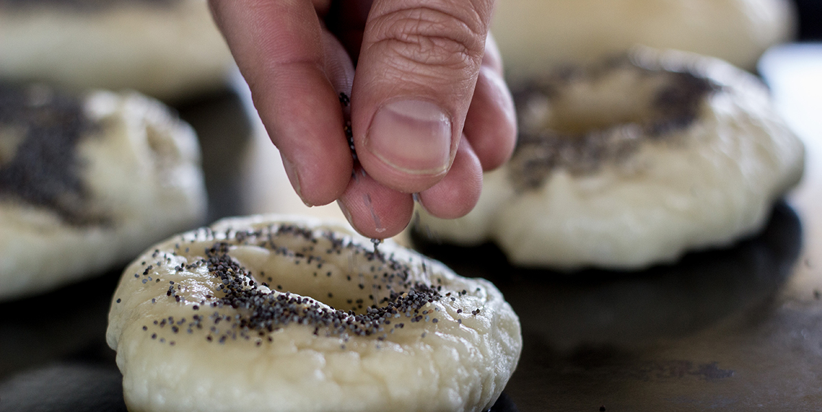 Dejalos secar sobre una rejilla unos 5 minutos y luego pasalos a una bandeja de horno. Pintalos con un huevo batido y espolvoreá por encima las semillas de amapola.