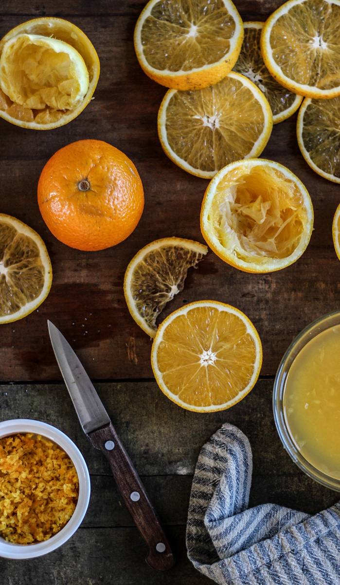 - Rallá la cáscara de una de las naranjas, y luego exprimida. Reservá.