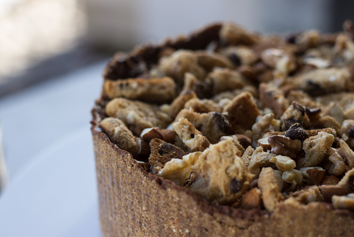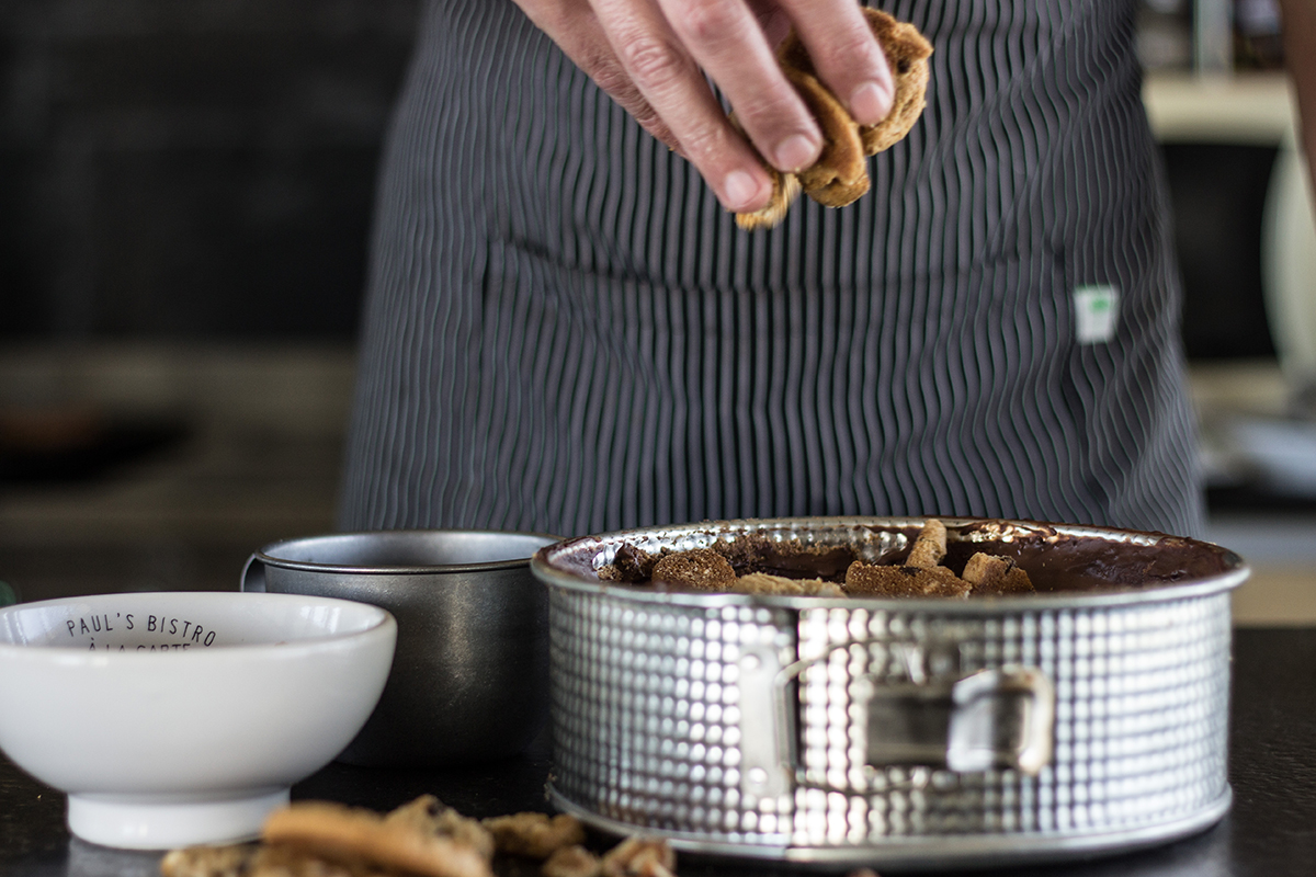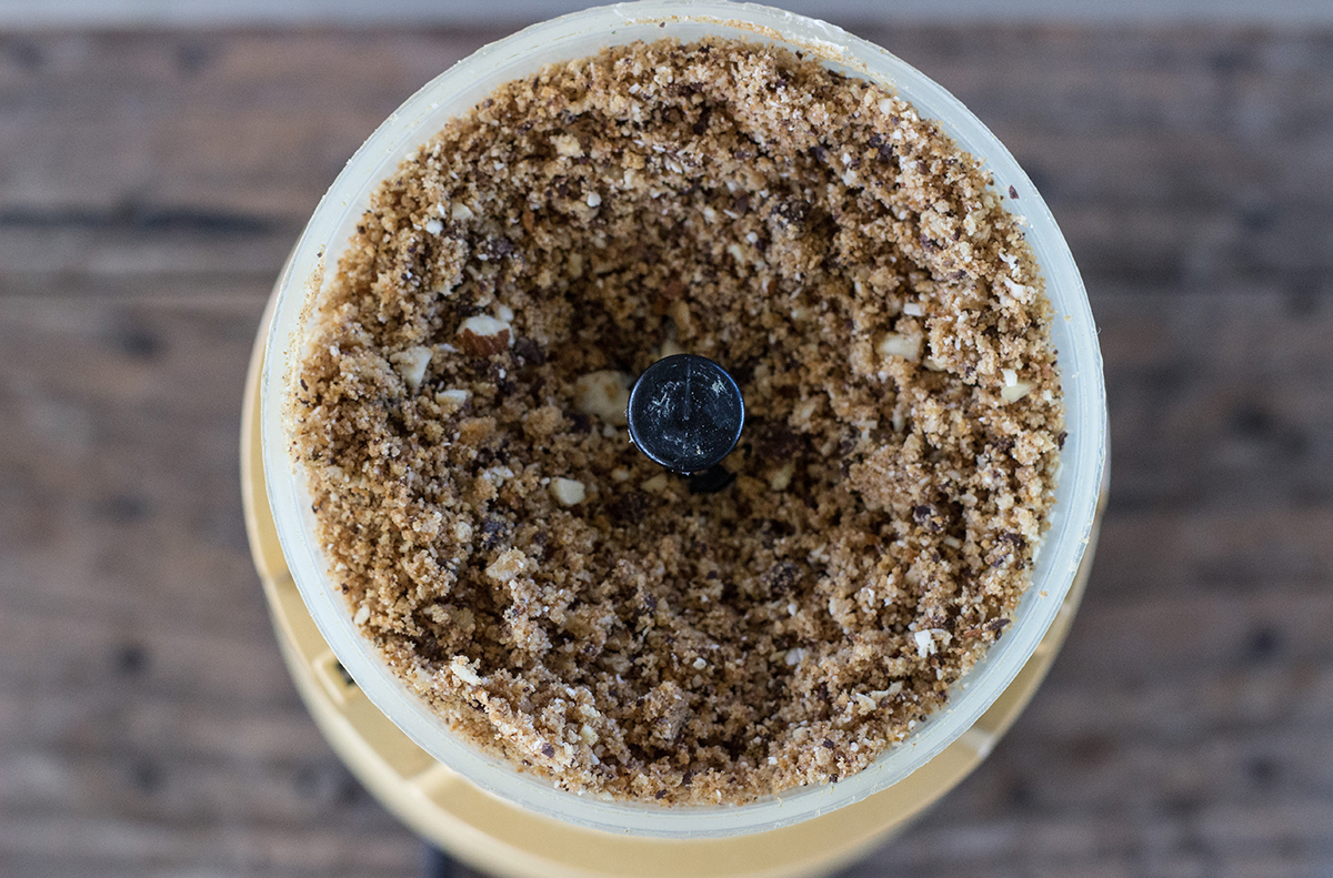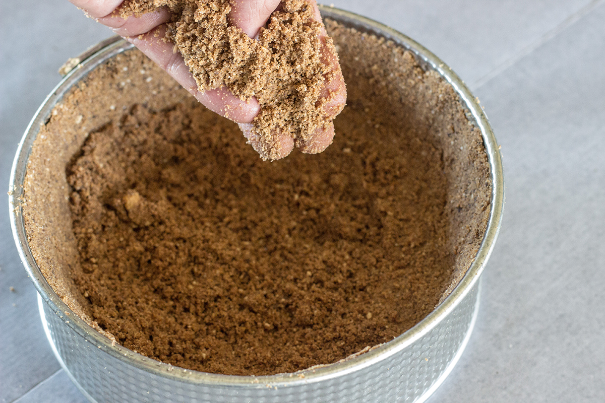 Arrancá precalentando el horno a 180 grados. Mientras, triturá el contenido de tres paquetes de galletitas en el procesador, junto con una cucharada de manteca y 50 gramos de avellanas o maní, hasta que quede una mezcla pareja y consistente.