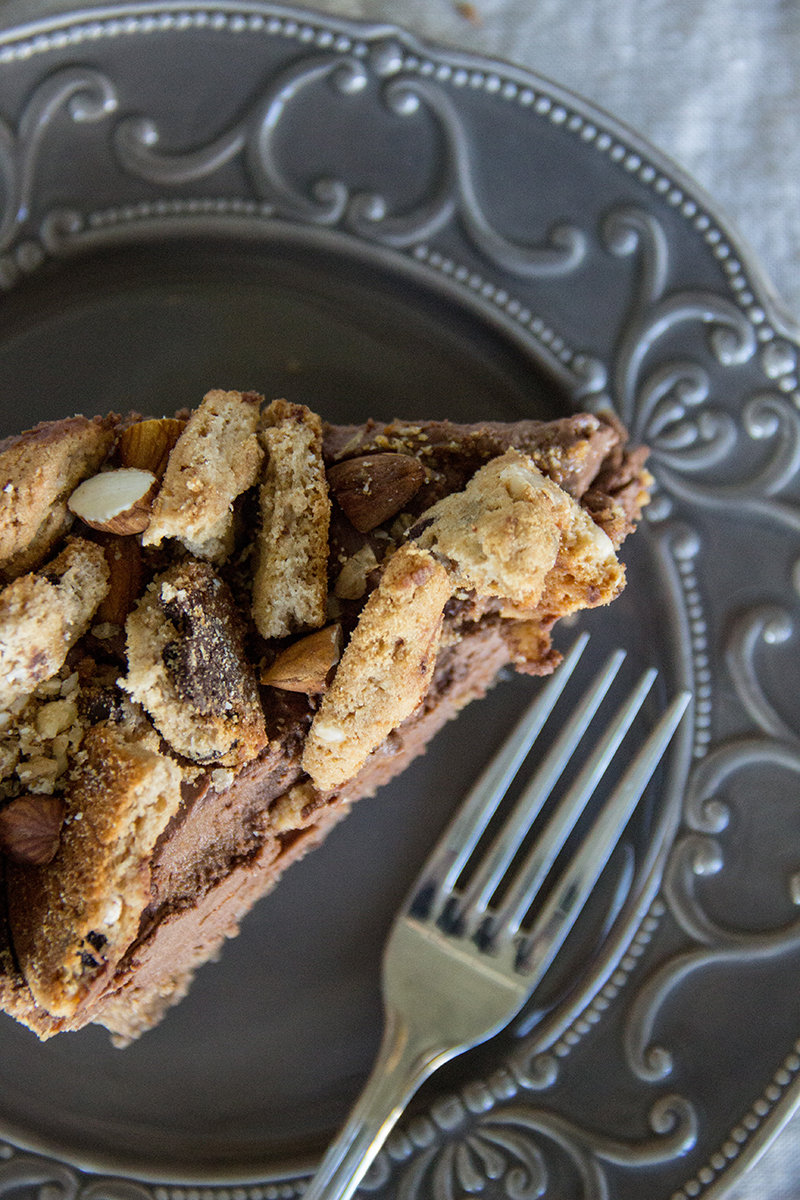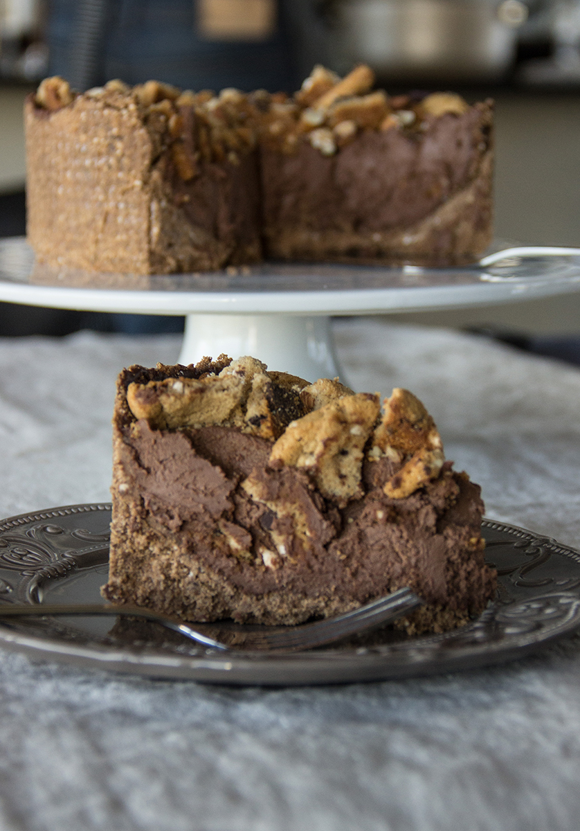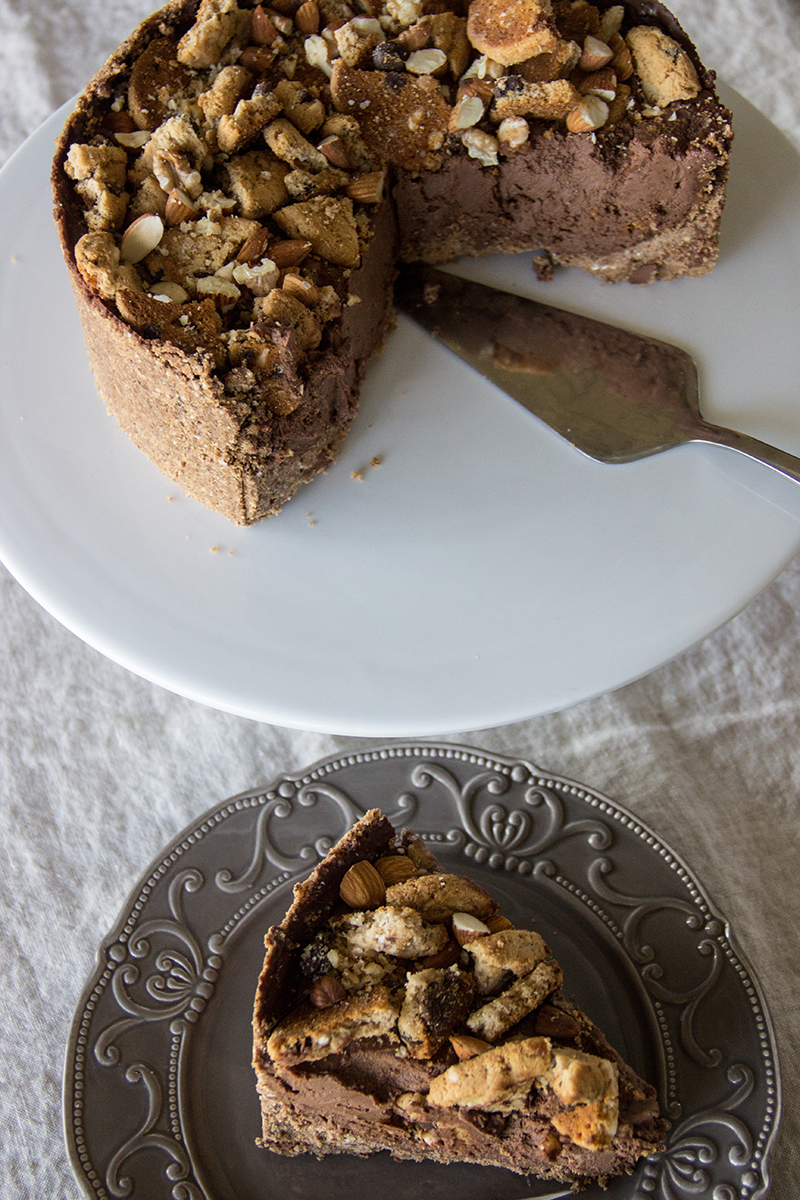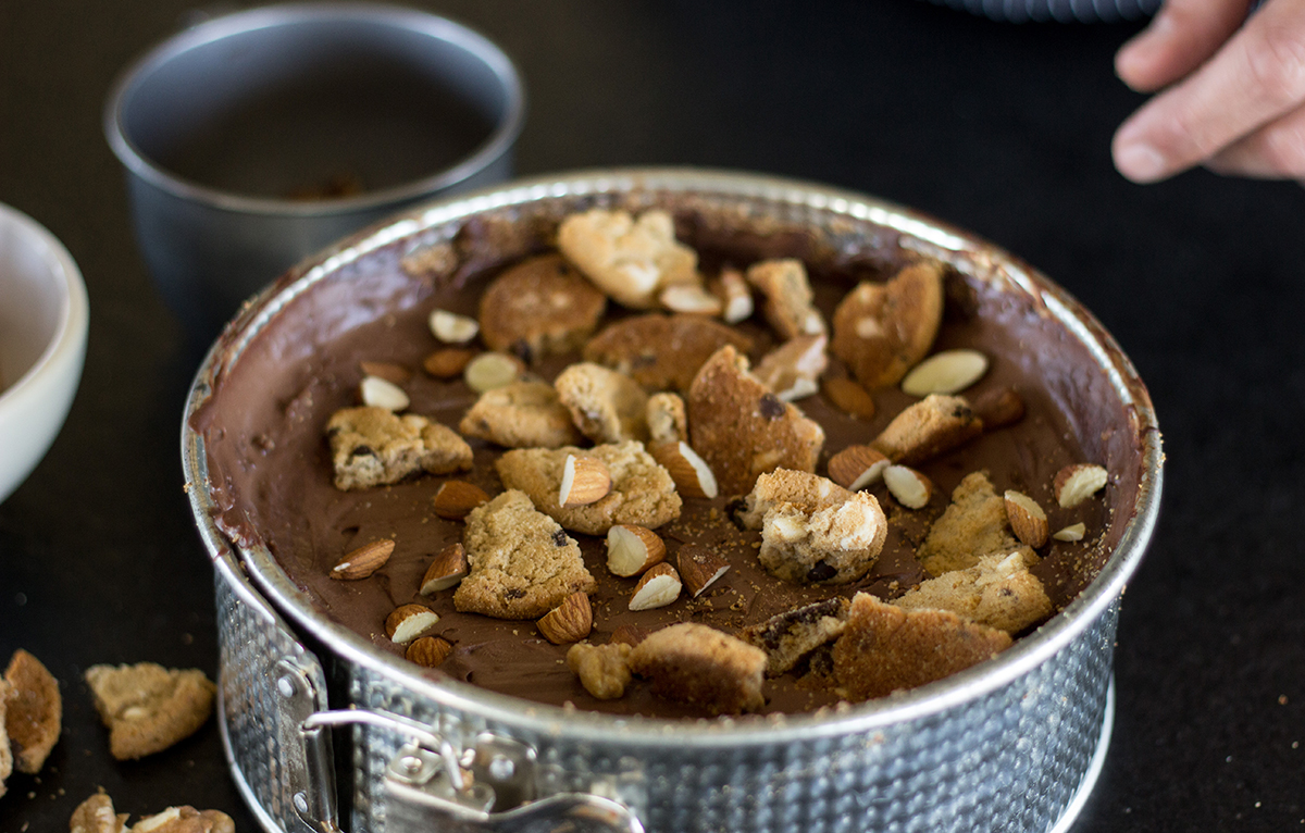 Derretí el chocolate en ½ vaso de agua o leche, mezclalo con el queso crema hasta que quede uniforme y sin grumos. Sumalo al molde previamente horneado, y decorá la parte de arriba con las galletitas del paquete restante picadas en trozos grandes.