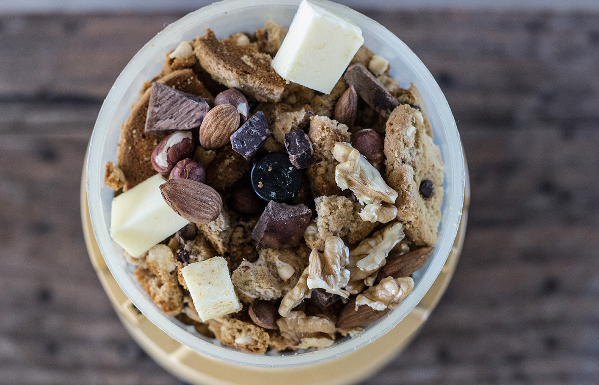 Agregale también los 50 gramos restantes de avellanas o maní, hundiéndolos un poco en la mezcla.