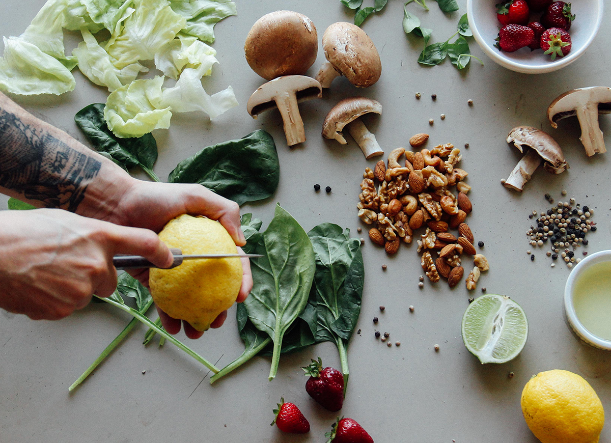 Lavá y secá todas las frutas y verduras (menos los champignones). Si querés, con la ayuda de un cuchillo podés retirarle el tallo a todas las hojas verdes. Si no, corta las hojas con la mano o un cuchillo de cerámica para que no se oxiden y reservalas.
