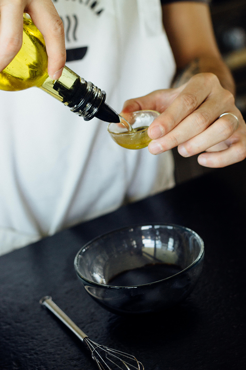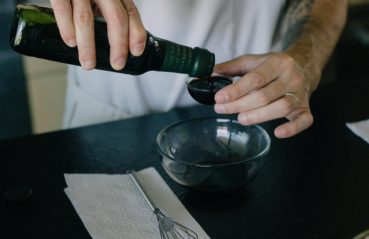 La vinagreta es una emulsión que combina 3 partes de aceite (preferiblmente oliva) y una parte de vinagre. Al vinagre (en esta receta usamos aceto balsámico) se le van agregando el resto de los ingredientes: aceite de oliva, miel, curry (el que quieras, para darle un gusto más especiado), sal y pimienta. Se pueden agregar primero los secos, la miel, e ir incorporando el aceite en forma de hilo. La idea es que quede una salsa de consistencia espesa y de sabor agridulce. Cuando esté a tu gusto, sumala a la ensalada.
