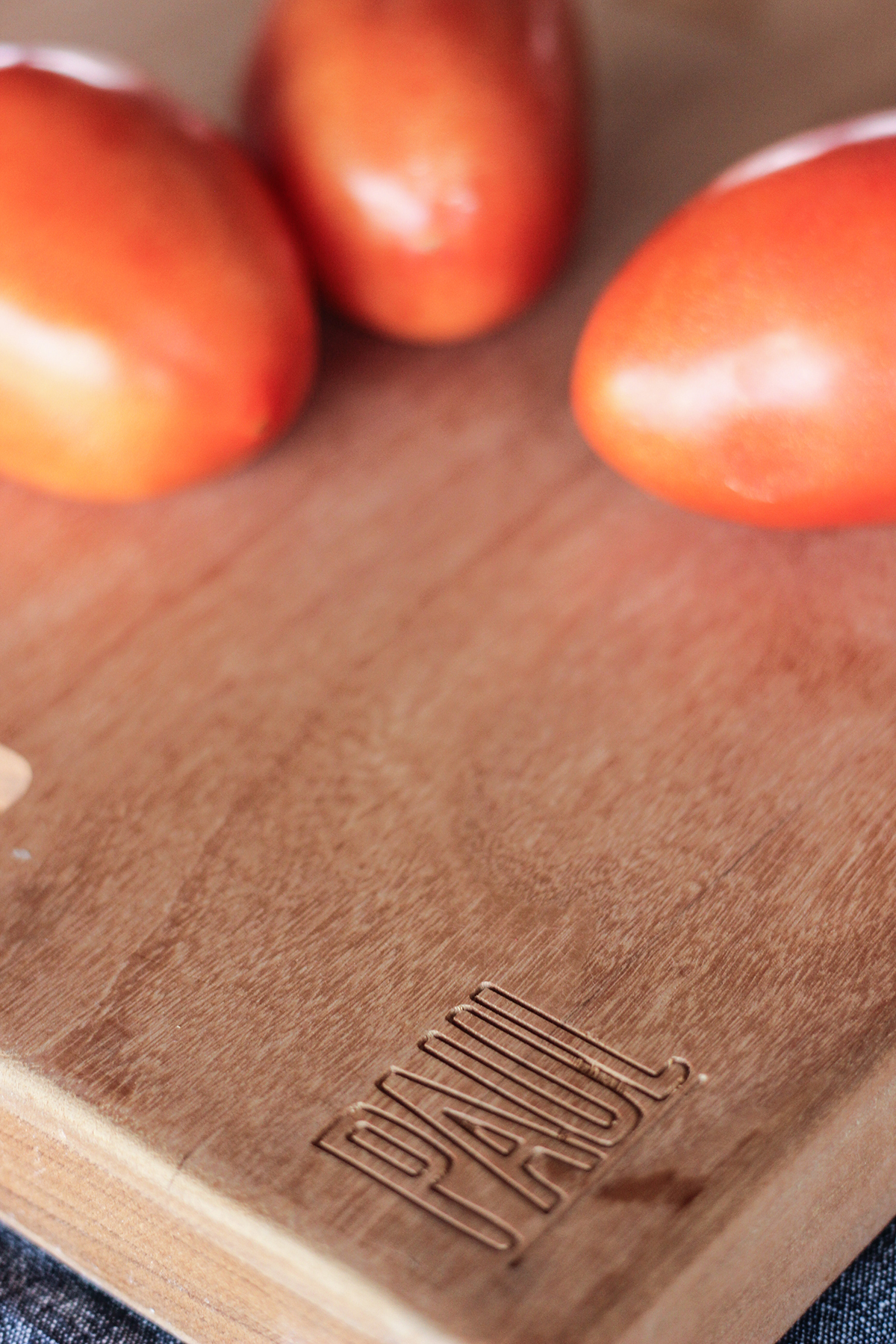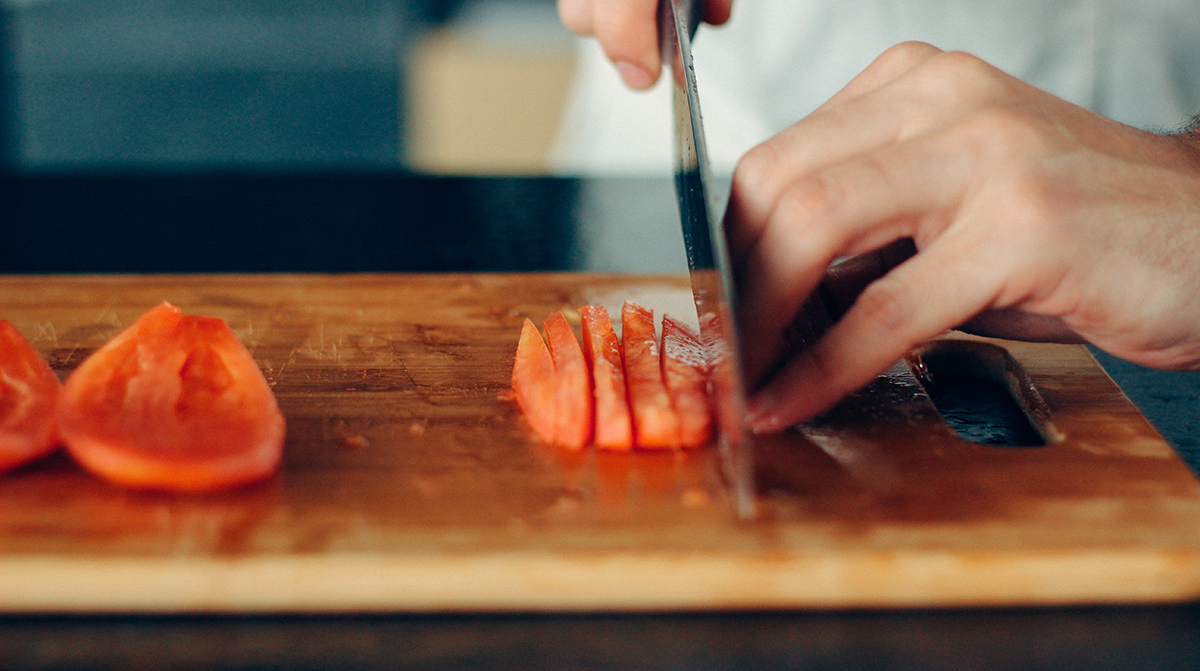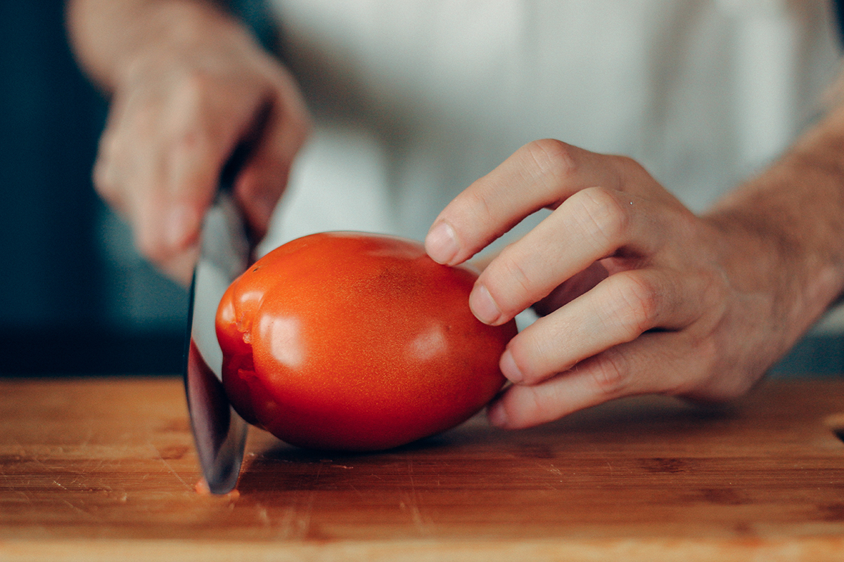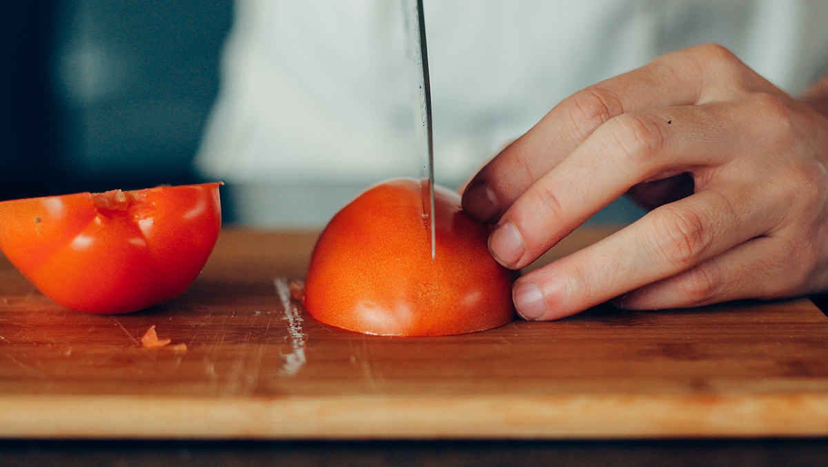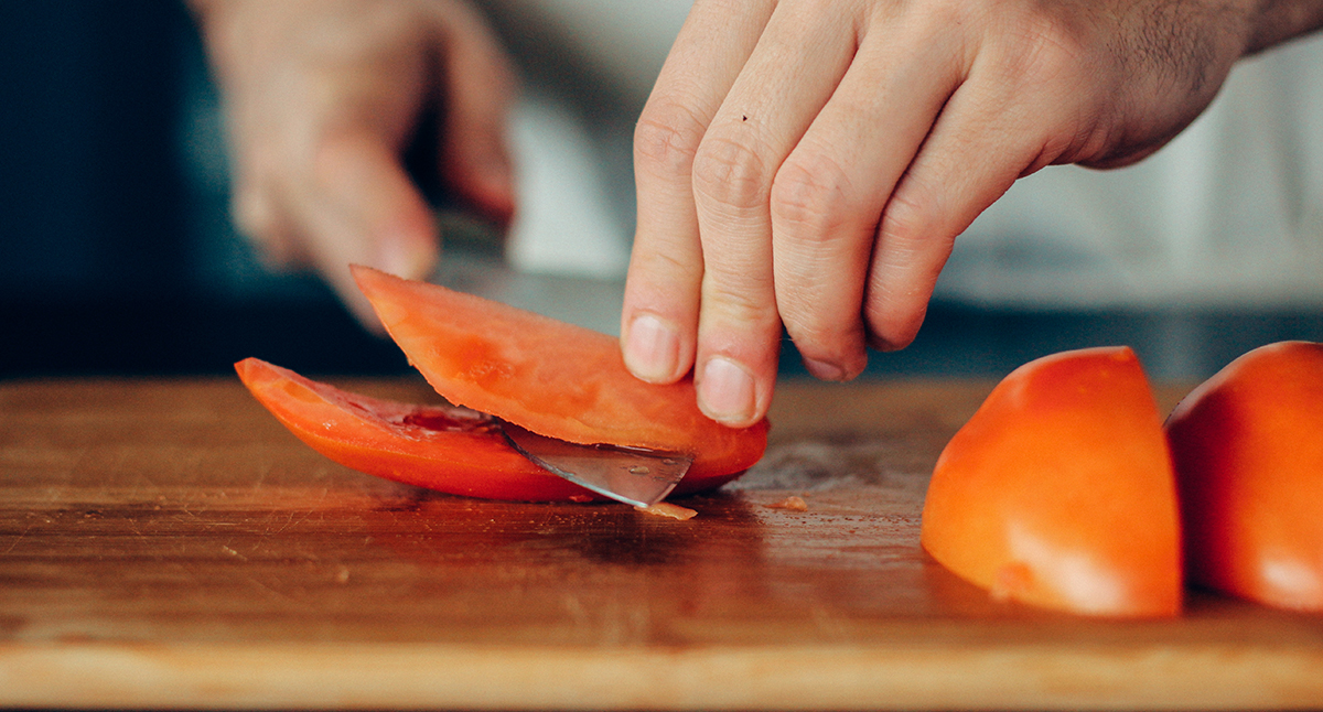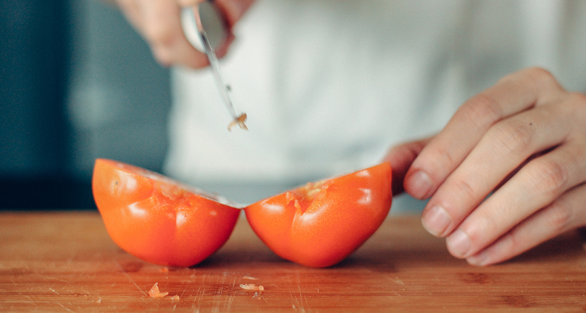 Cortá el tomate en cuartos, sacale la pulpa y aplaná cada cuarto con la mano. A partir de ahí, cortá bastones de tomate y luego hacele cortes transversales para sacar los cubos de forma más sencilla.